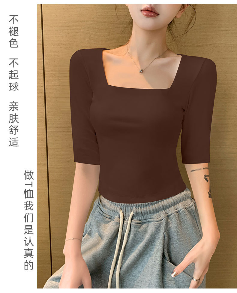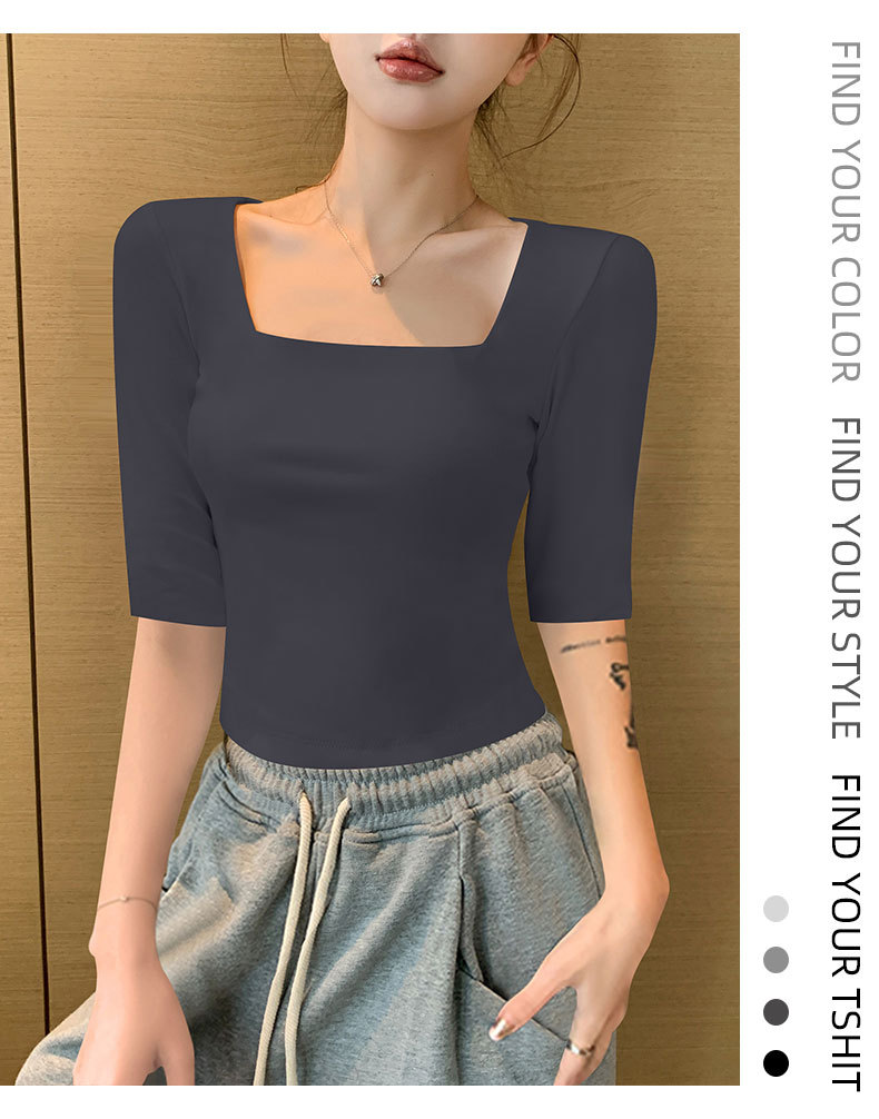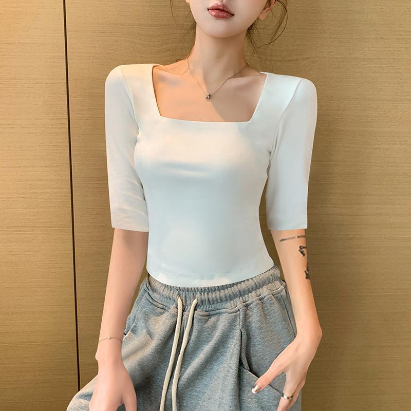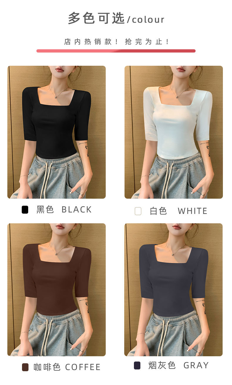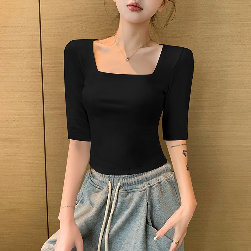 여성용 블랙 스퀘어 넥 반팔 티셔츠 2025 뉴 여름 스타일 슬림핏 오른쪽 어깨 로우 넥 반팔 5부 소매 탑스토어 가기