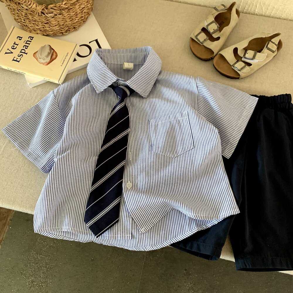 어린이 의류 어린이 여름 의류 소년 셔츠 세트 2025 여름 중대형 어린이 줄무늬 셔츠 반바지 용 새 투피스 세트스토어 가기