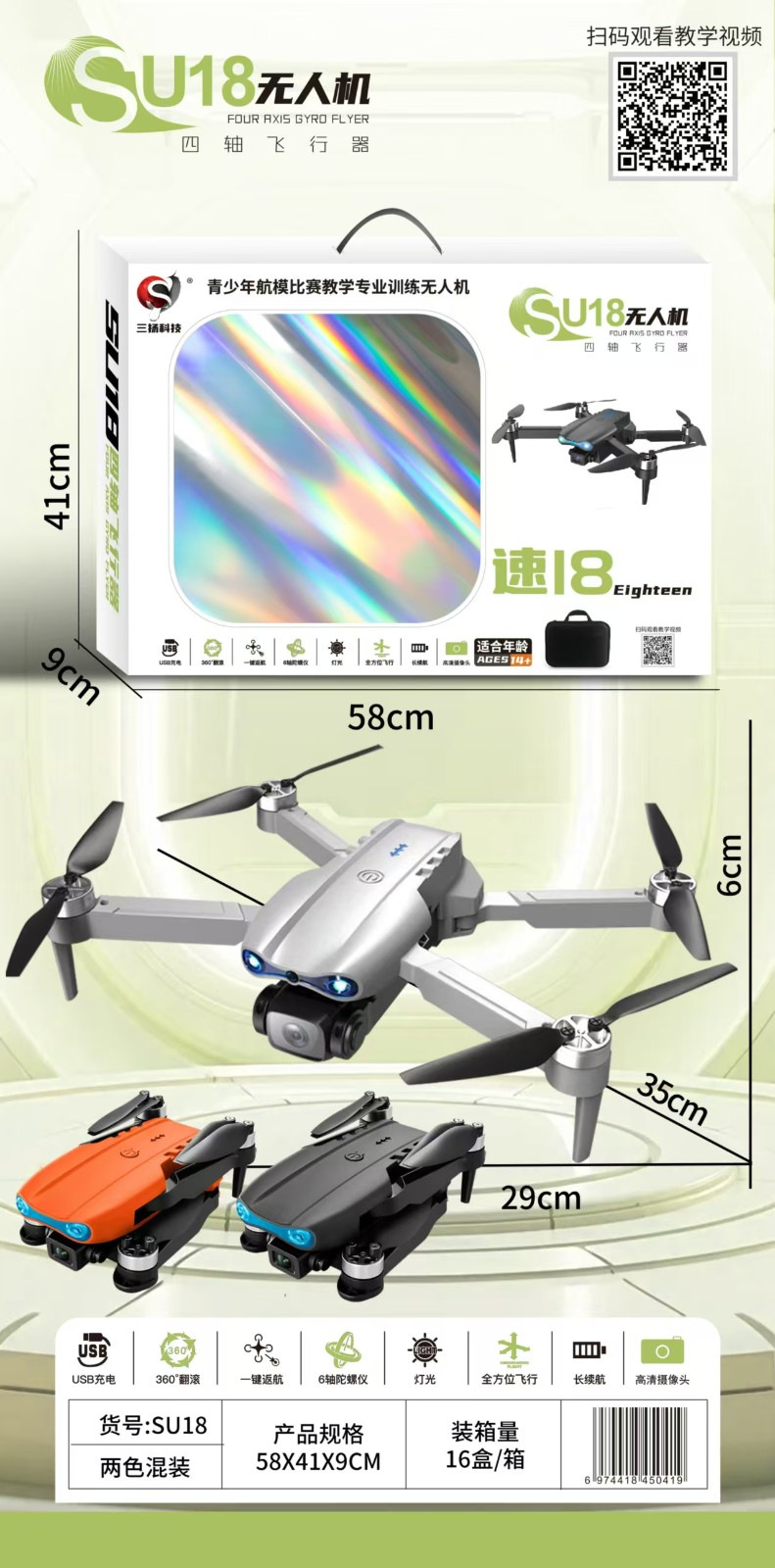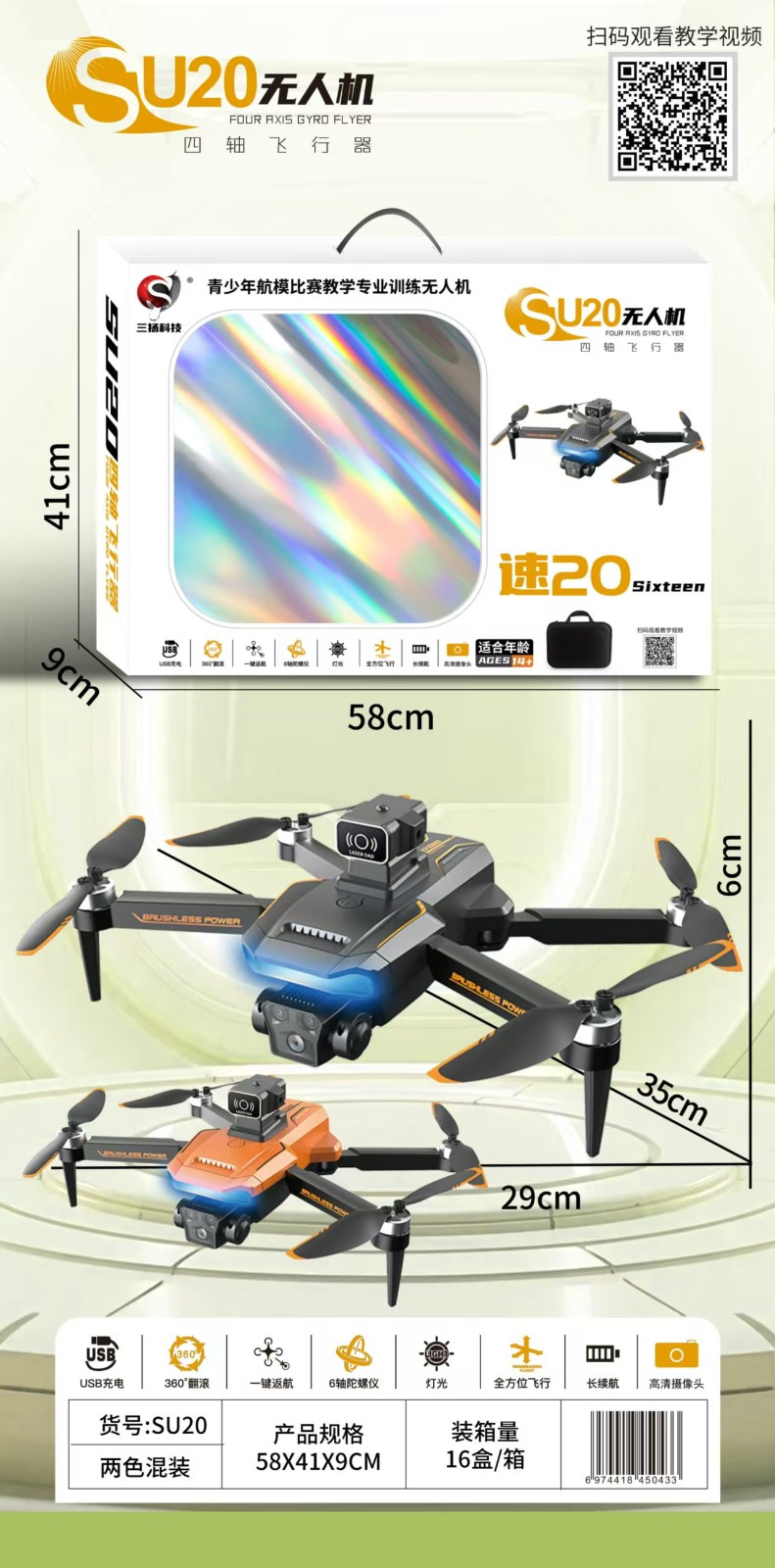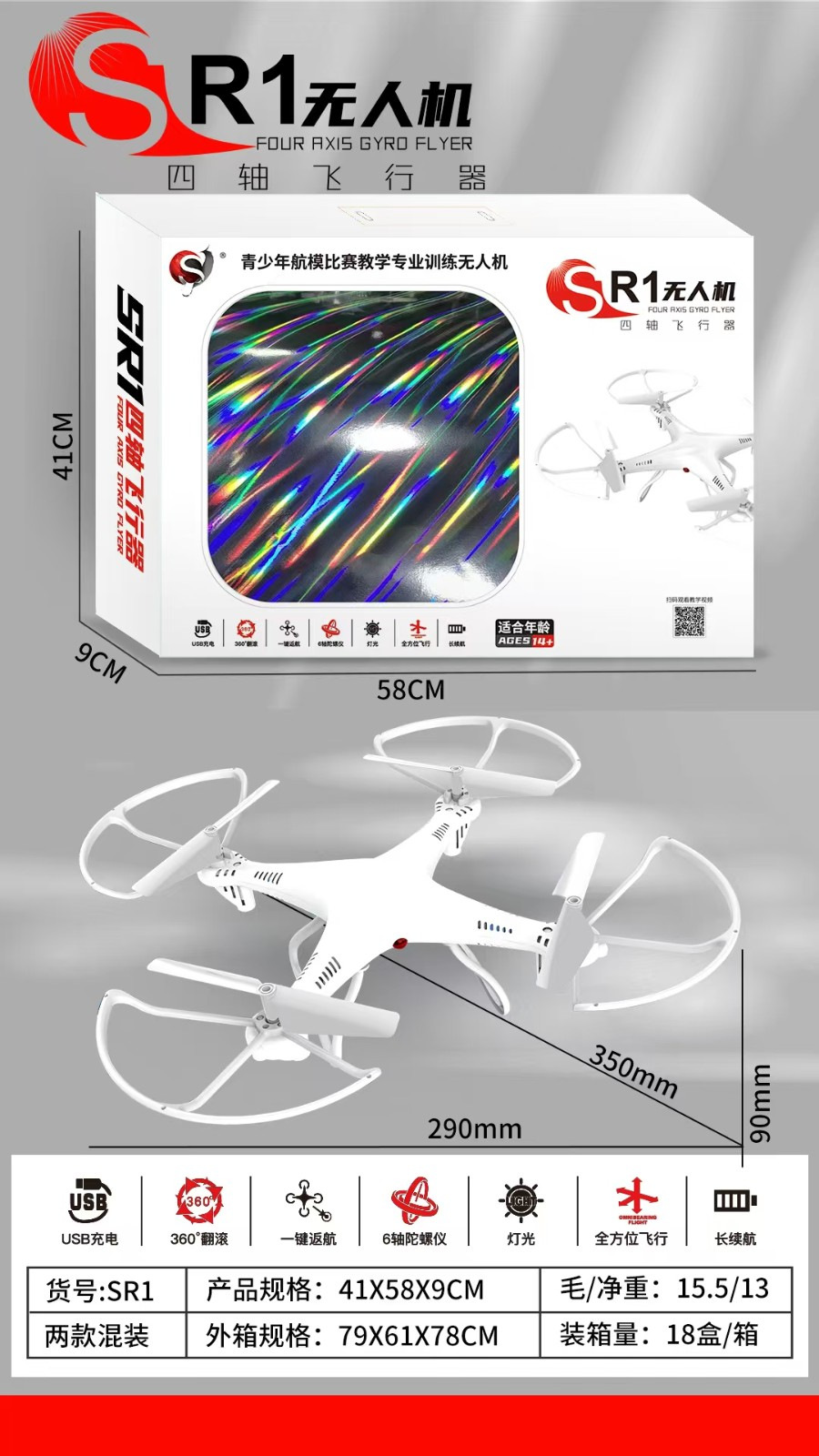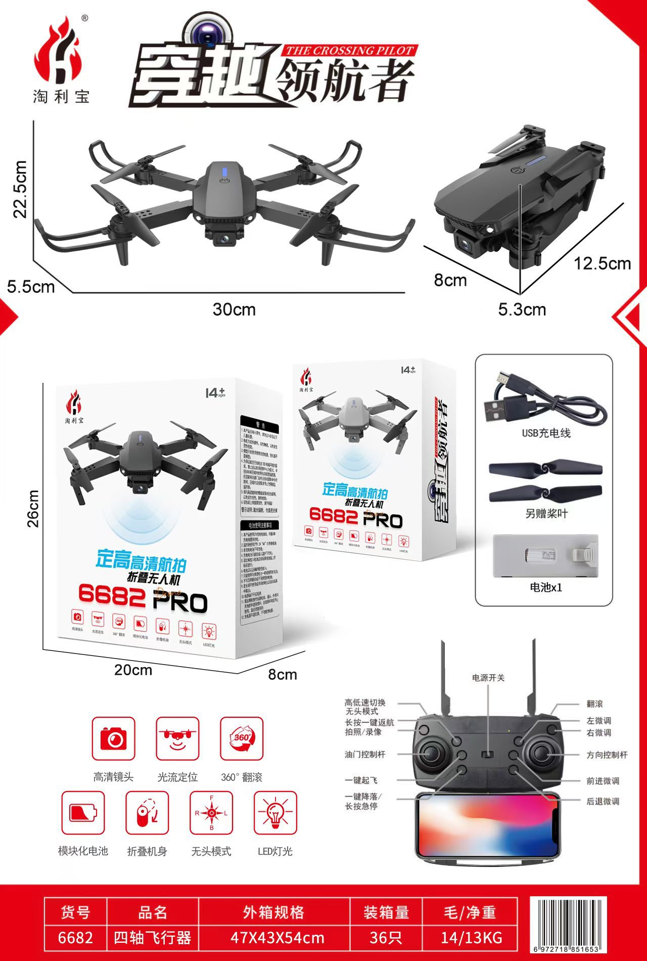 产品功能:360°翻滚、一键返航、灯光