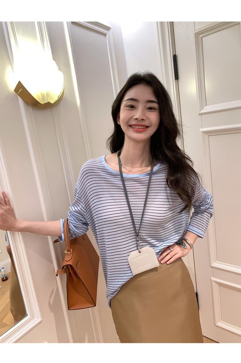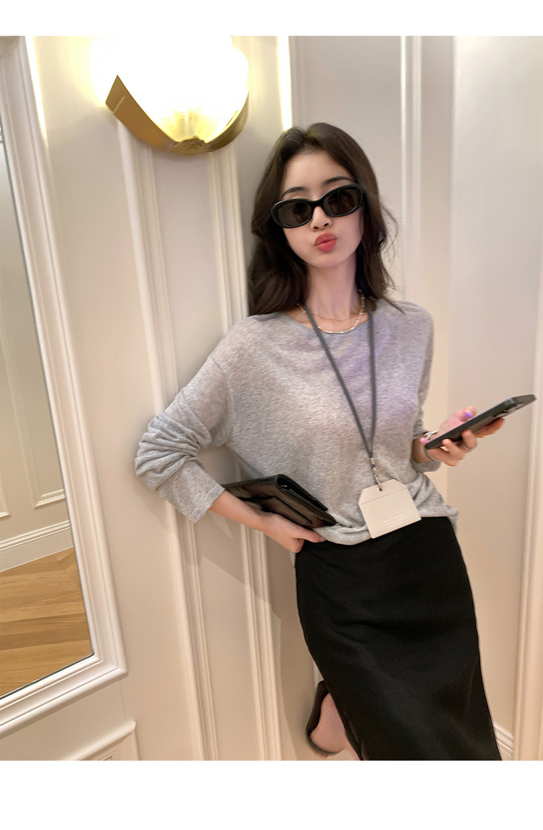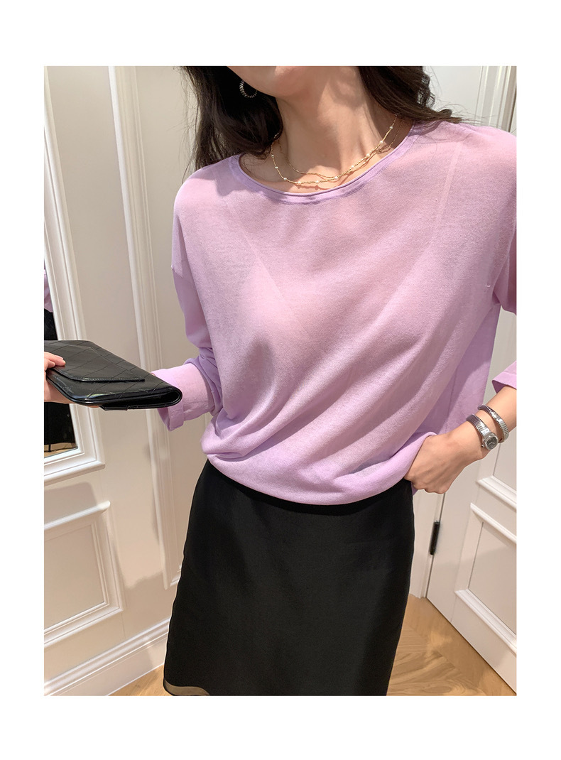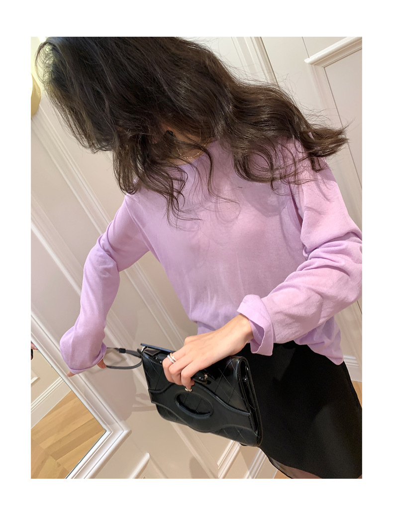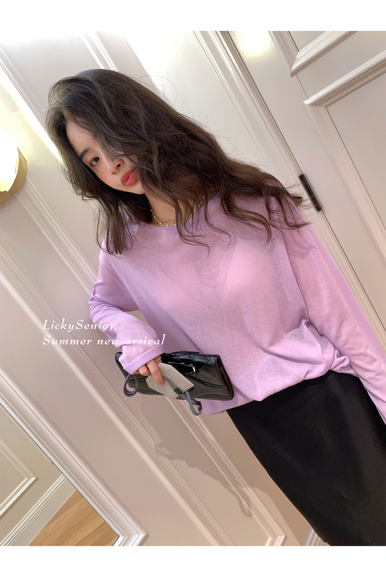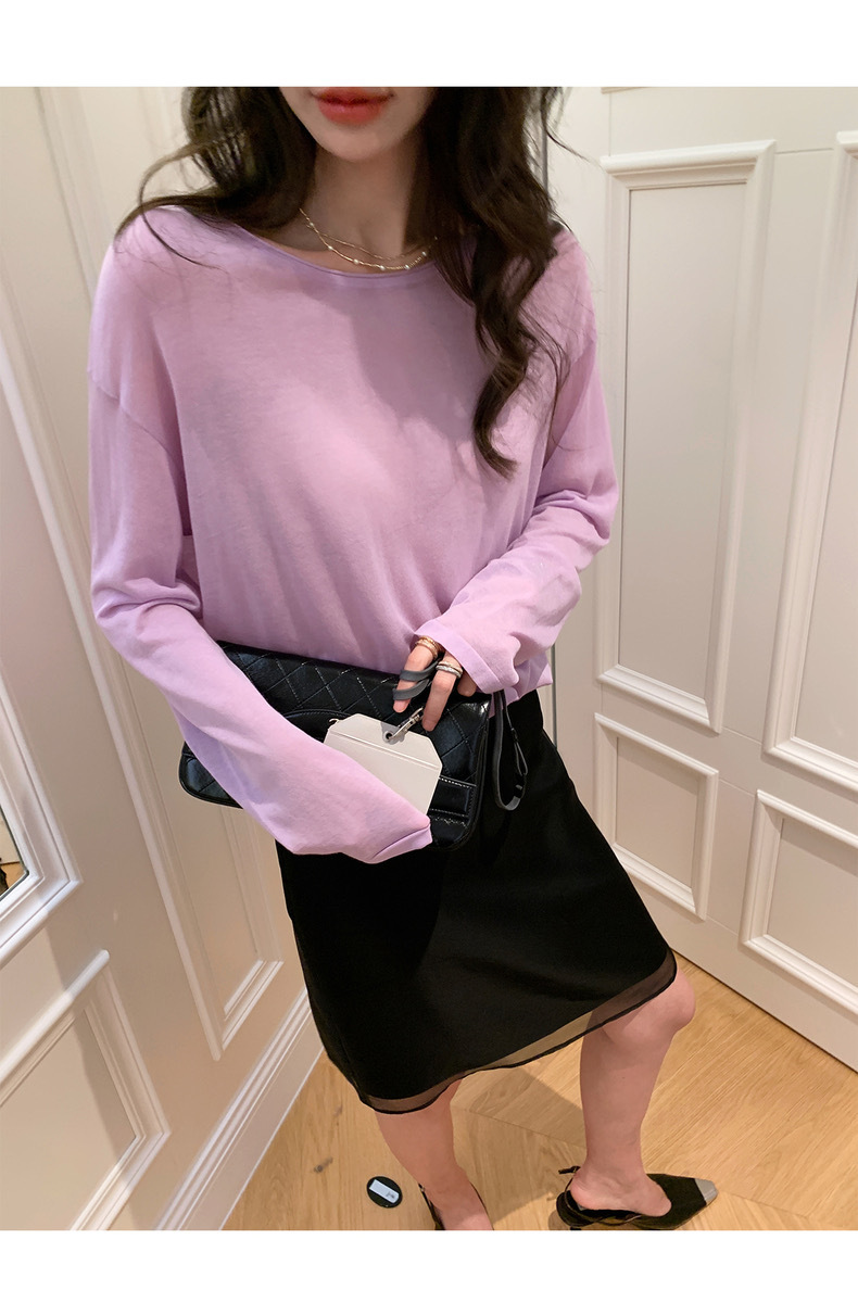 한국식 콘트라스트 텐셀 니트 셔츠 여성용 긴팔 티셔츠 느슨한 얇은 마이크로 투명 종이 셔츠