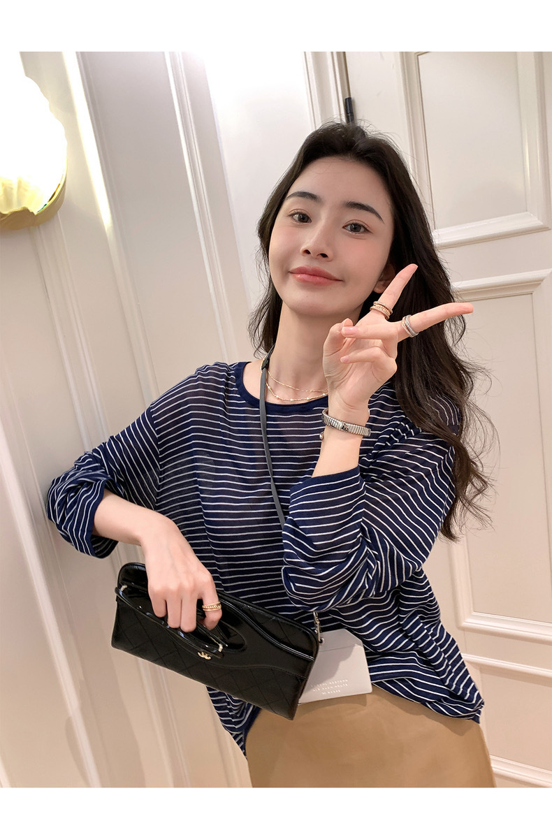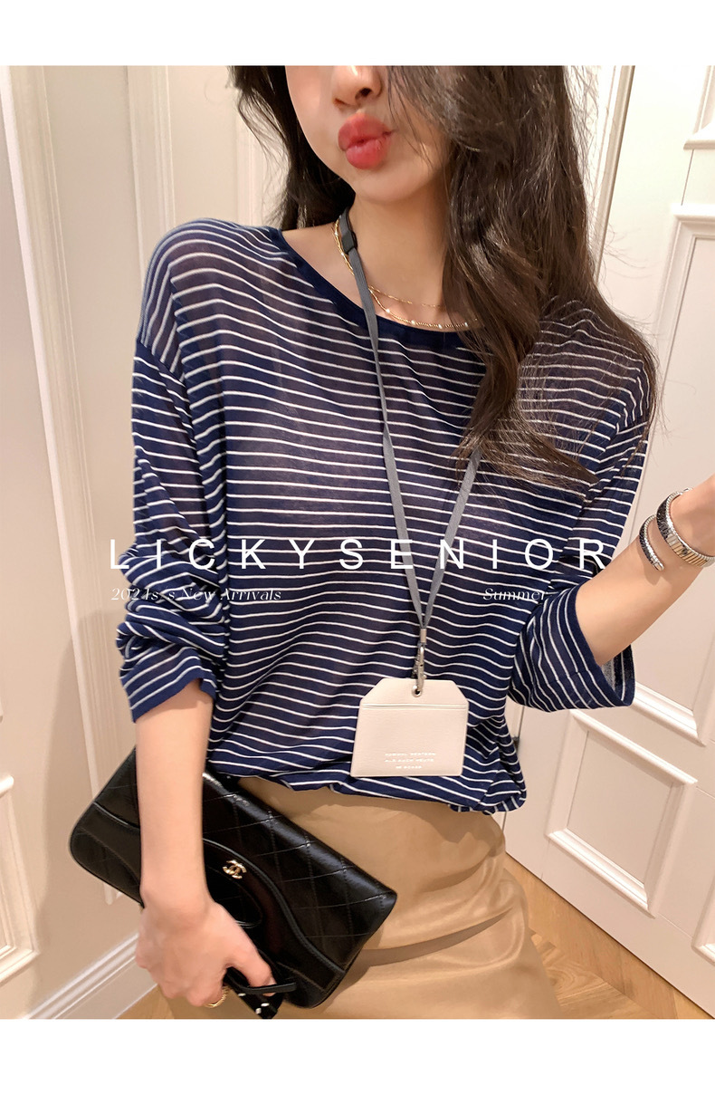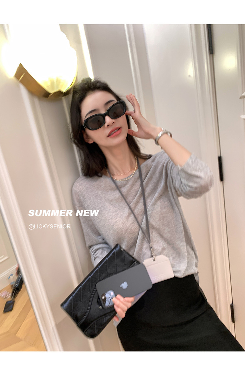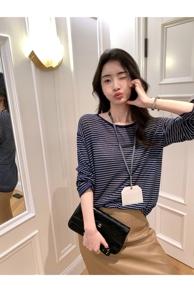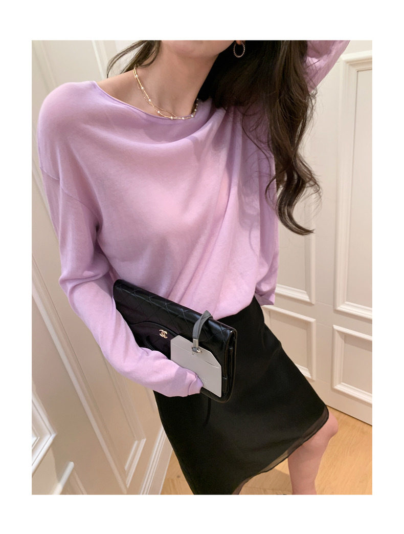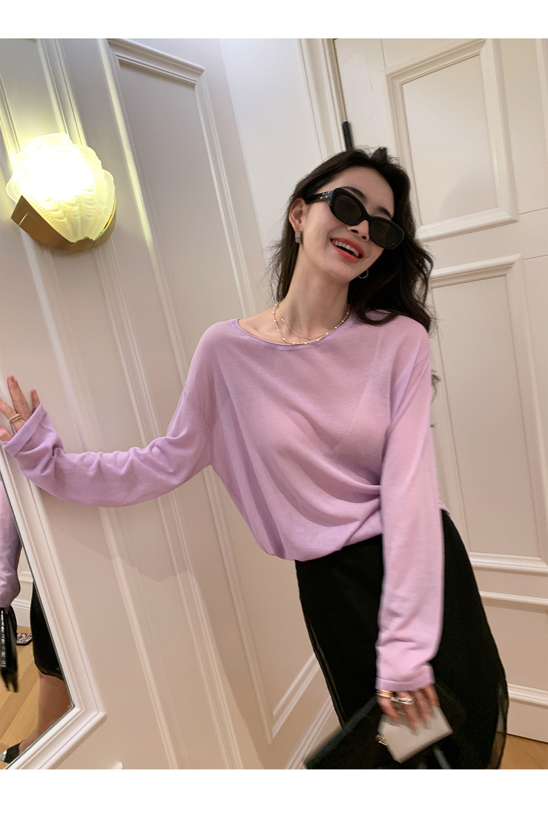 한국식 콘트라스트 텐셀 니트 셔츠 여성용 긴팔 티셔츠 느슨한 얇은 마이크로 투명 종이 셔츠