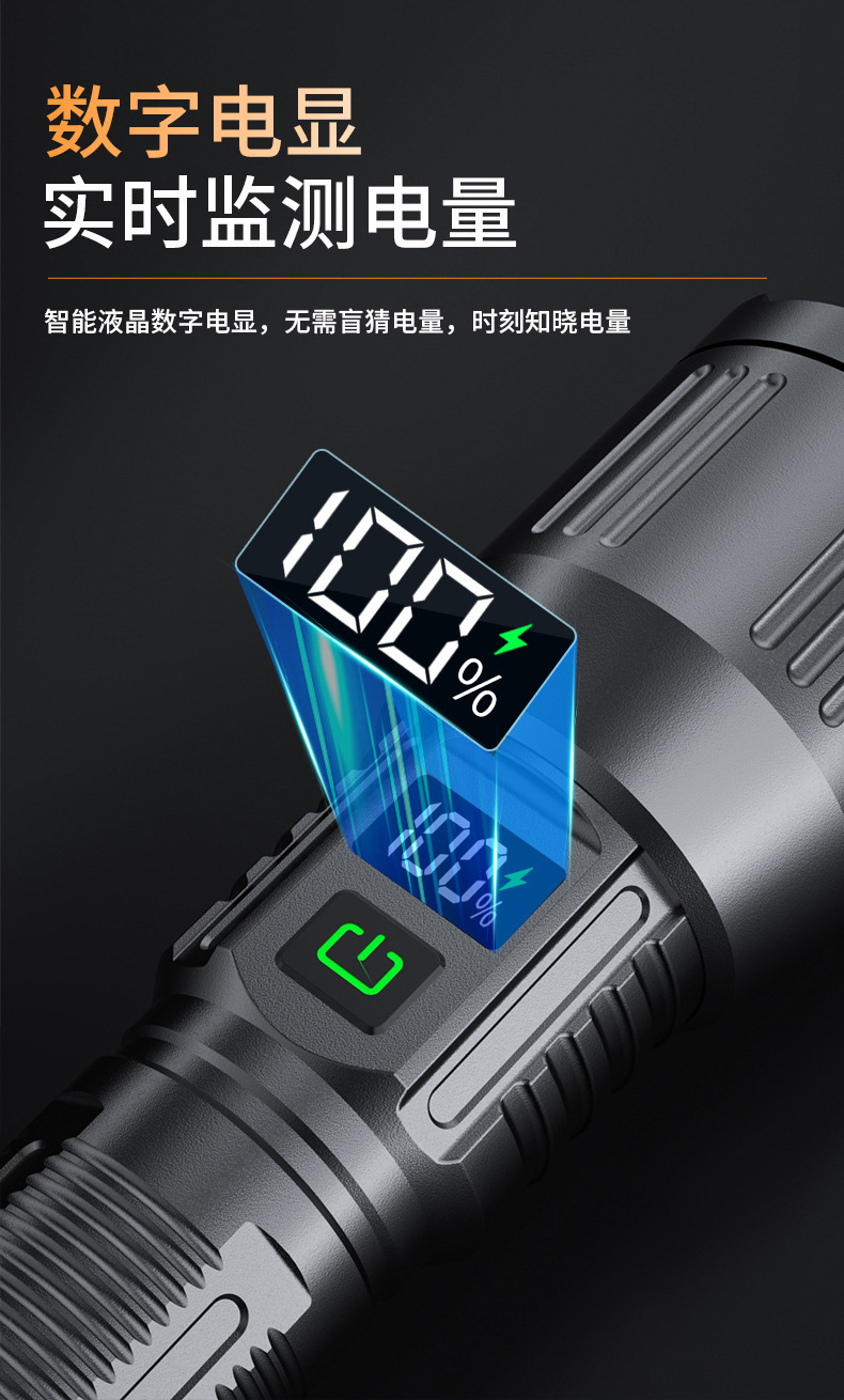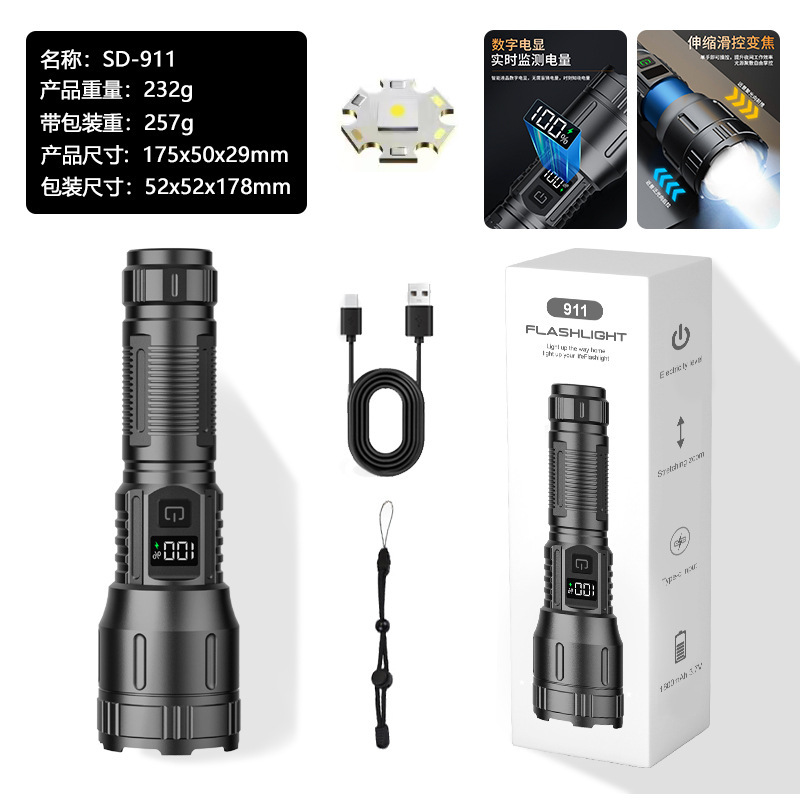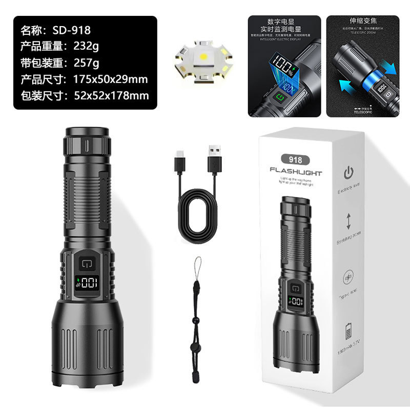 국경 간 야외 순찰 스포트라이트 장거리 강한 빛 손전등 Type-c 충전식 디지털 디스플레이 텔레스코픽 줌 손전등 도매