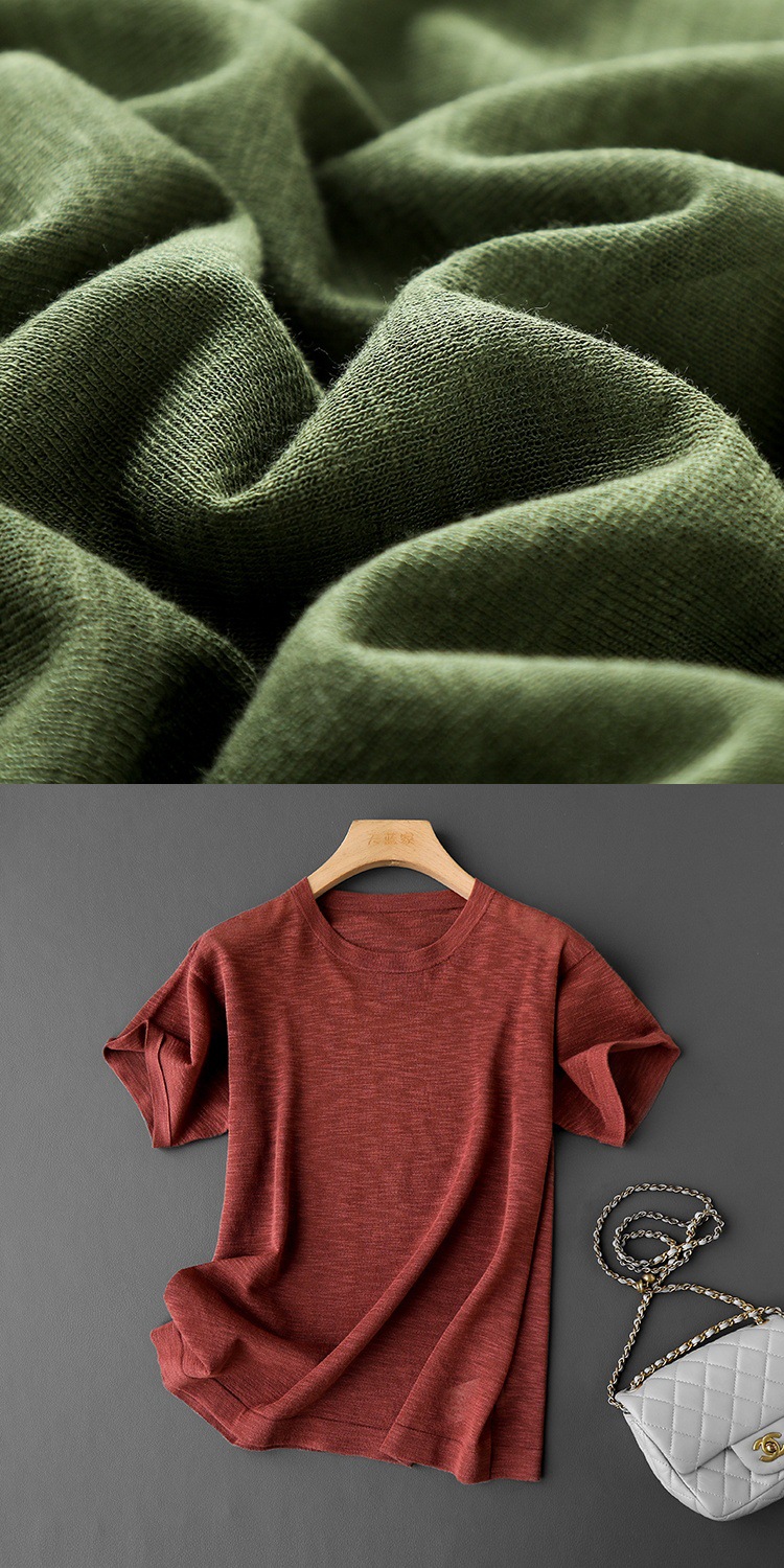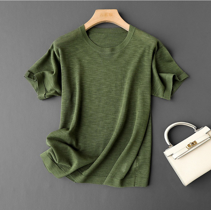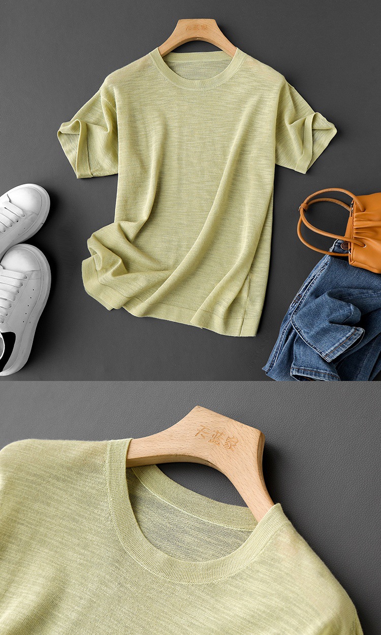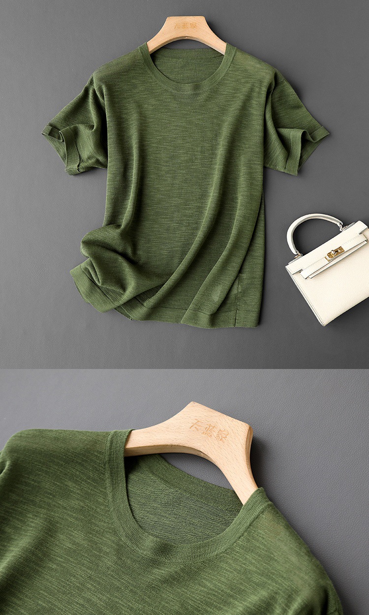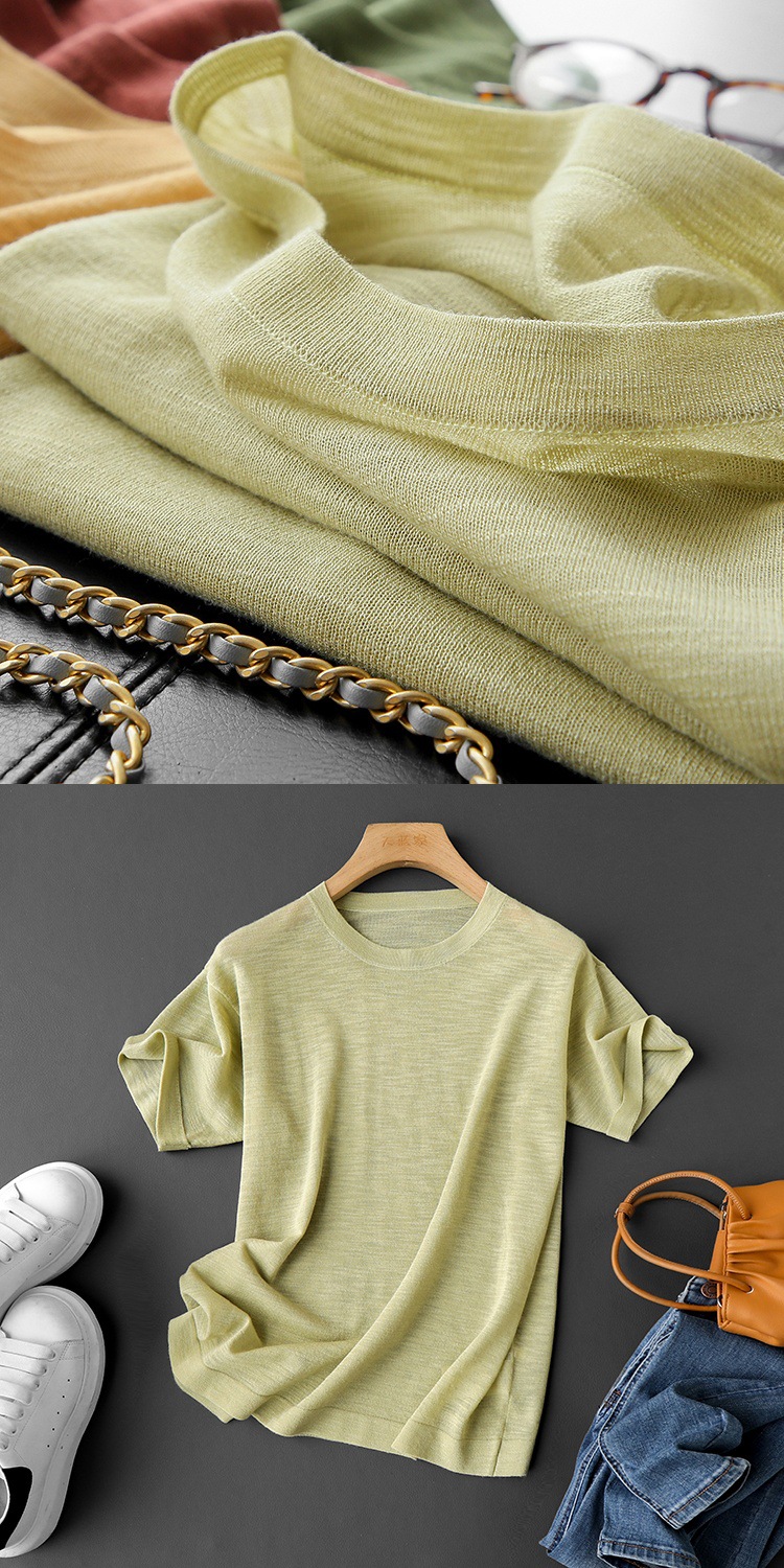 니트웨어 같은 CHAO! 얇은 리넨 텐셀 크루 넥 반팔 니트 티셔츠 여성용 여름 솔리드 컬러 마차 그린 탑스토어 가기