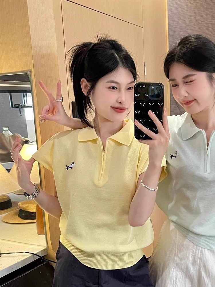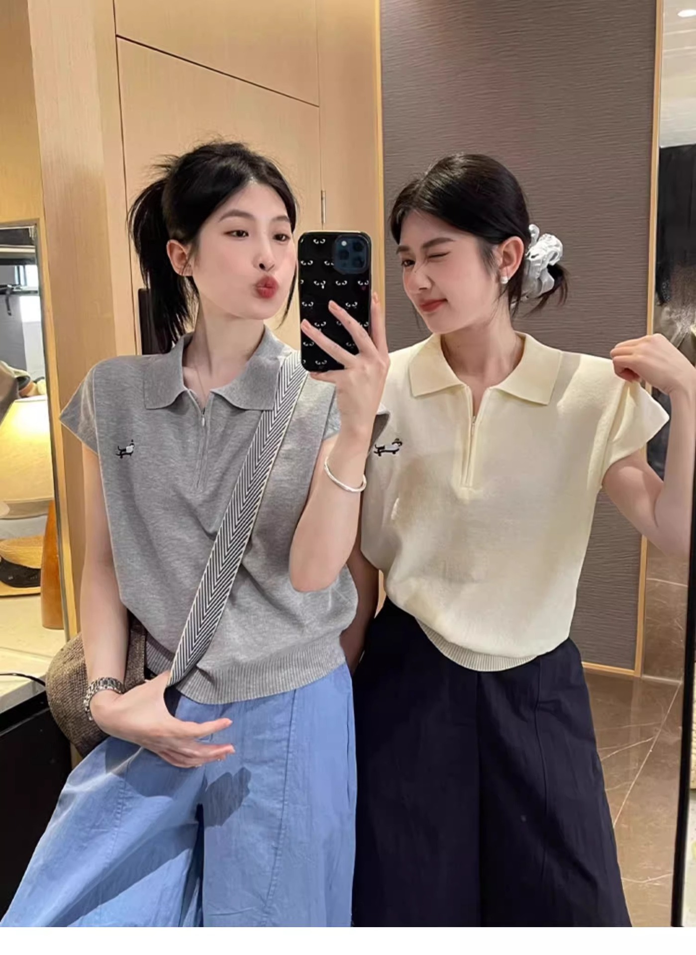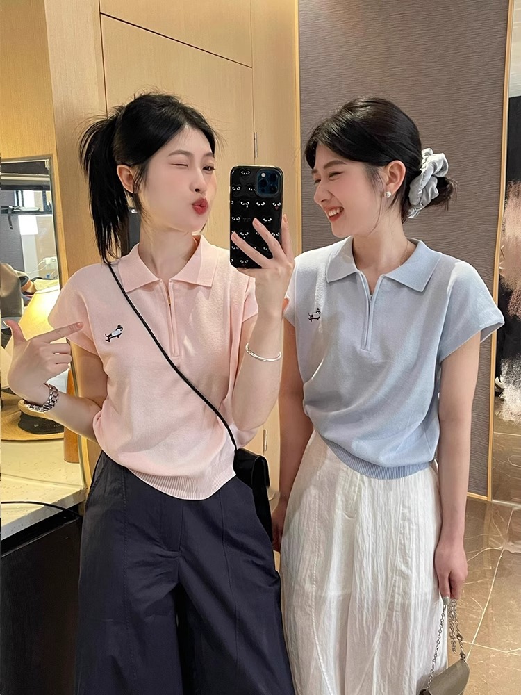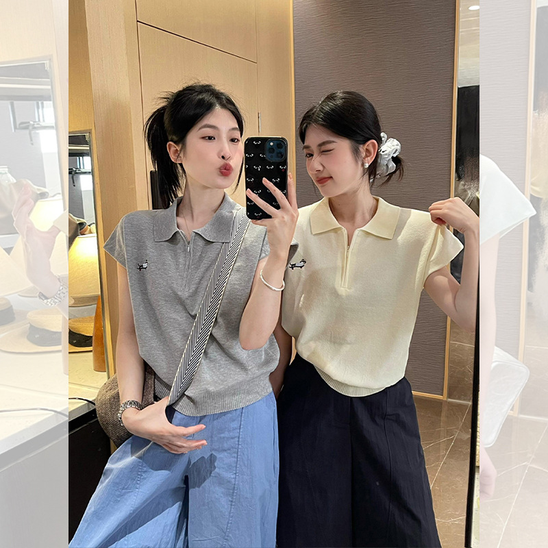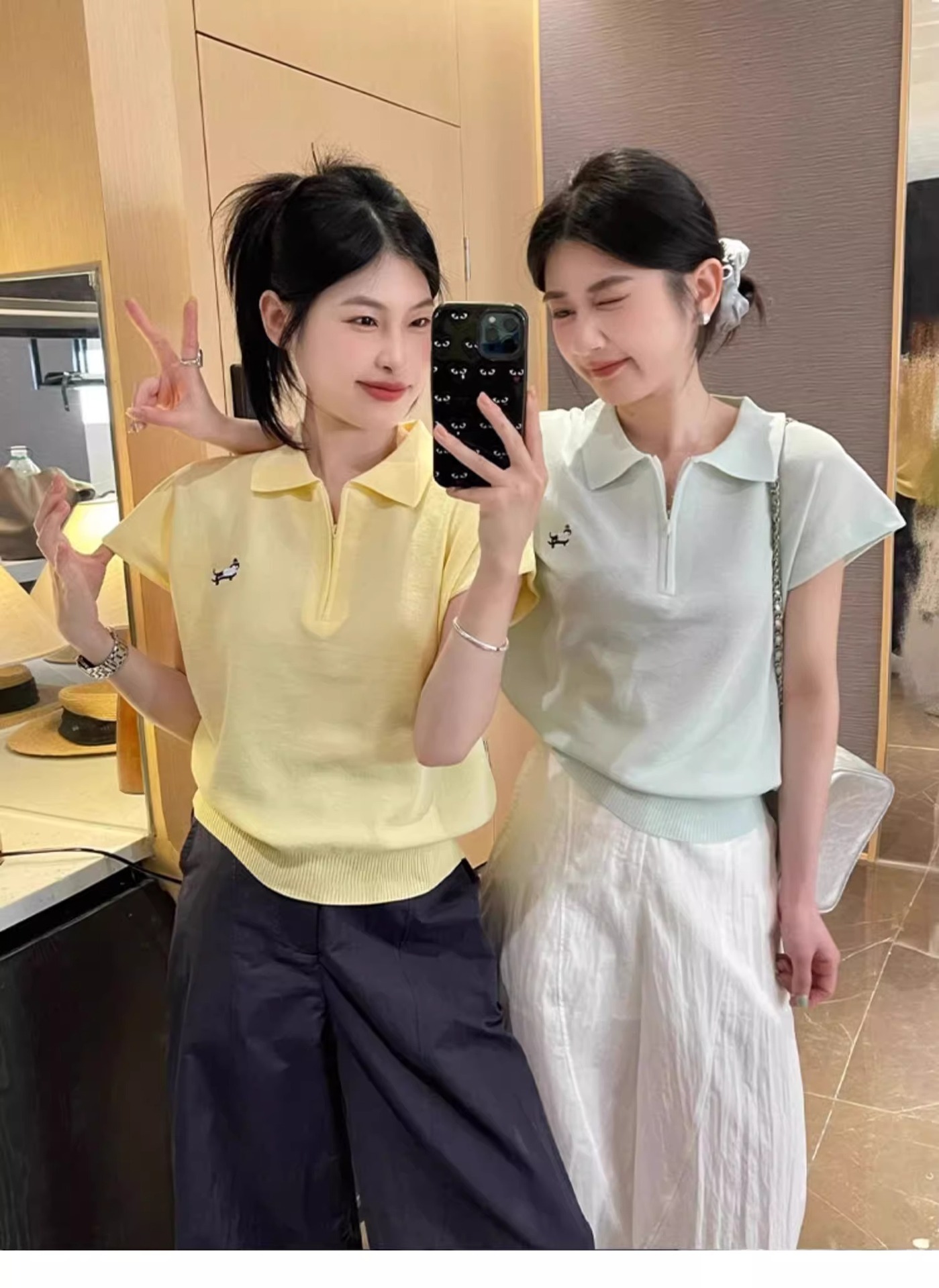 폴로 칼라 반팔 티셔츠 여성 여름 새로운 한국식 Lapp 아이스 실크 니트 셔츠 짧은 반 지퍼 디자인 탑스토어 가기
