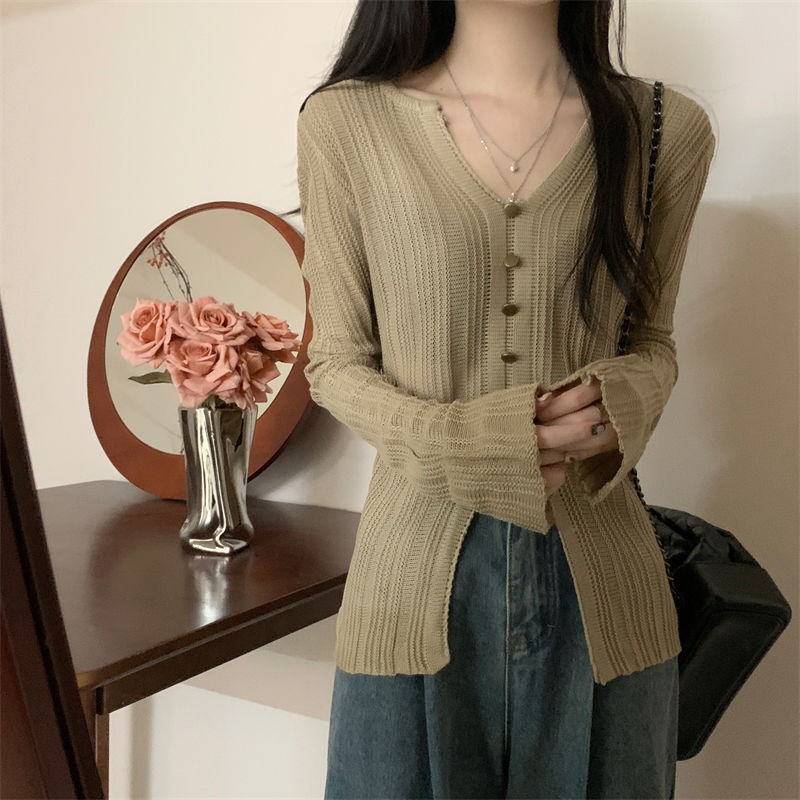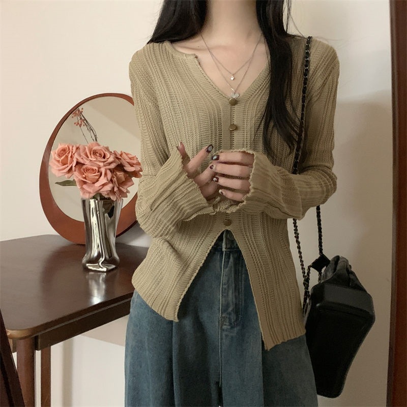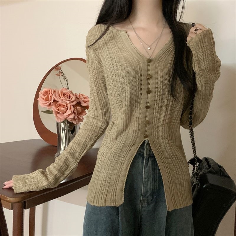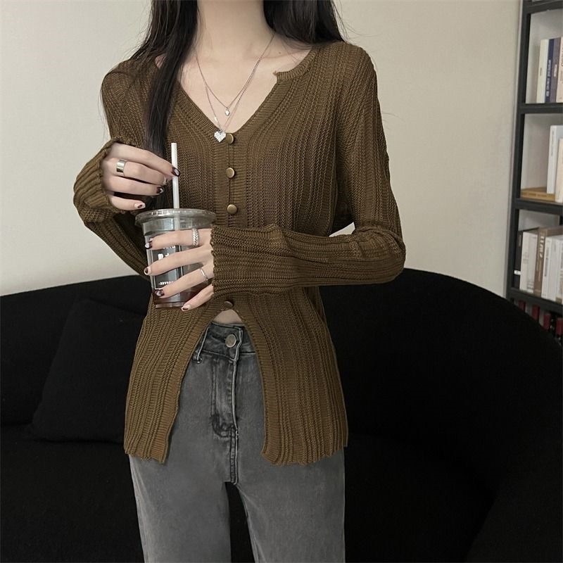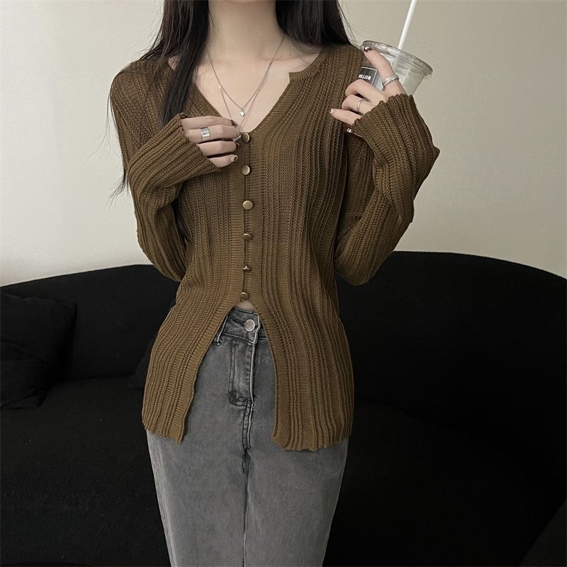 다크 브라운 스플릿 V 넥 Maillard 니트 긴팔 베이스 셔츠 여성용 봄 슬림 핏 슬리밍 디자인 센스 내부 탑스토어 가기