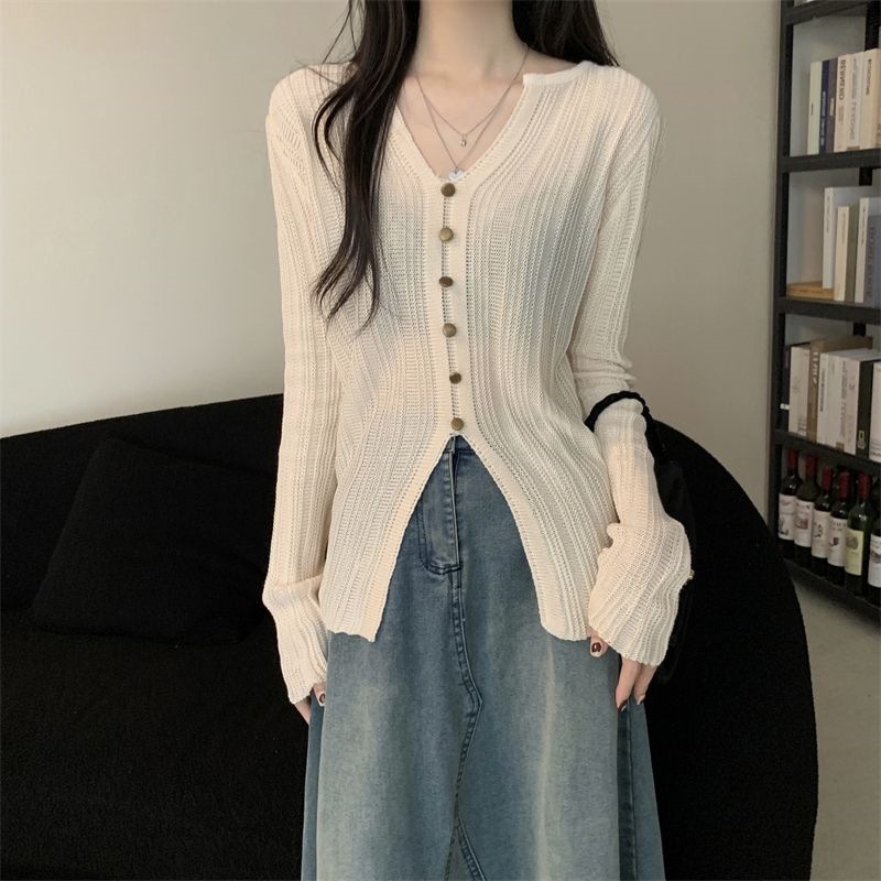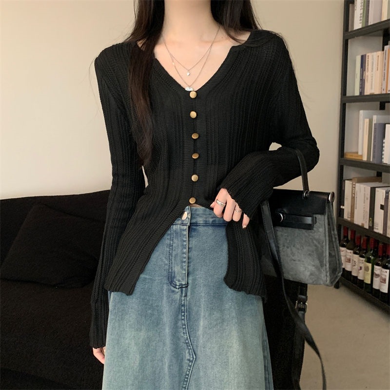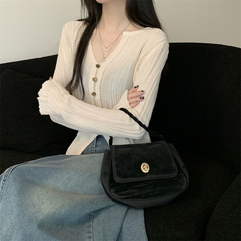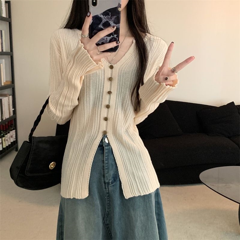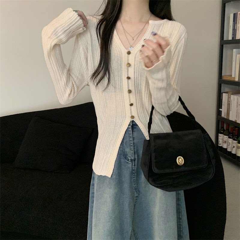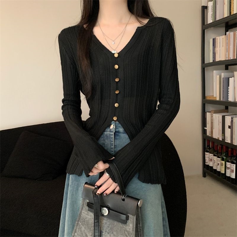 다크 브라운 스플릿 V 넥 Maillard 니트 긴팔 베이스 셔츠 여성용 봄 슬림 핏 슬리밍 디자인 센스 내부 탑스토어 가기