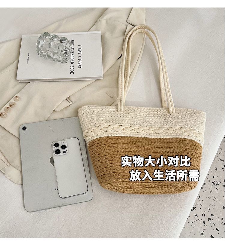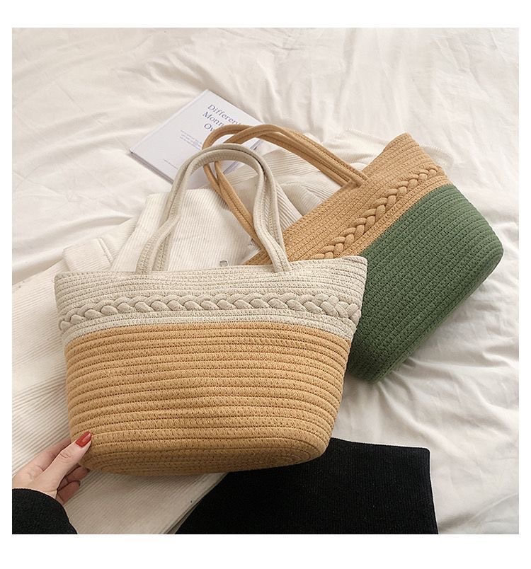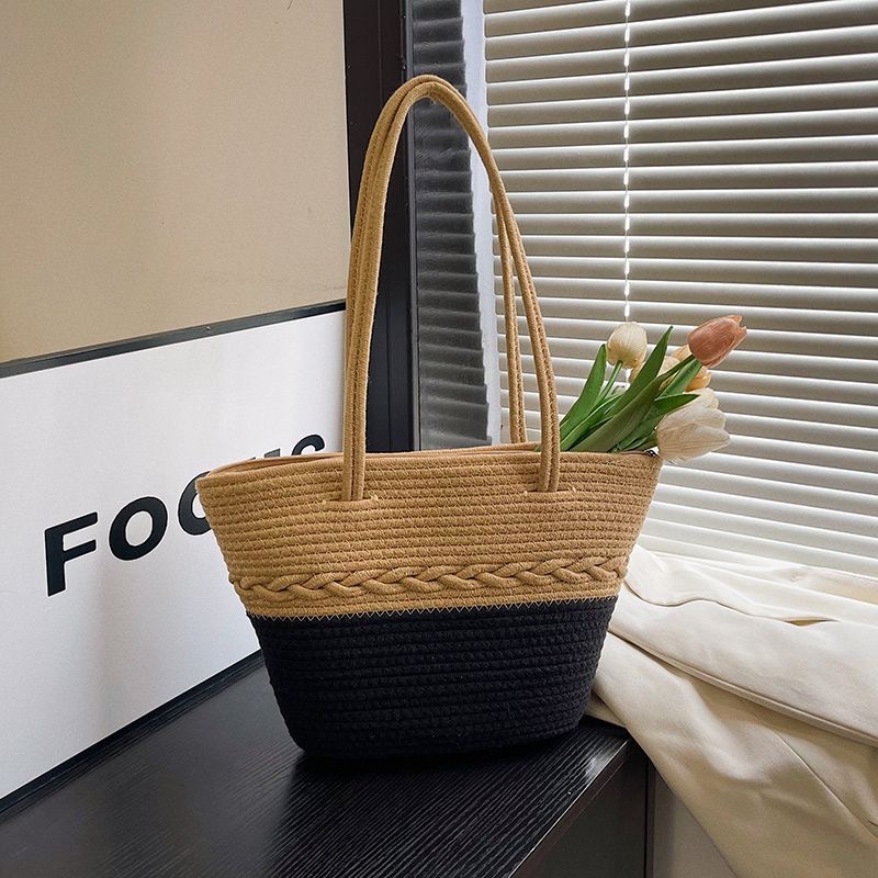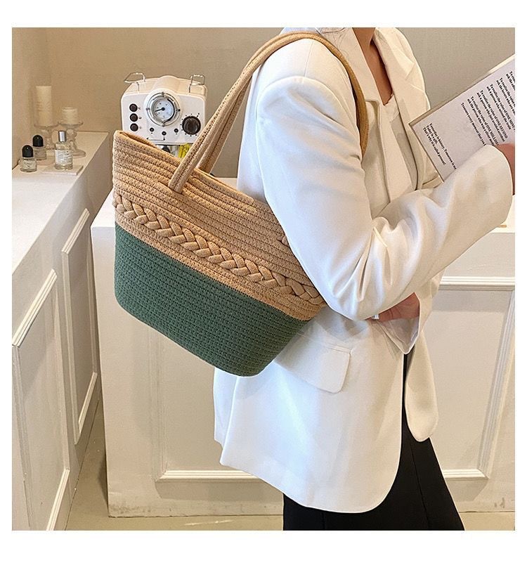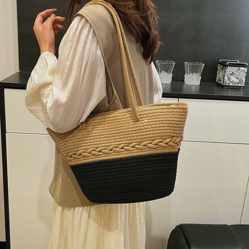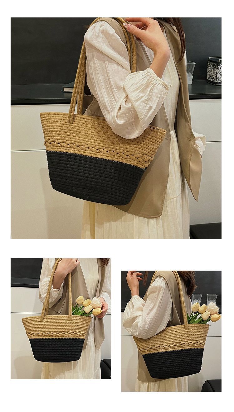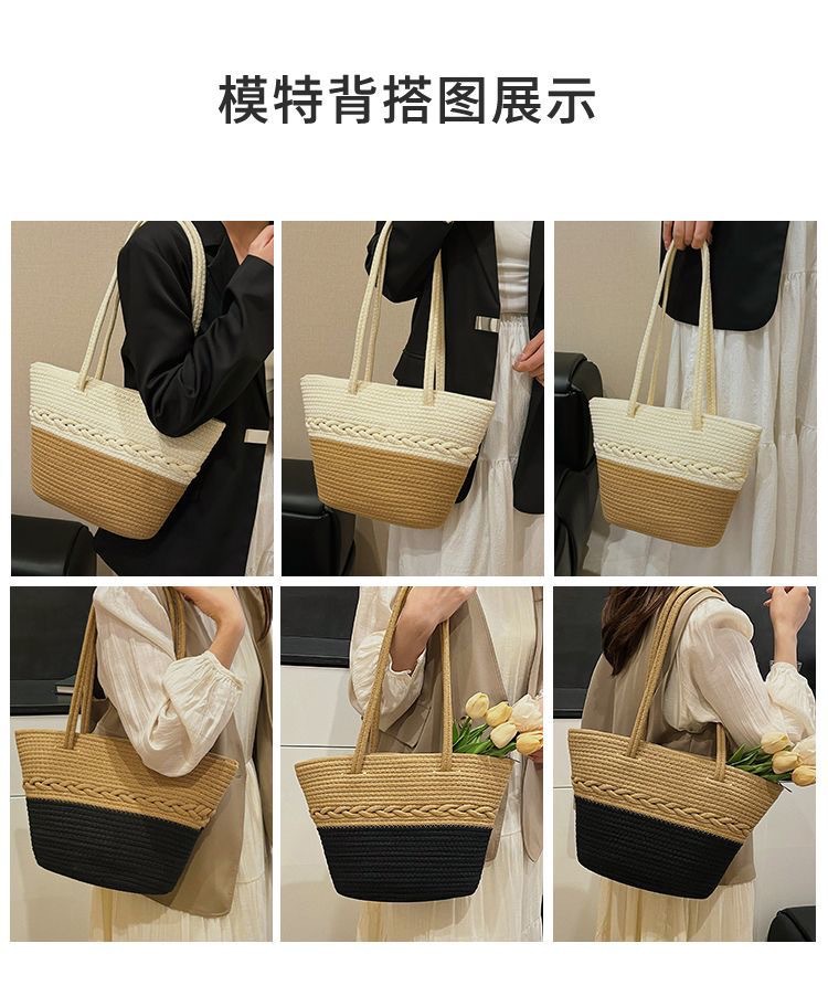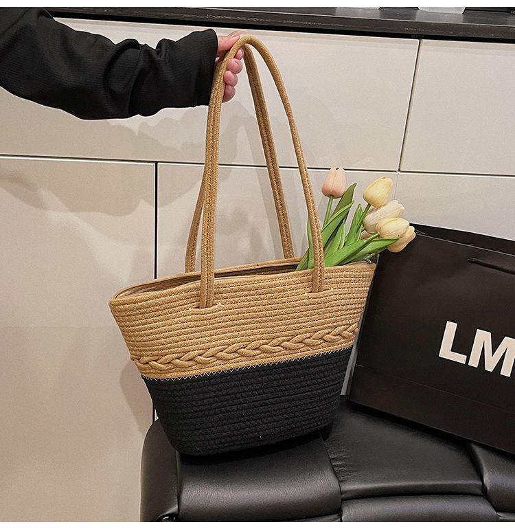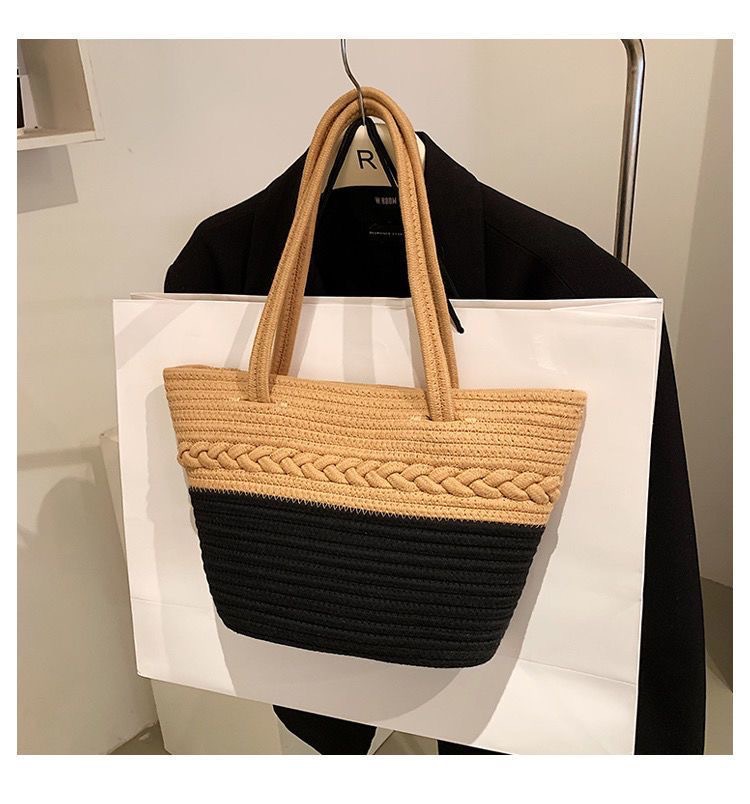 면사로 짠 가방, 새로운 대비색 숄더백, 대용량 밀짚 가방, 휴가용 비치백, 다용도 여성용 토트백스토어 가기