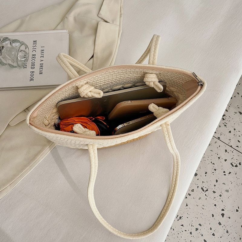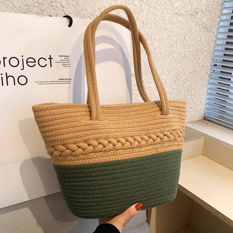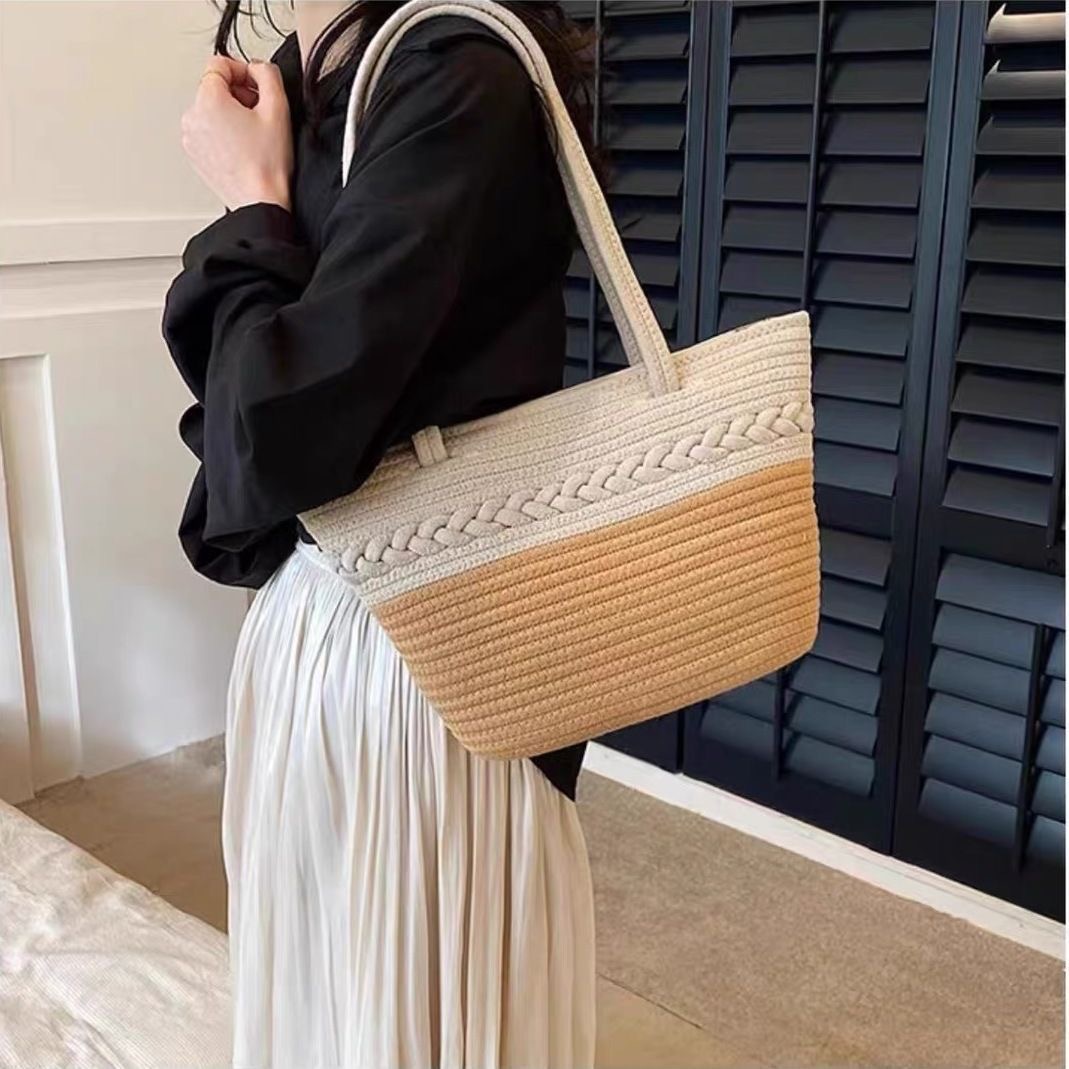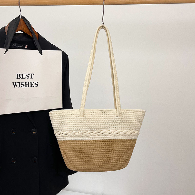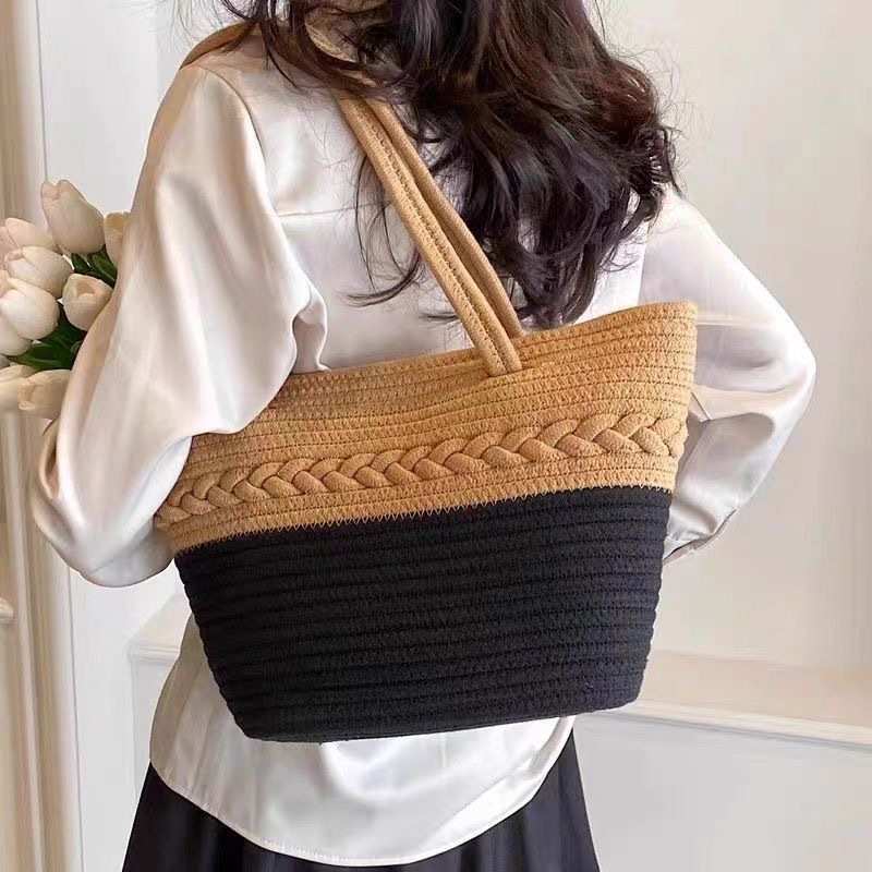 면사로 짠 가방, 새로운 대비색 숄더백, 대용량 밀짚 가방, 휴가용 비치백, 다용도 여성용 토트백