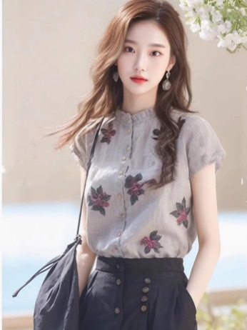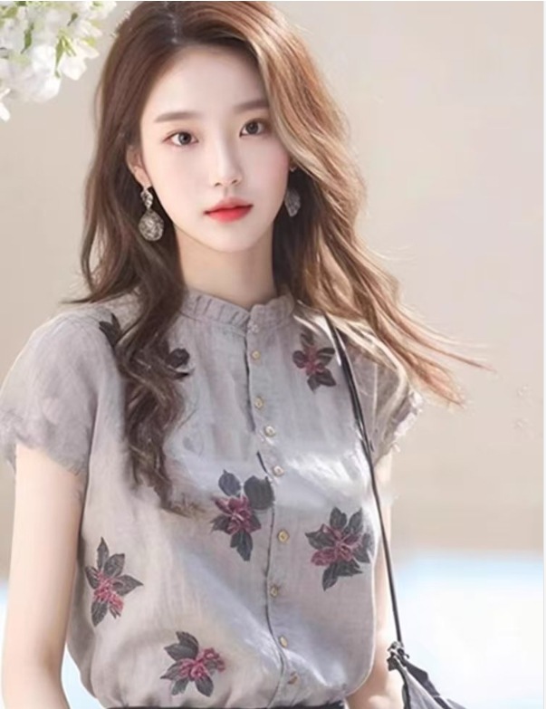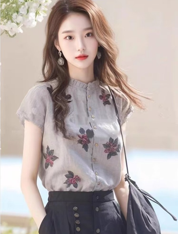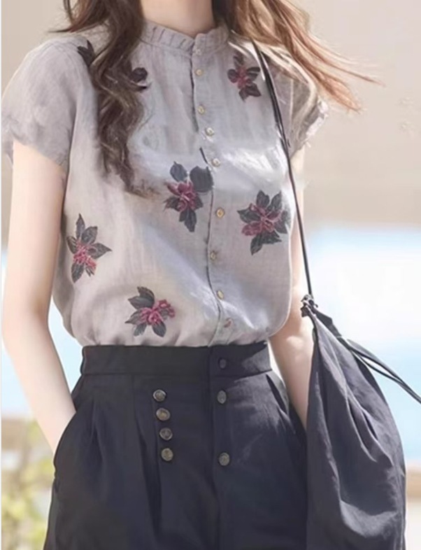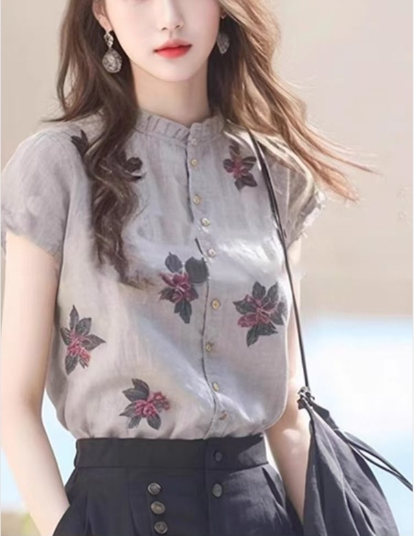 프랑스 스타일 레트로 꽃 칼라 반팔 리넨 셔츠 여성 디자인 센스 틈새 독특한 세련된 스파이스 소녀 아름다운 탑스토어 가기