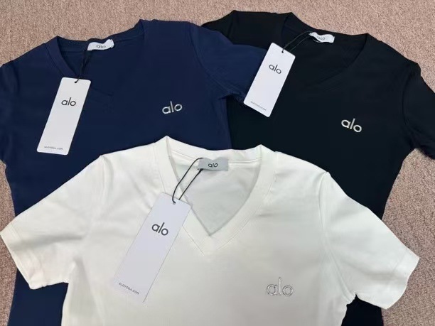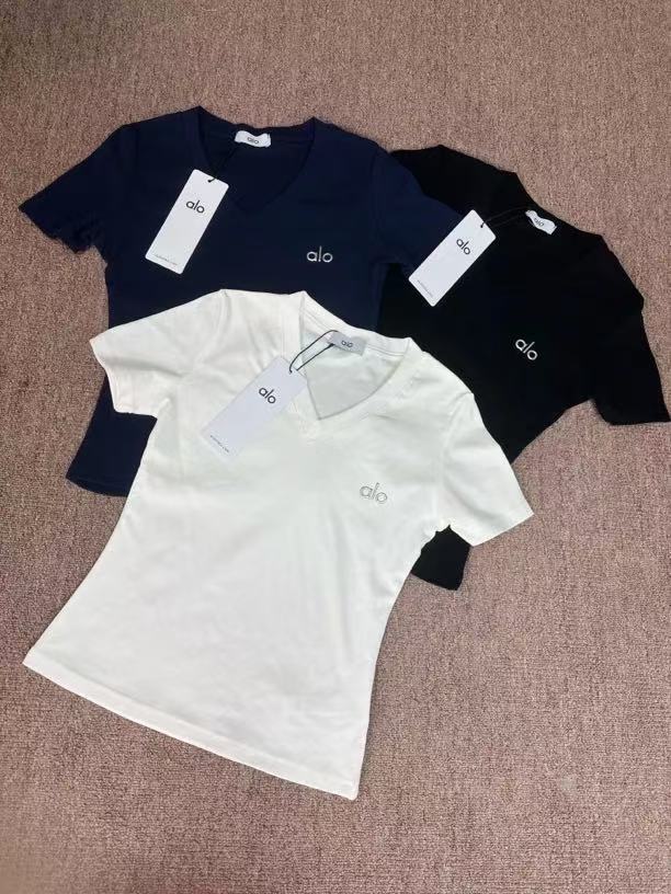 ALO 새로운 슬럽 코튼 복숭아 칼라 반팔 티셔츠 여성용 2025 여름 슬림 핏 슬리밍 티셔츠 탑 하이 버전스토어 가기