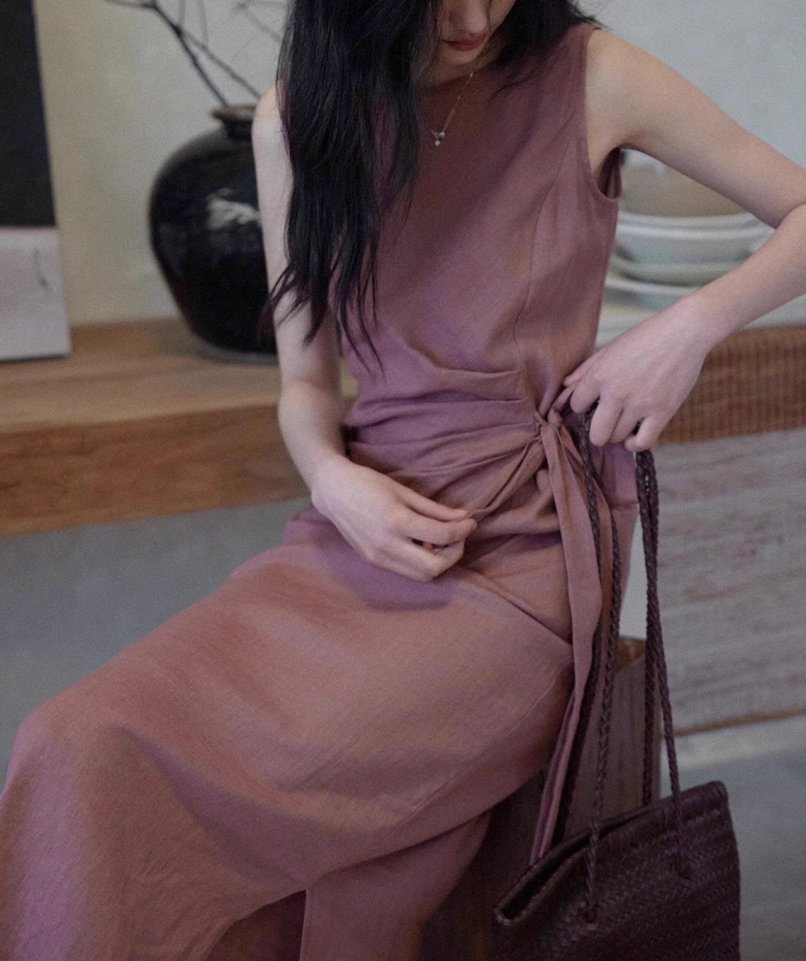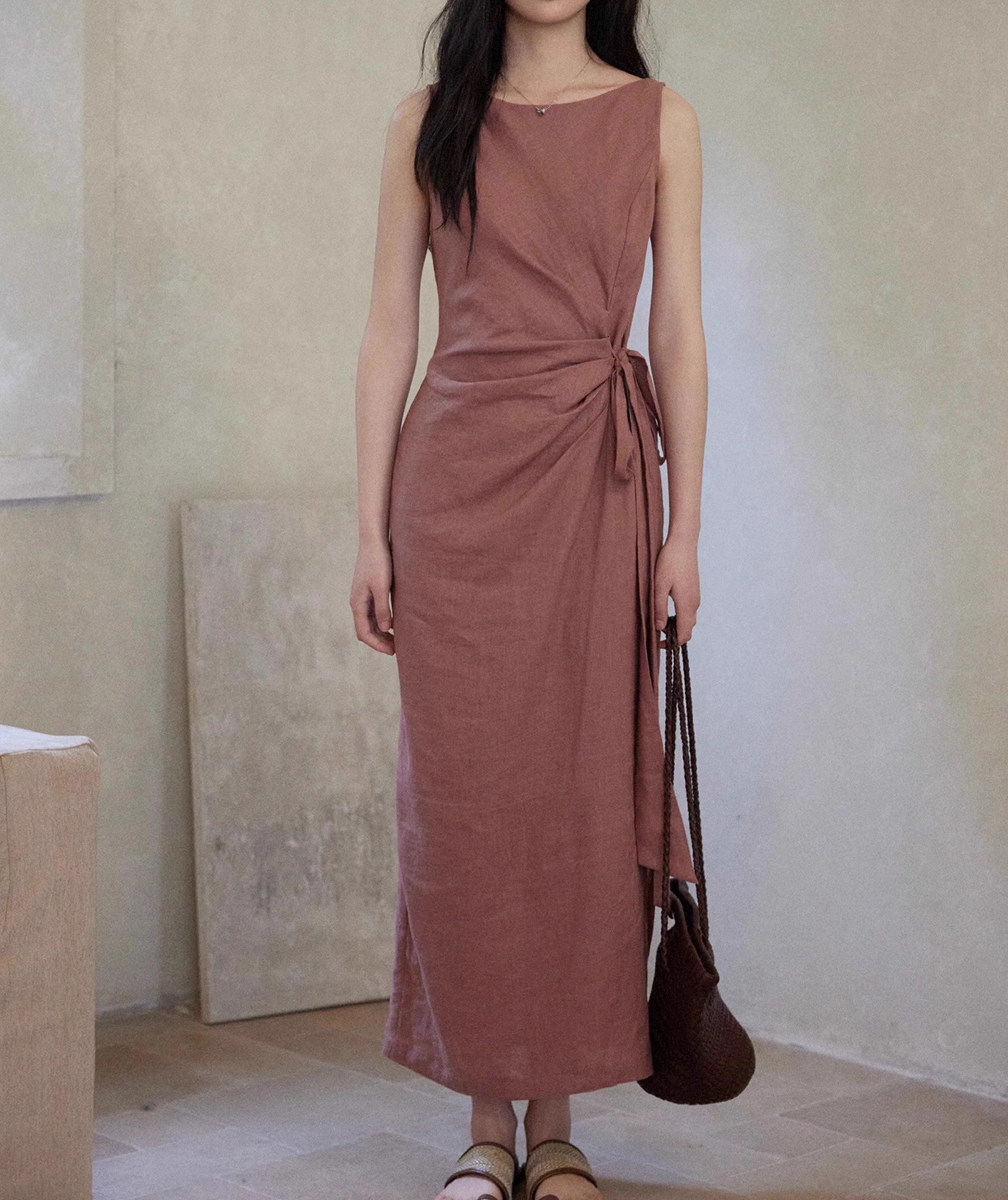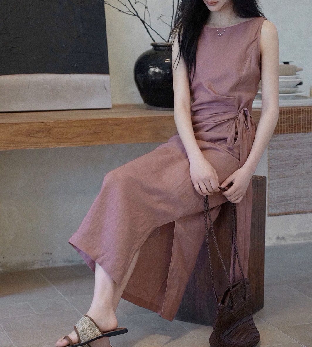 두 양 [르 웨이] 100 린넨 크루 넥 민소매 원피스 여성 레이스 업 허리 통근 조커 스커트스토어 가기