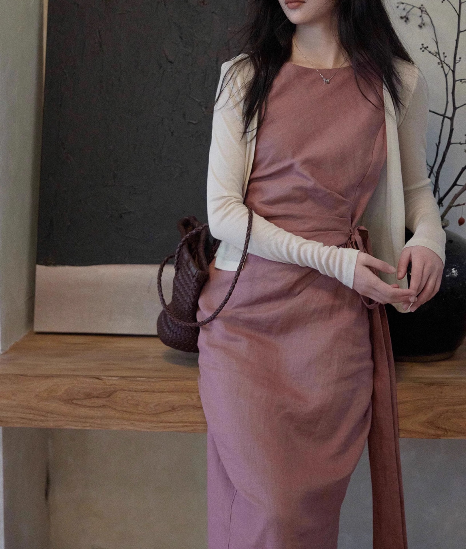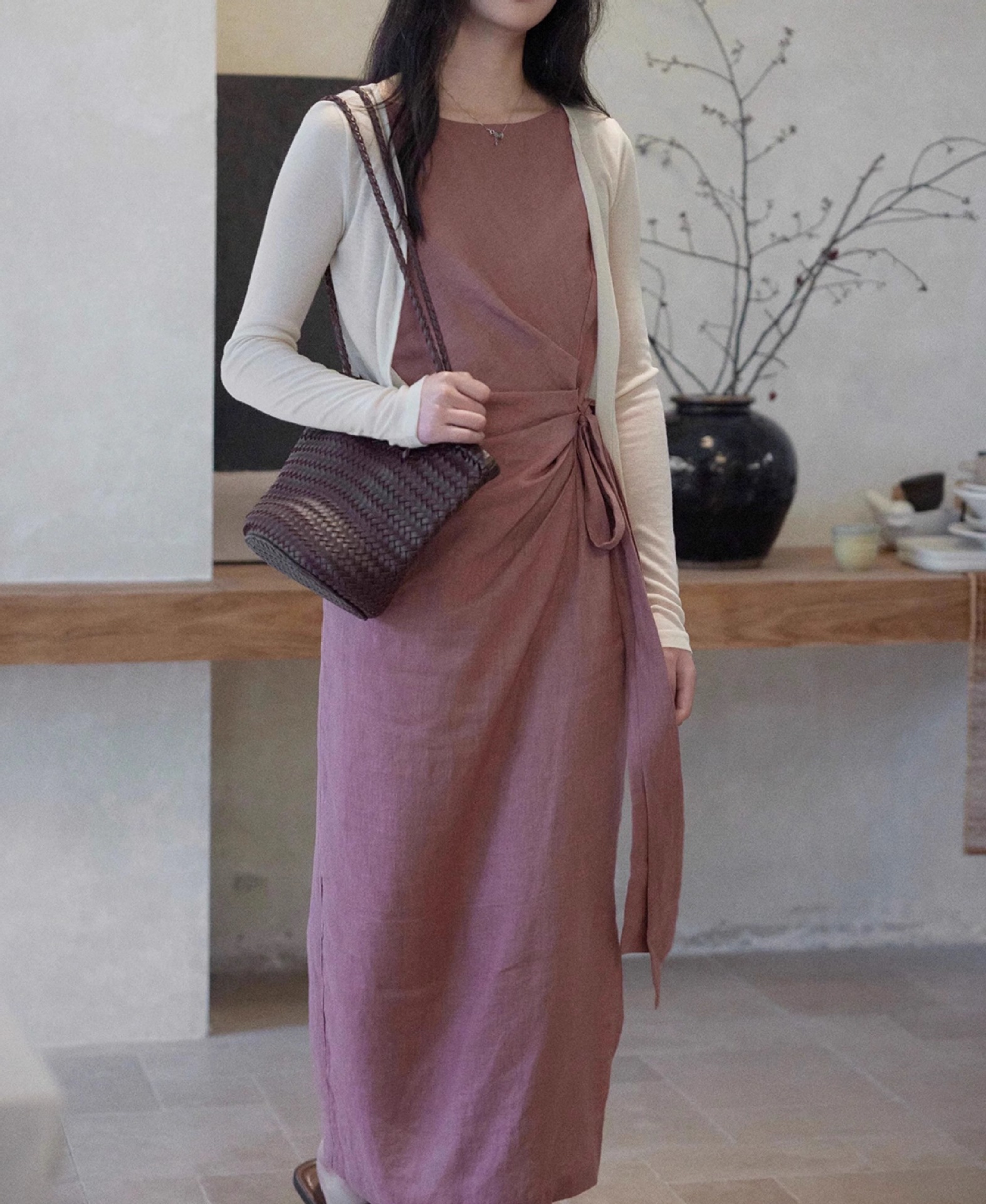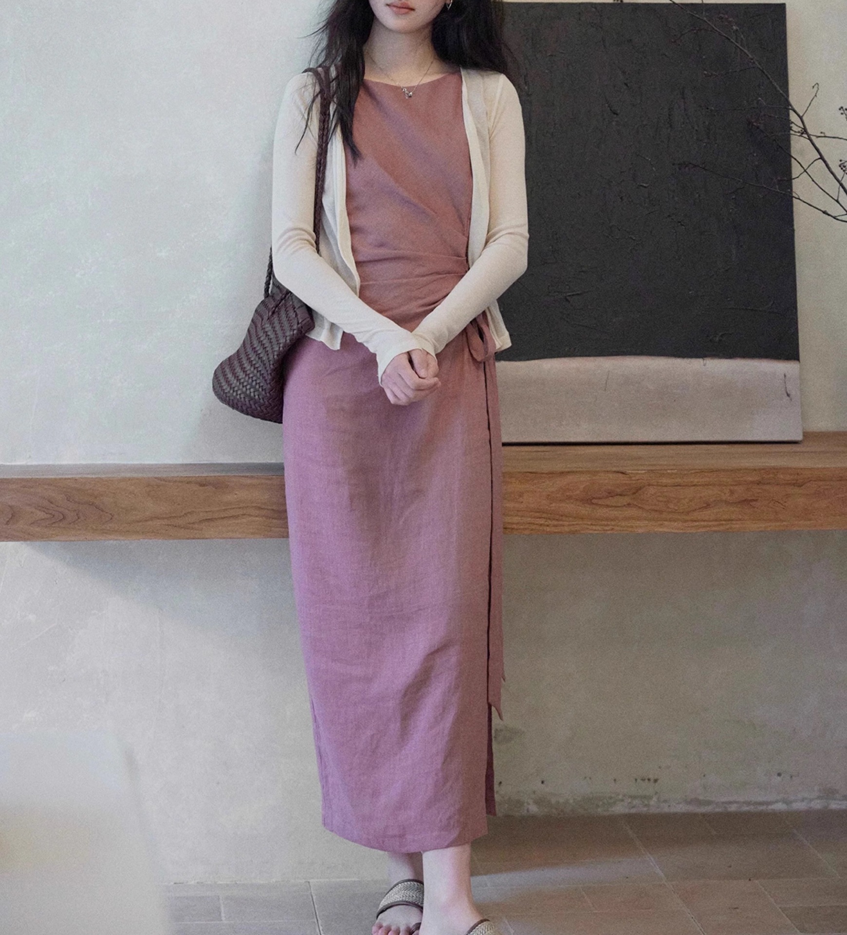 두 양 [르 웨이] 100 린넨 크루 넥 민소매 원피스 여성 레이스 업 허리 통근 조커 스커트스토어 가기