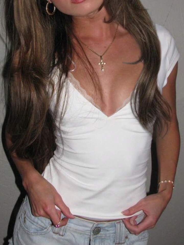 2025 유럽과 미국의 국경 간 여성용 교체 레이스 스플 라이스 v 넥 반팔 티셔츠 Pure Desire Hot Girl 반팔 탑 Hot Girl스토어 가기