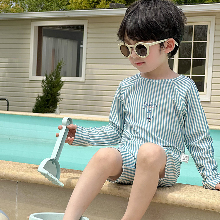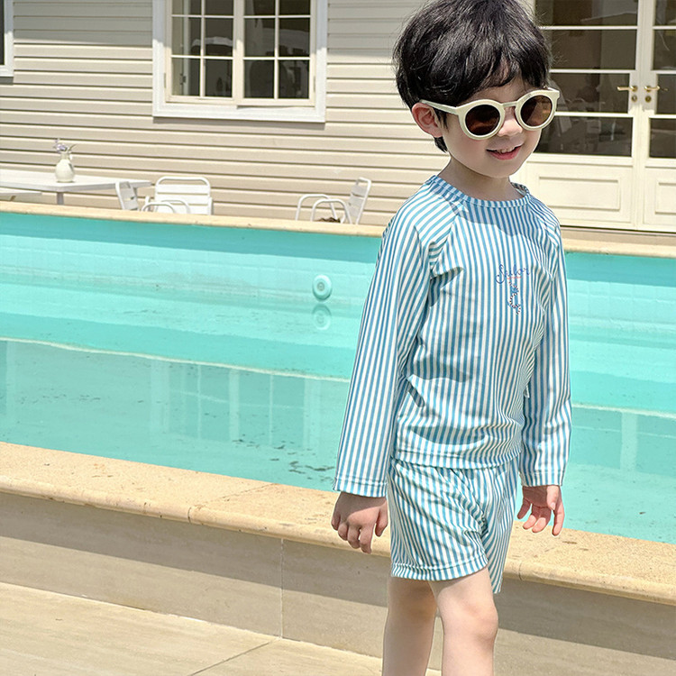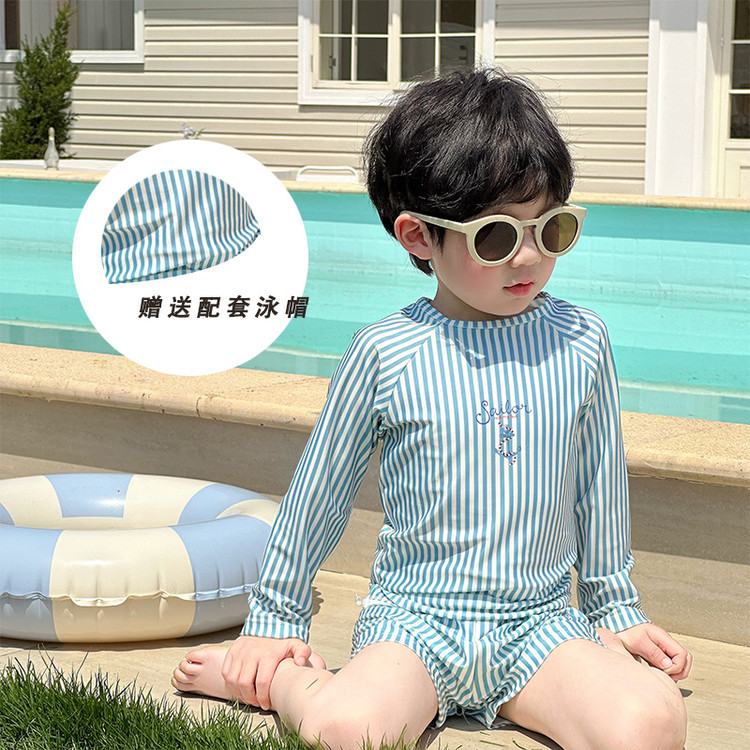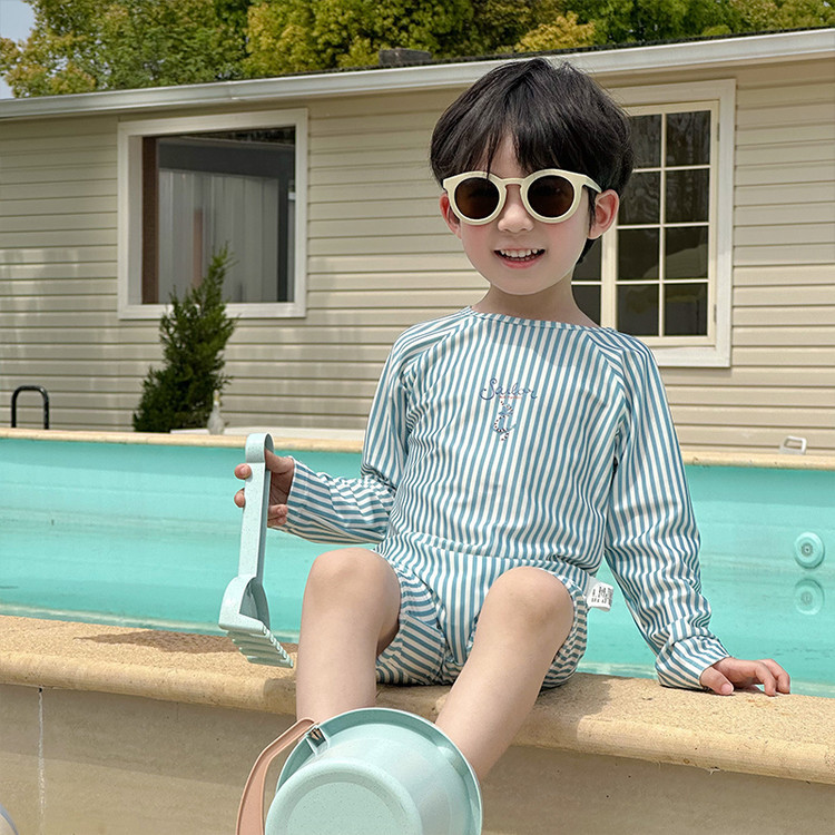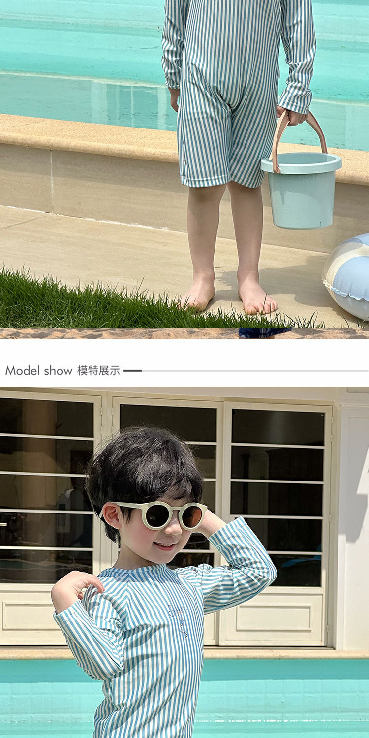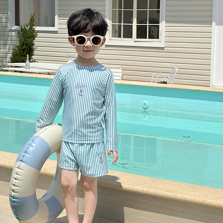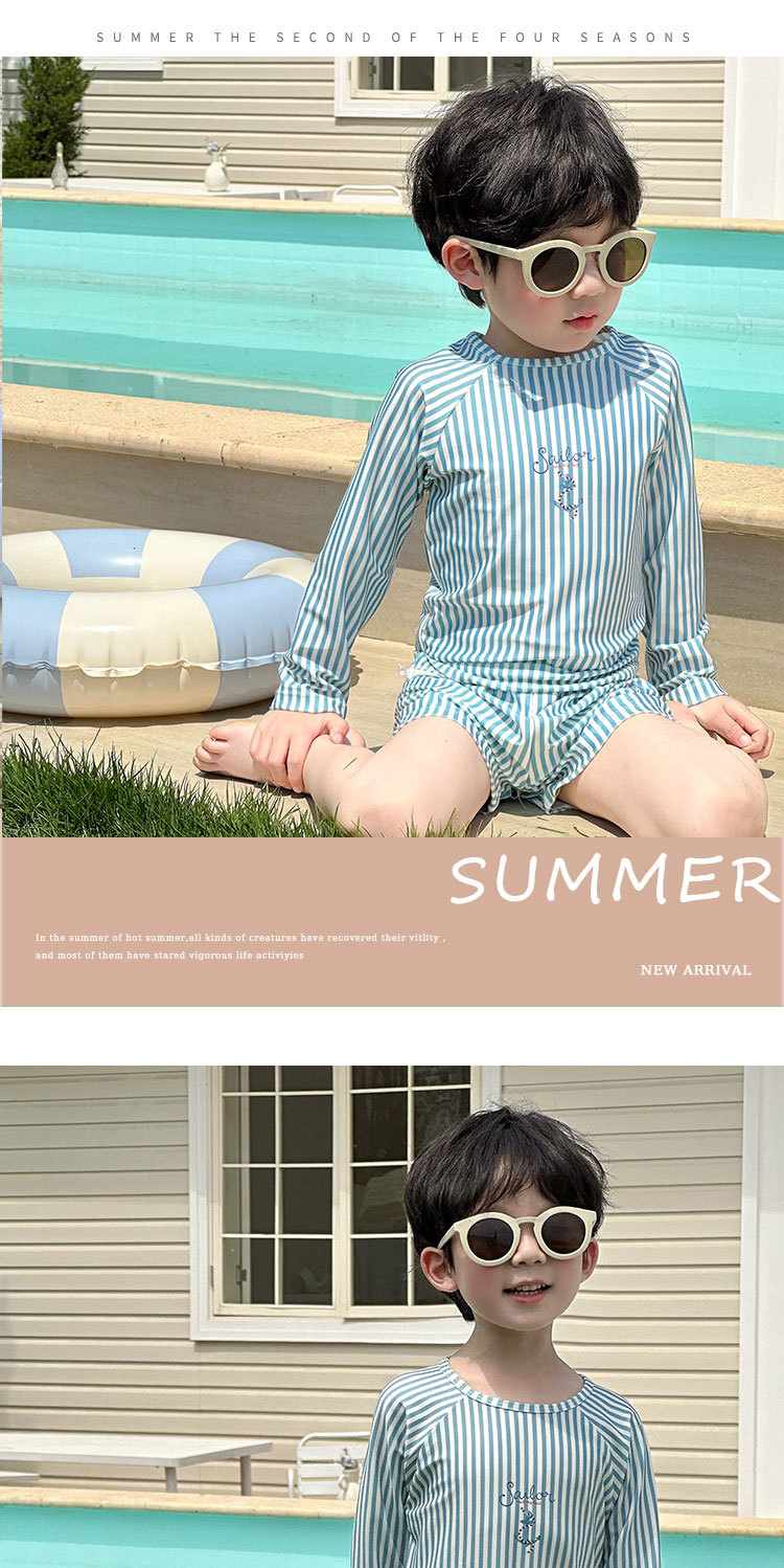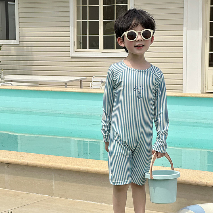 남성과 여성을 위한 새로운 아동용 수영복, 긴팔 자외선 차단 수영복, 심플한 줄무늬 해변 온천 휴가 속건 수영복스토어 가기