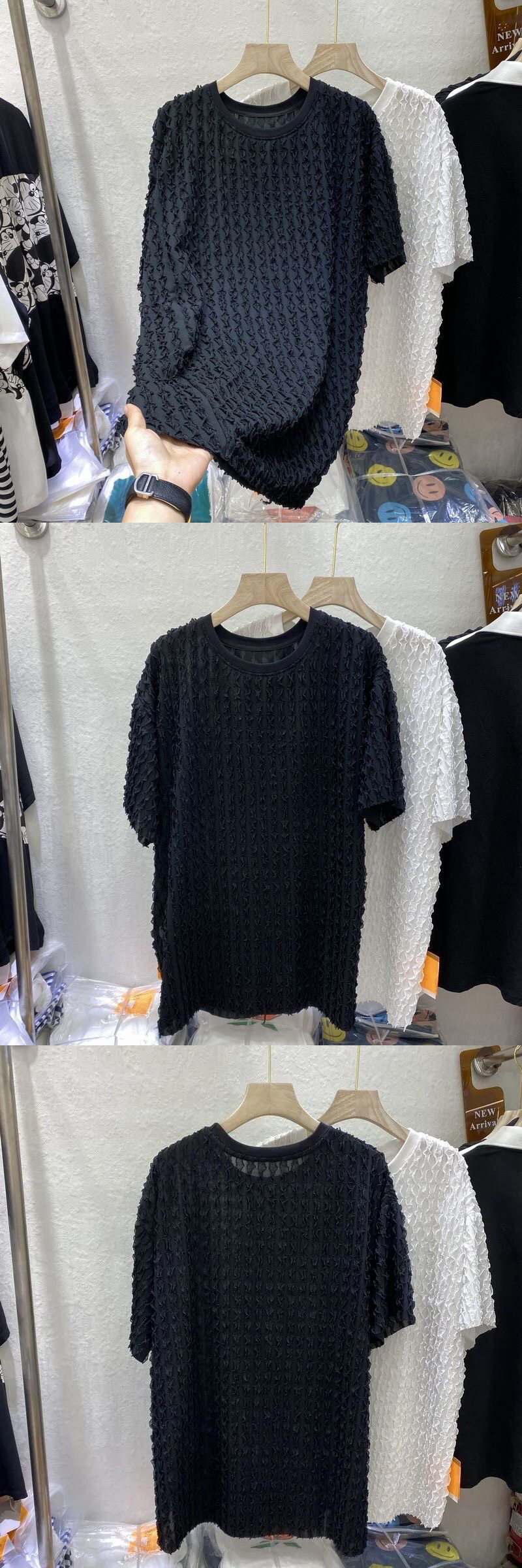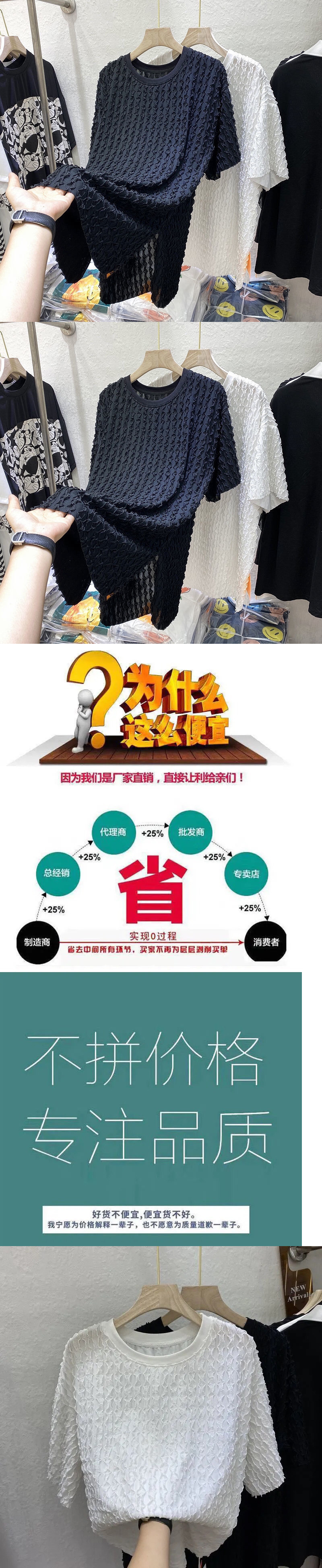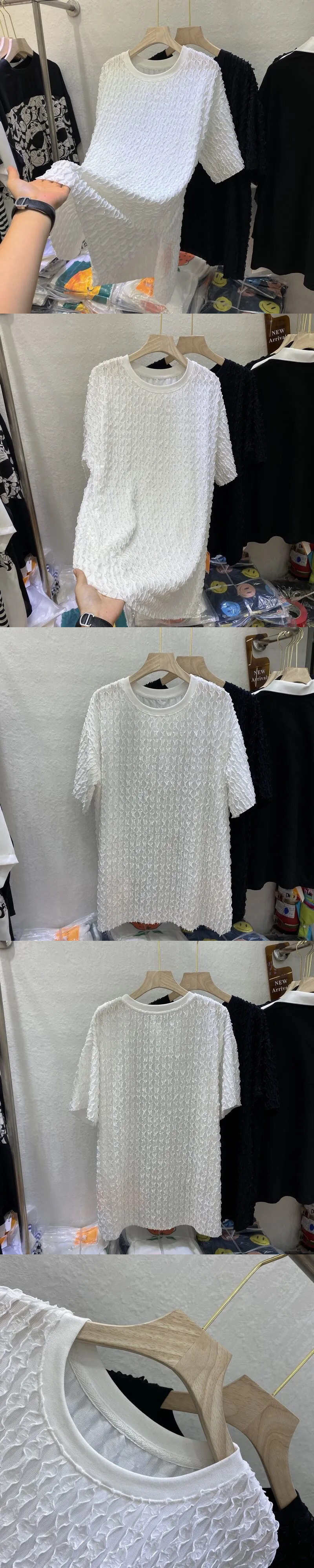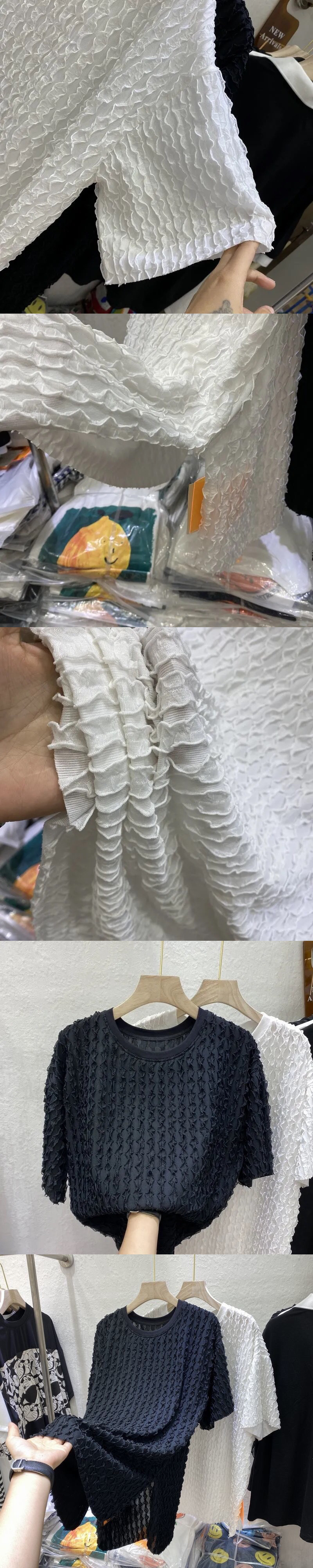 여름 여성용 주름진 나뭇잎 스플라이스 쉬폰 셔츠 루즈한 중간 길이 배를 덮는 2024 새로운 스타일 슬릿 반팔 티셔츠스토어 가기