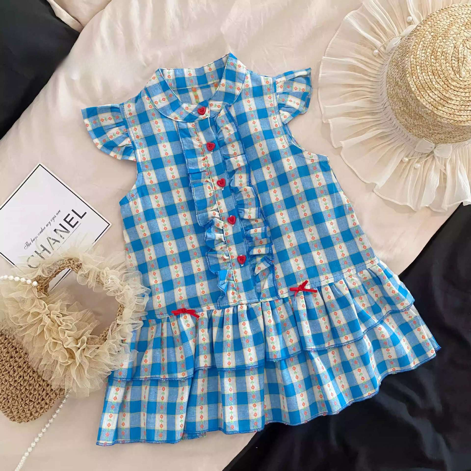 소녀의 신선한 격자 무늬 원피스 2024 여름 어린이 착용 달콤한 디자인 활 비행 슬리브 큰 소년 패션스토어 가기