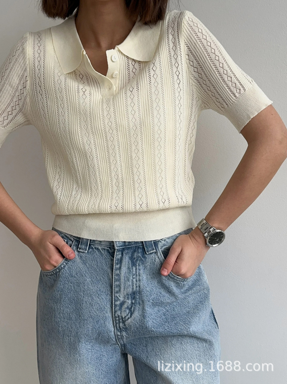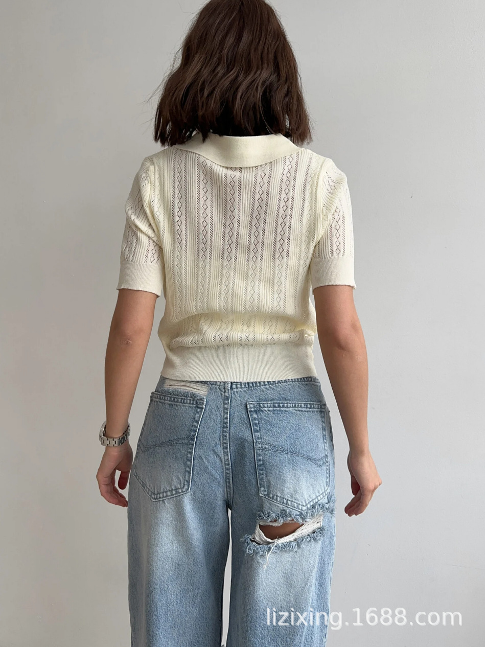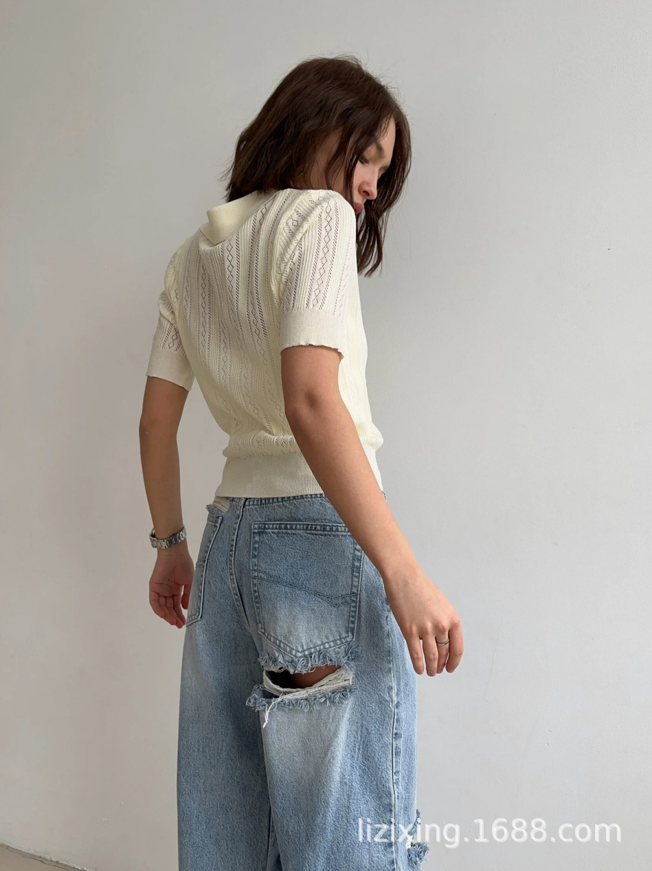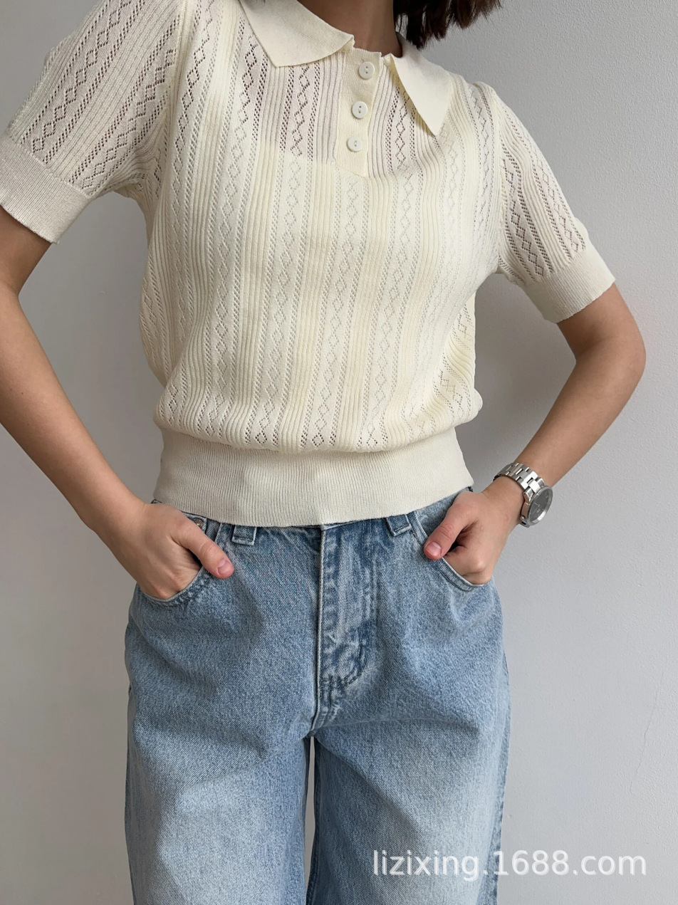 디자인 센스 할로우 라르 반팔 스웨터 여성의 2025 새로운 여름 독특한 독특한 틈새 트렌디 반소매 탑스토어 가기