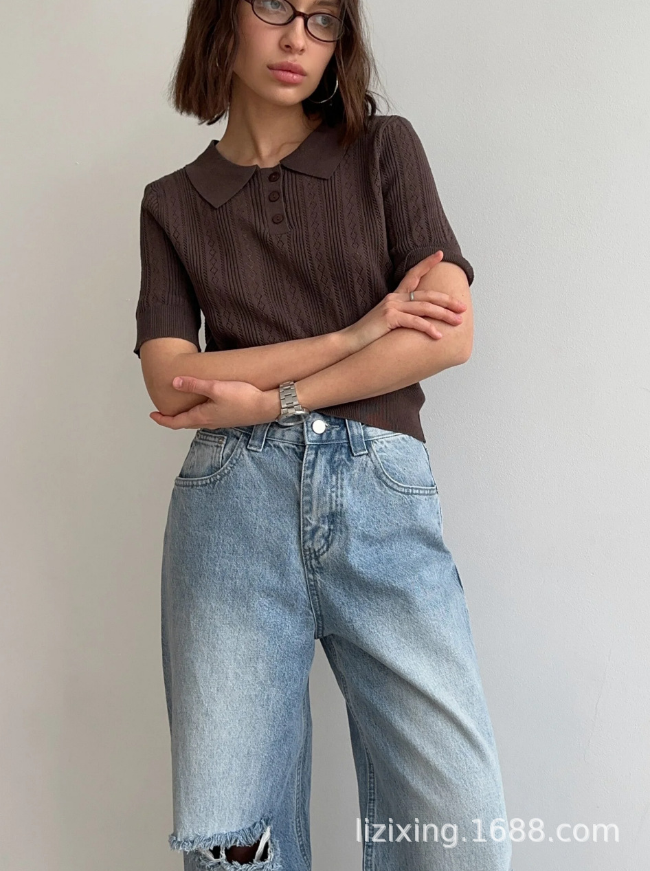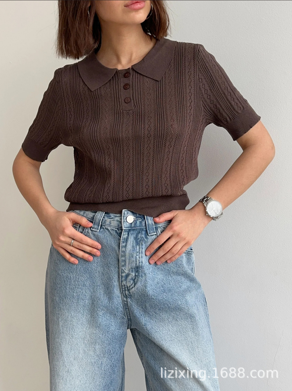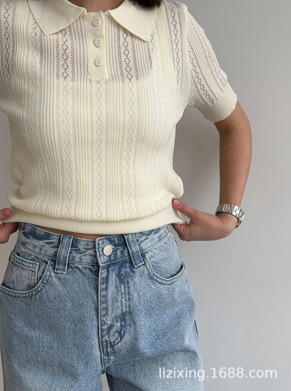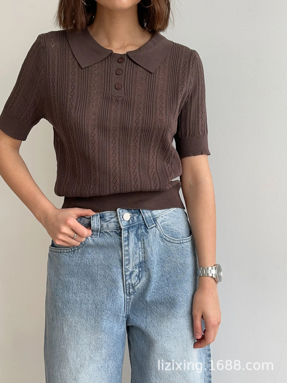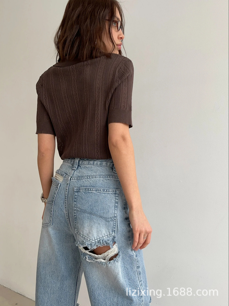 디자인 센스 할로우 라르 반팔 스웨터 여성의 2025 새로운 여름 독특한 독특한 틈새 트렌디 반소매 탑스토어 가기