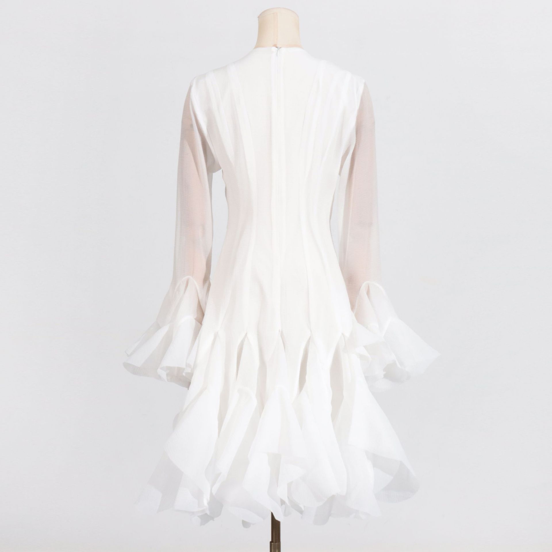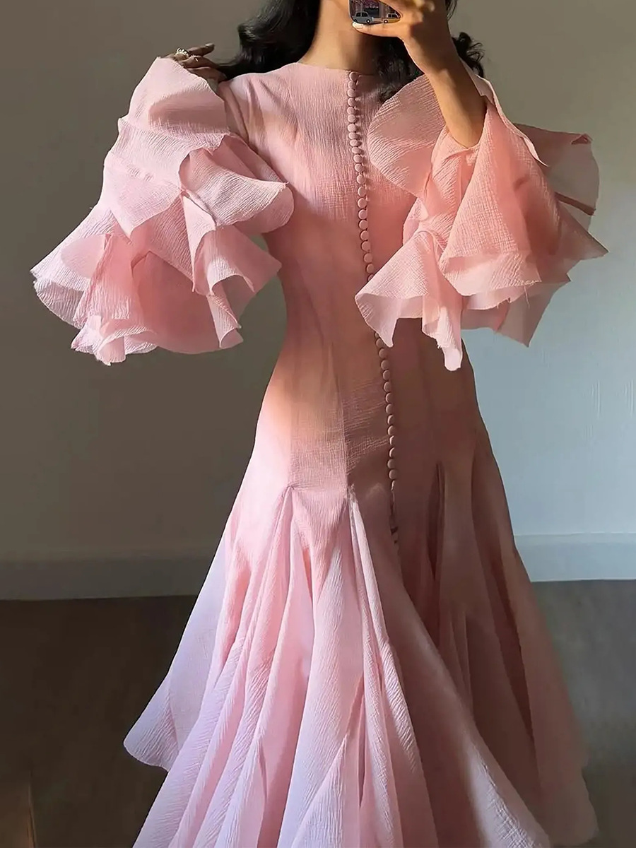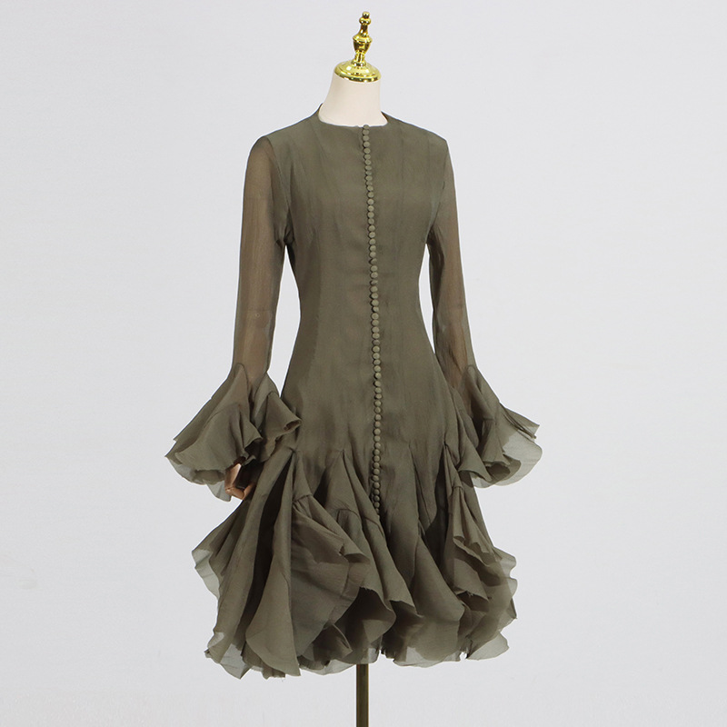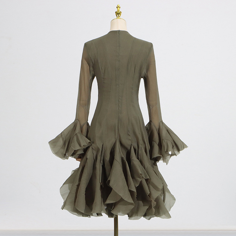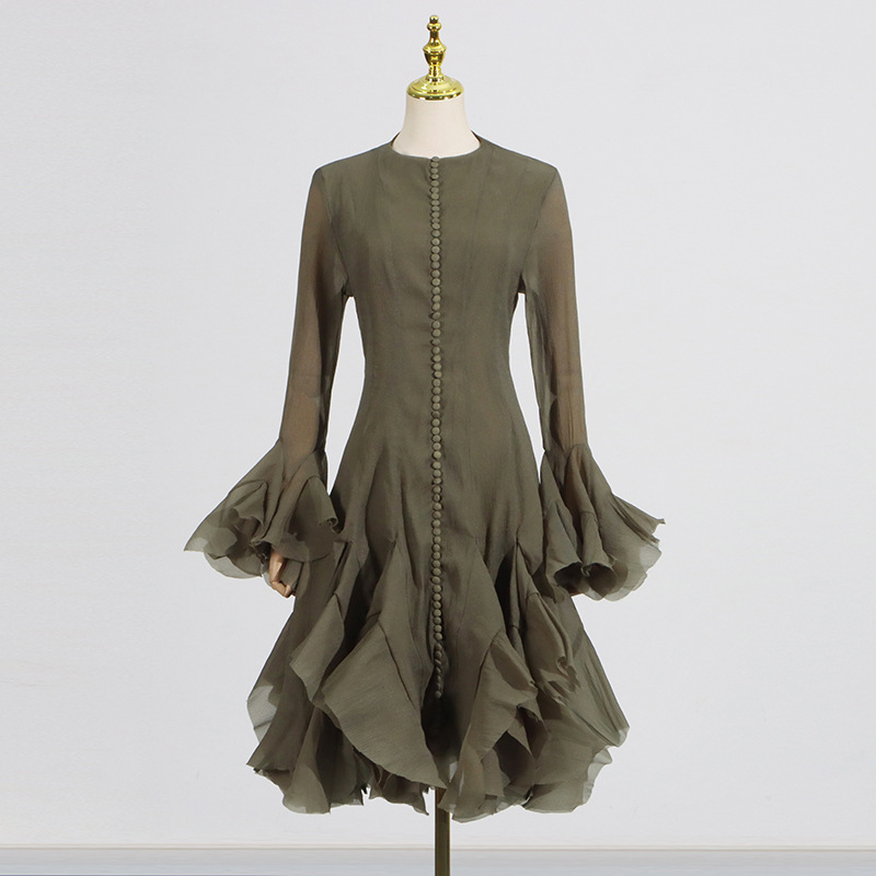 국경 간 핫 세일 러플 원피스 여성 여름 2025 새로운 패션 하이 칼라 긴팔 하이 엔드 웨이스트 미드 길이 원피스