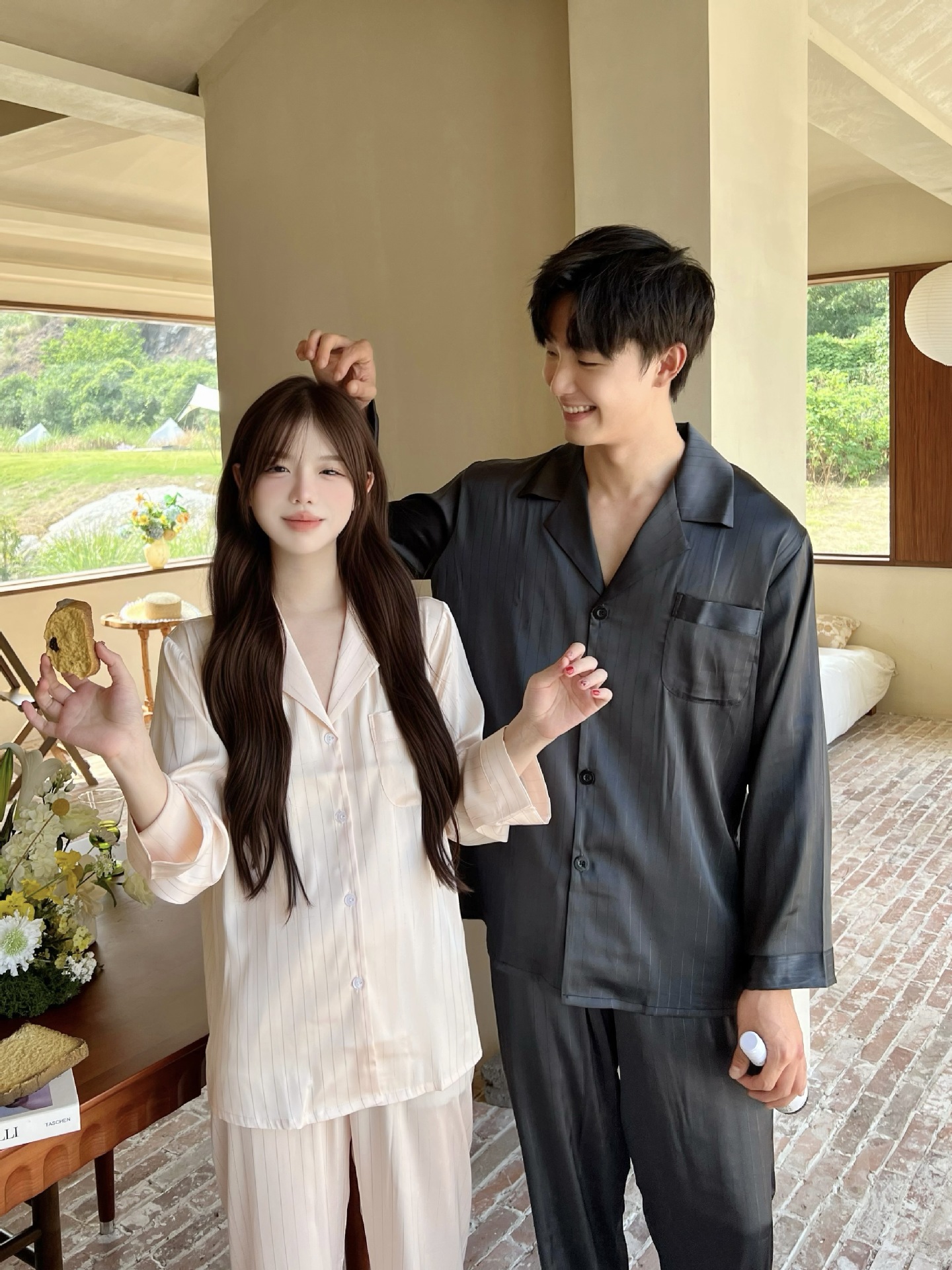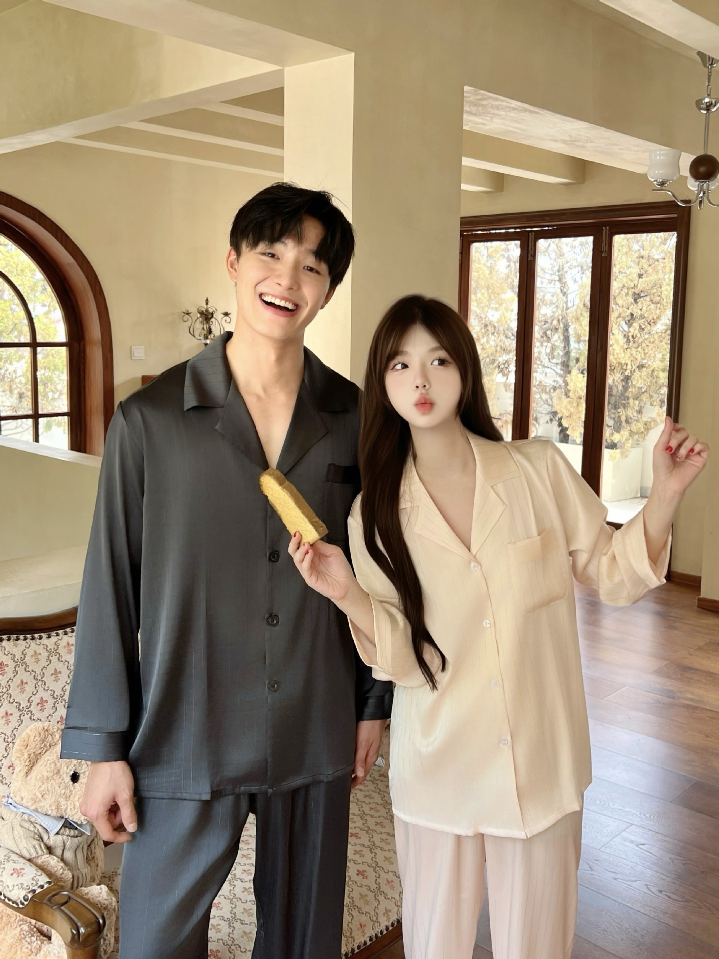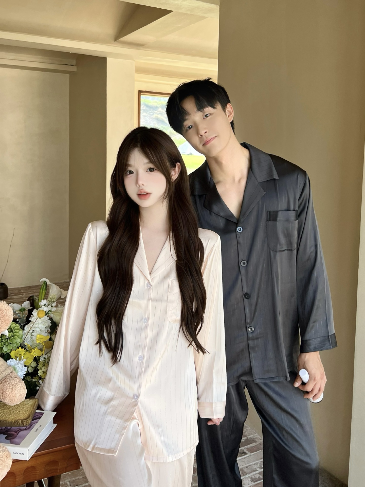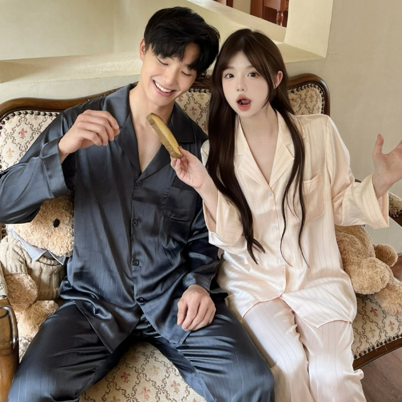 커플 핫 실버 심플 라이트 럭셔리 스타일 잠옷 이른 봄 얼음 실크 실크 긴팔 따뜻하고 편안한 남성과 여성을위한 홈웨어스토어 가기