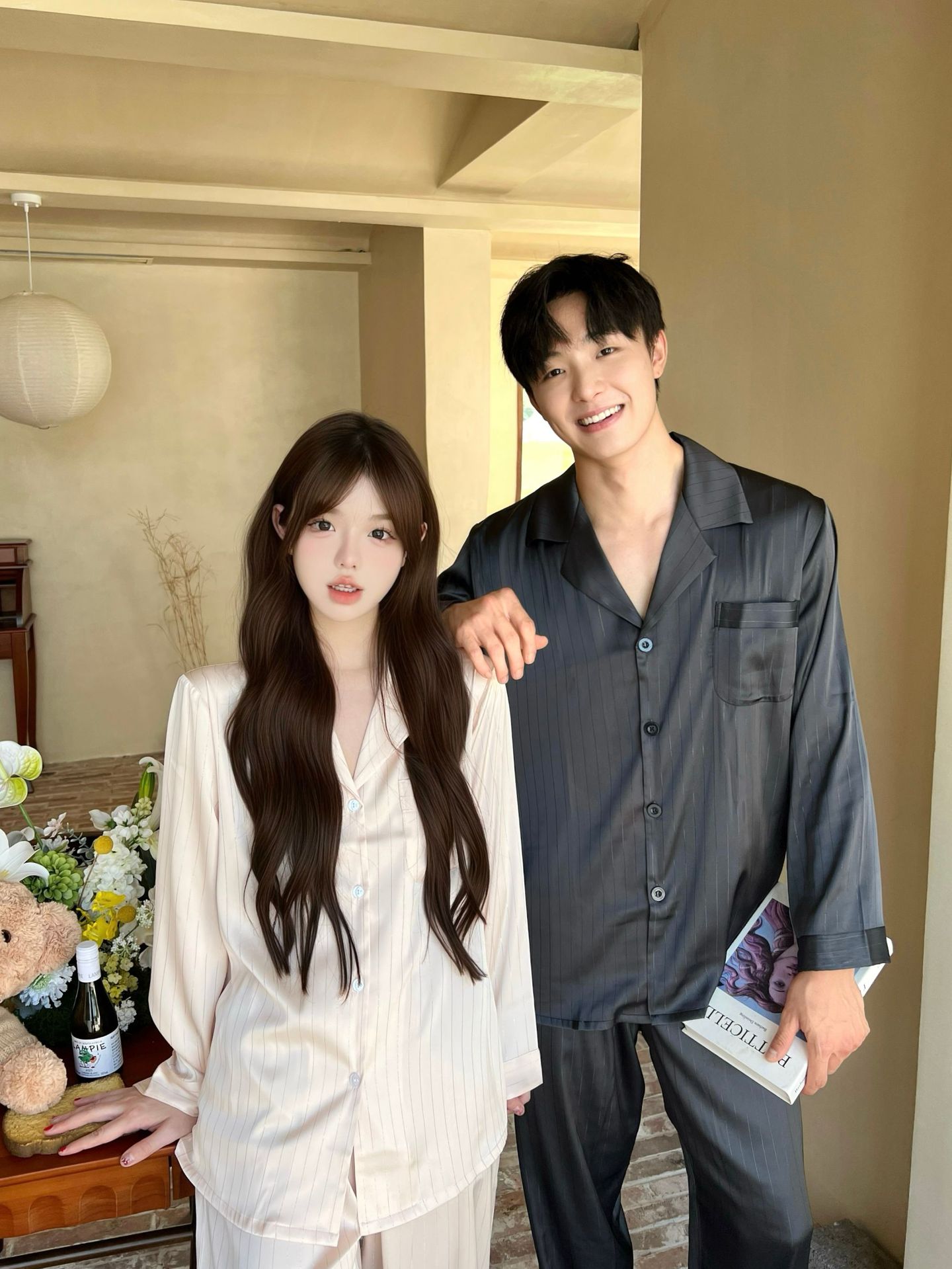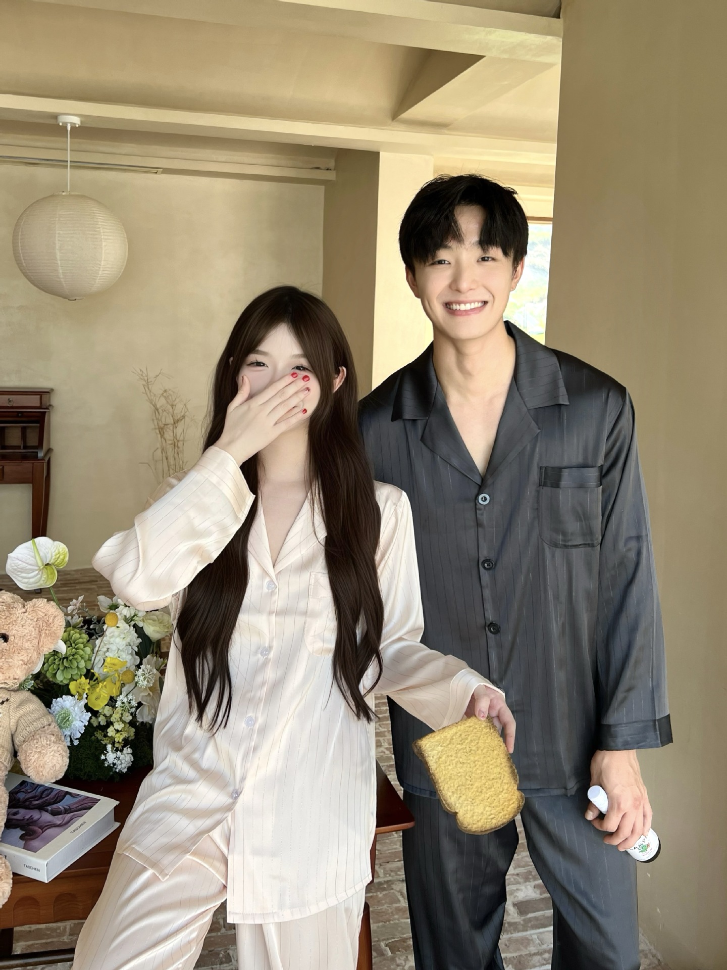 커플 핫 실버 심플 라이트 럭셔리 스타일 잠옷 이른 봄 얼음 실크 실크 긴팔 따뜻하고 편안한 남성과 여성을위한 홈웨어