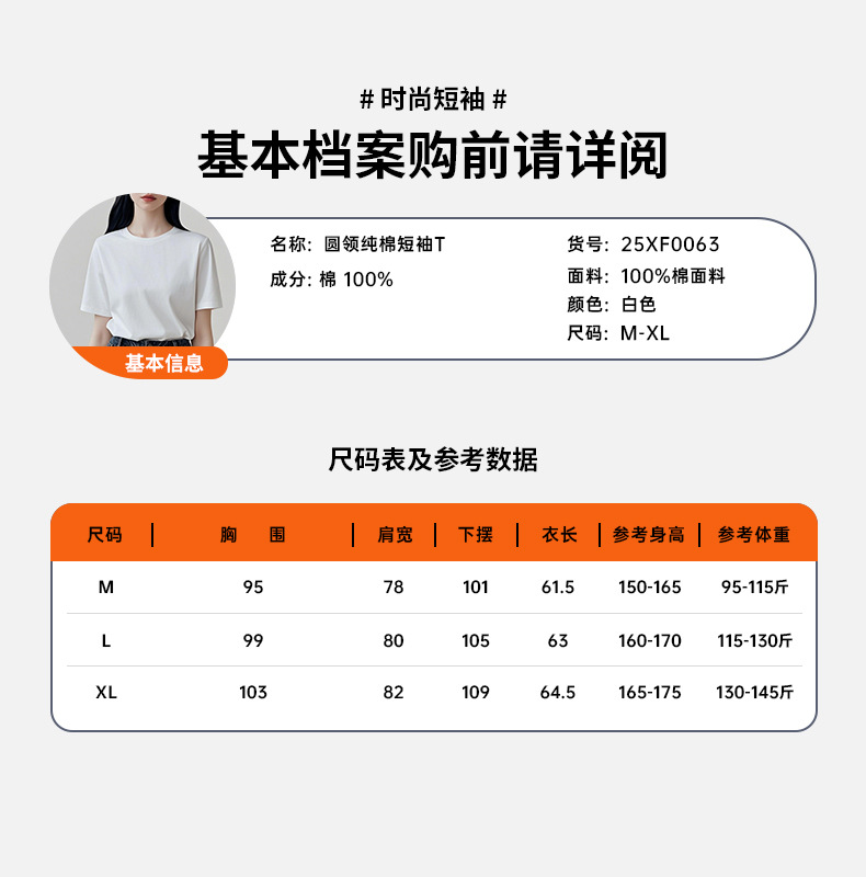 0063 봄 여름 100% 면 원단 라운드넥 순면 반팔 티셔츠 여성 루즈핏 상의 패셔너블한 이너웨어 일본 및 한국 캐주얼