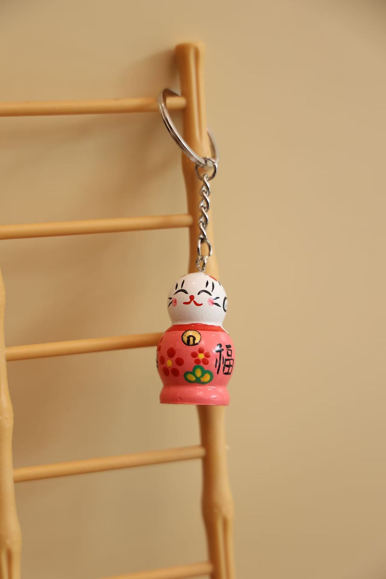 • 나무 행운의 고양이 열쇠고리 (핑크)