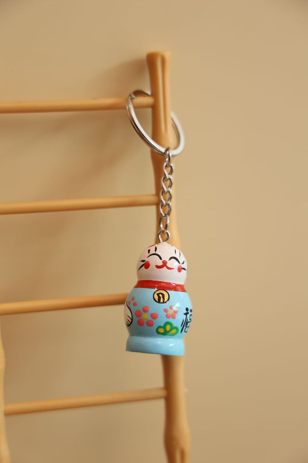 • 나무 행운의 고양이 열쇠고리 (블루)
