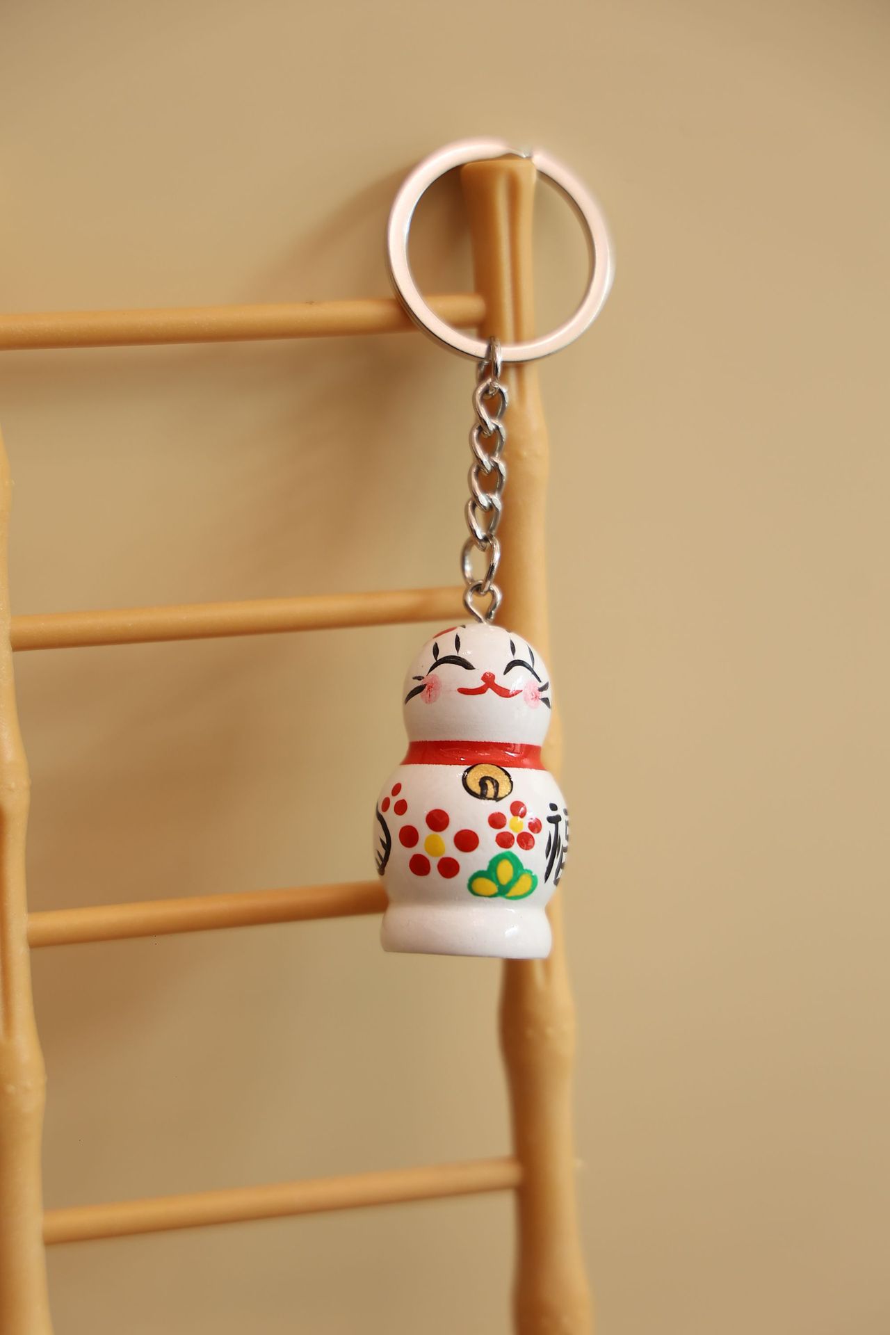 • 나무 행운의 고양이 열쇠고리 (화이트)