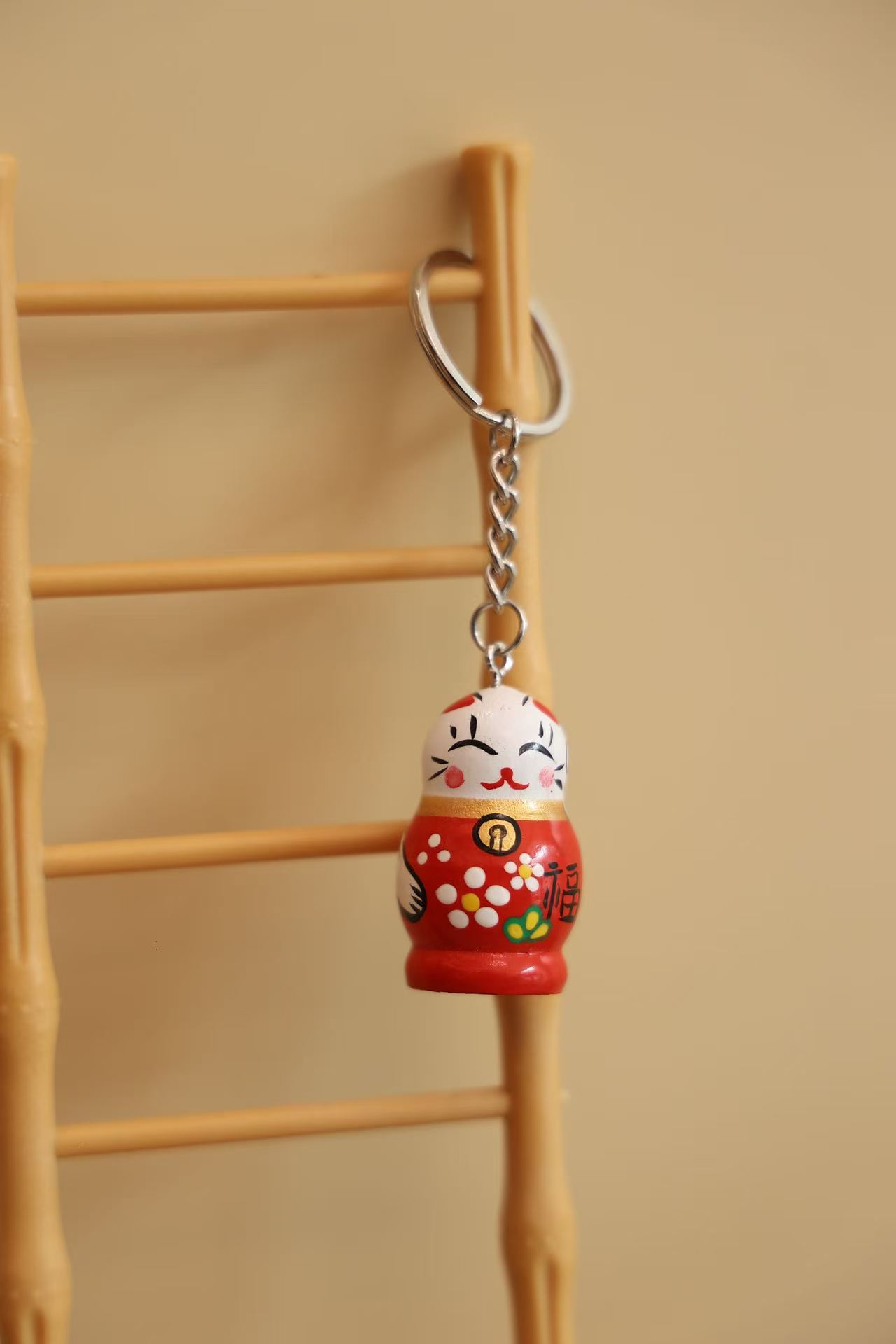 • 나무 행운의 고양이 열쇠고리 (빨간색)