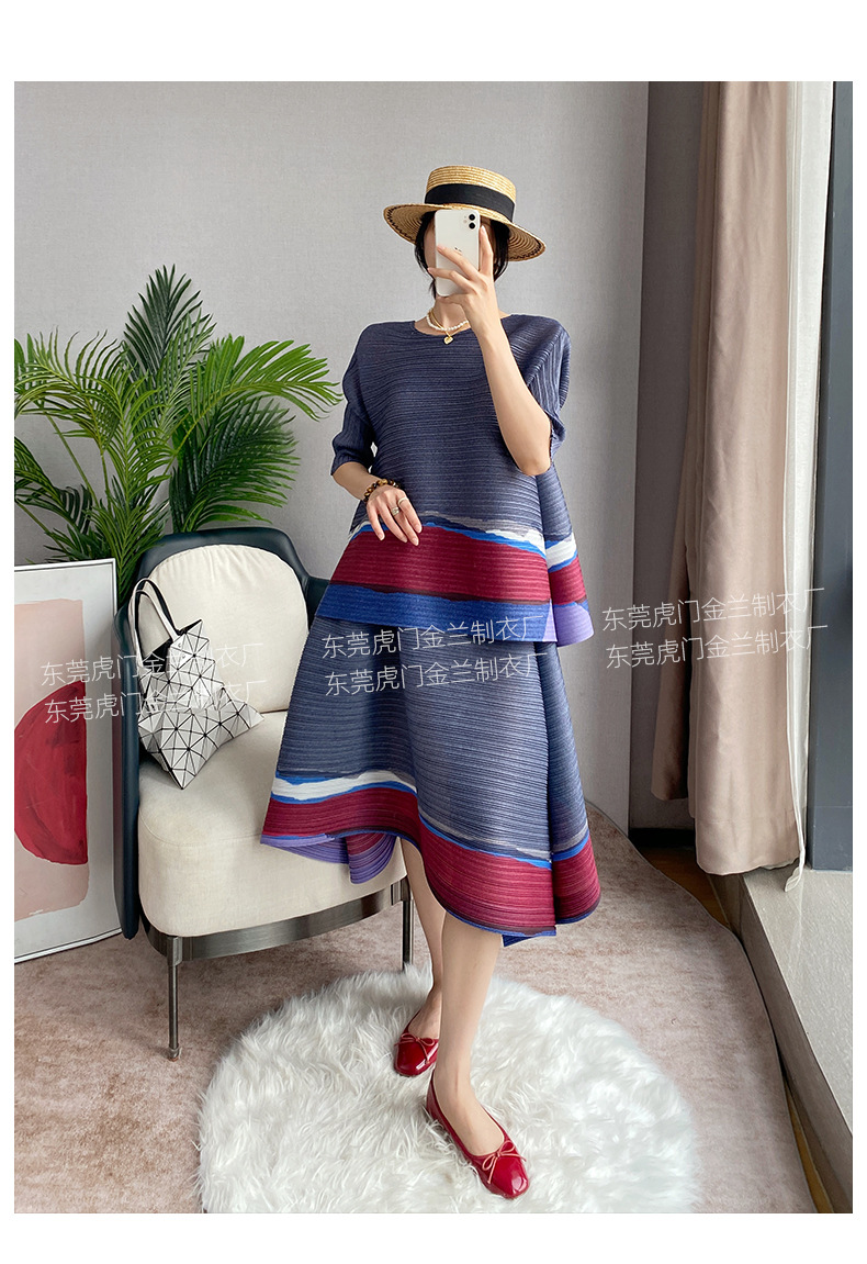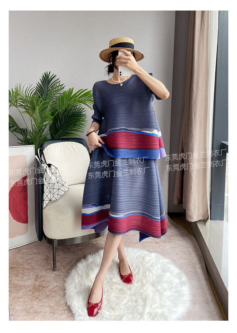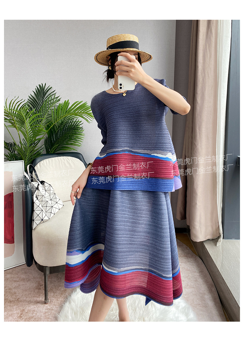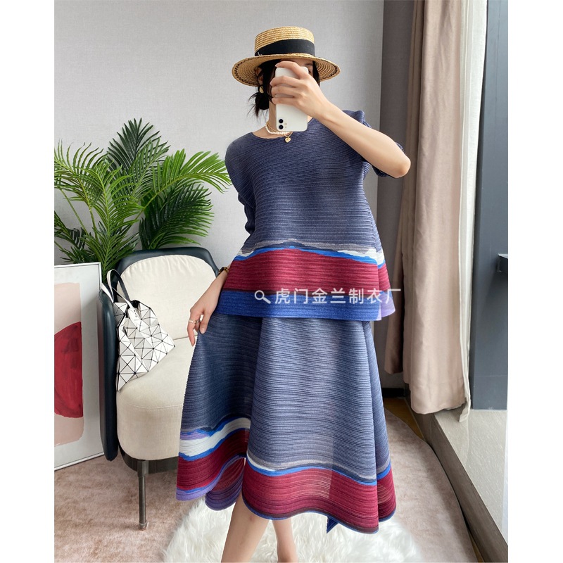 Miyake Loose 플러스 사이즈 패션 세트 여성의 봄과 여름 대비 최고 배꼽 커버 A 라인 스커트 주름 2 피스 세트