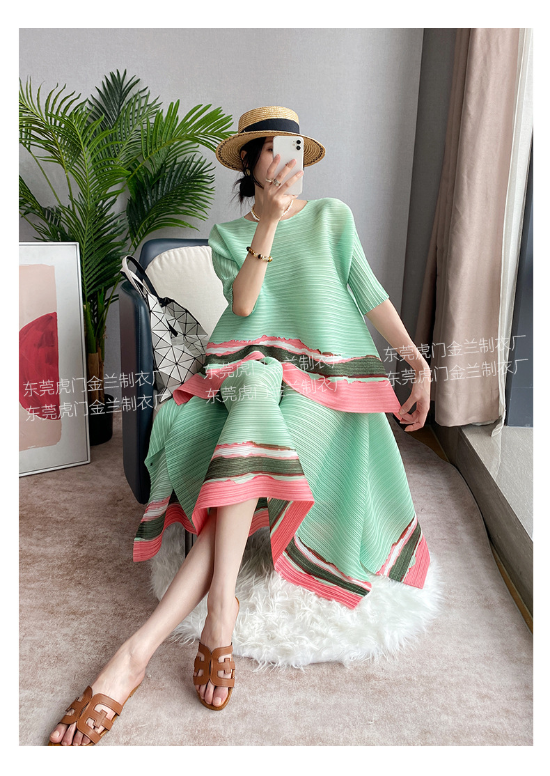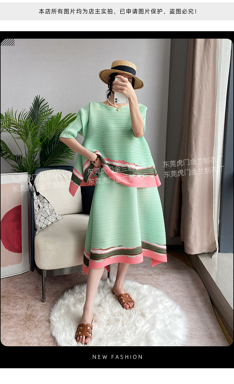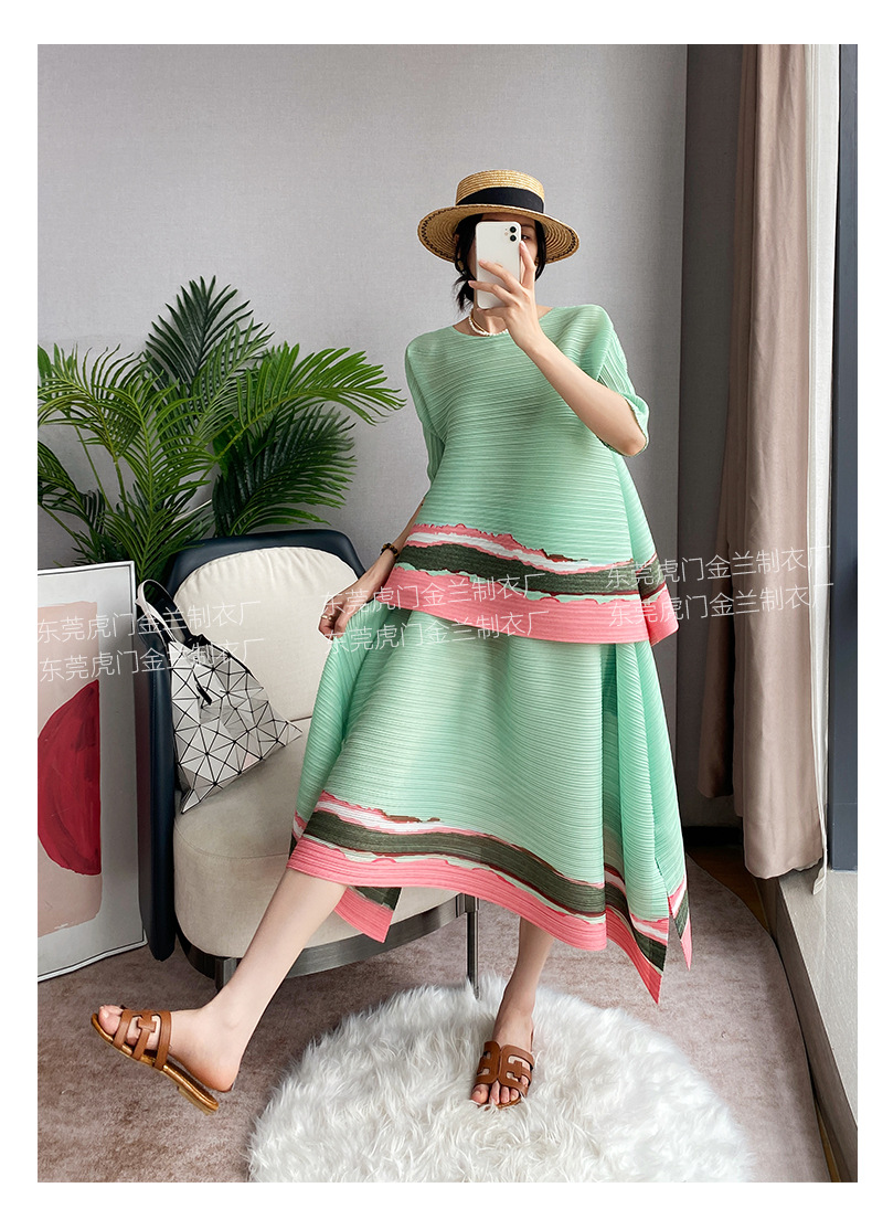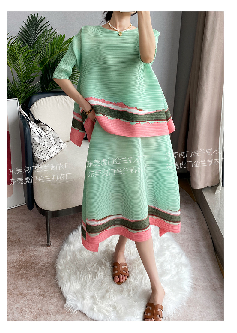 Miyake Loose 플러스 사이즈 패션 세트 여성의 봄과 여름 대비 최고 배꼽 커버 A 라인 스커트 주름 2 피스 세트