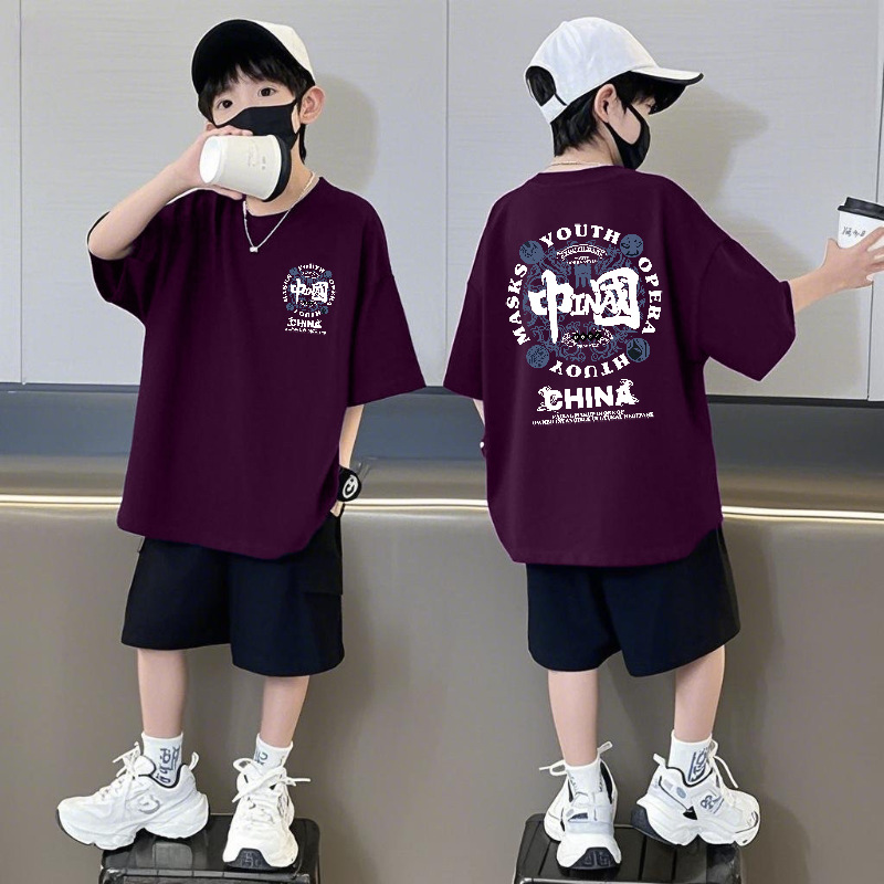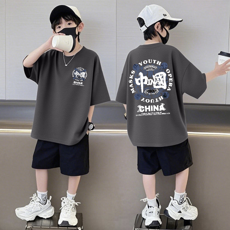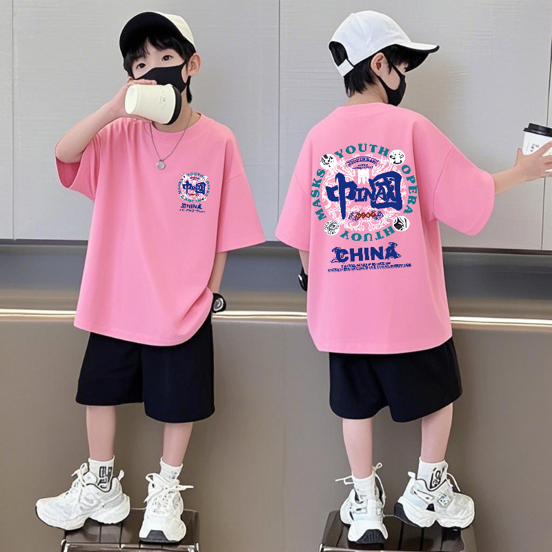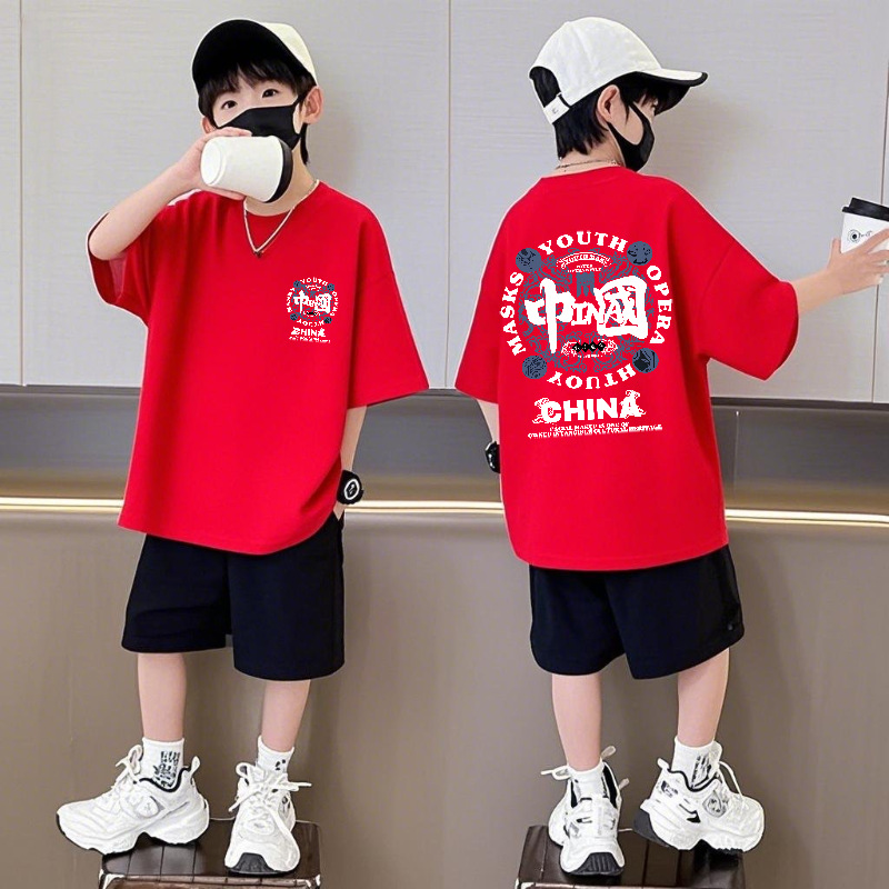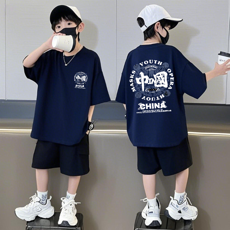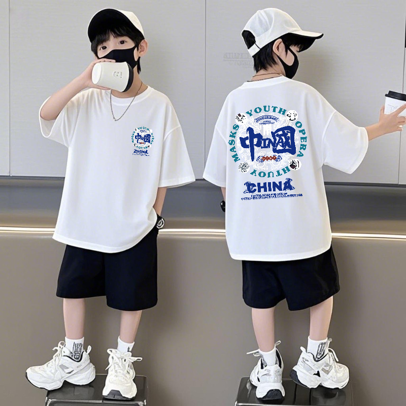 순면 반팔 반바지 소년 정장 어린이 느슨한 라운드 넥 여름 새로운 스타일 중대형 어린이 국가 트렌드 캐주얼 투피스 세트