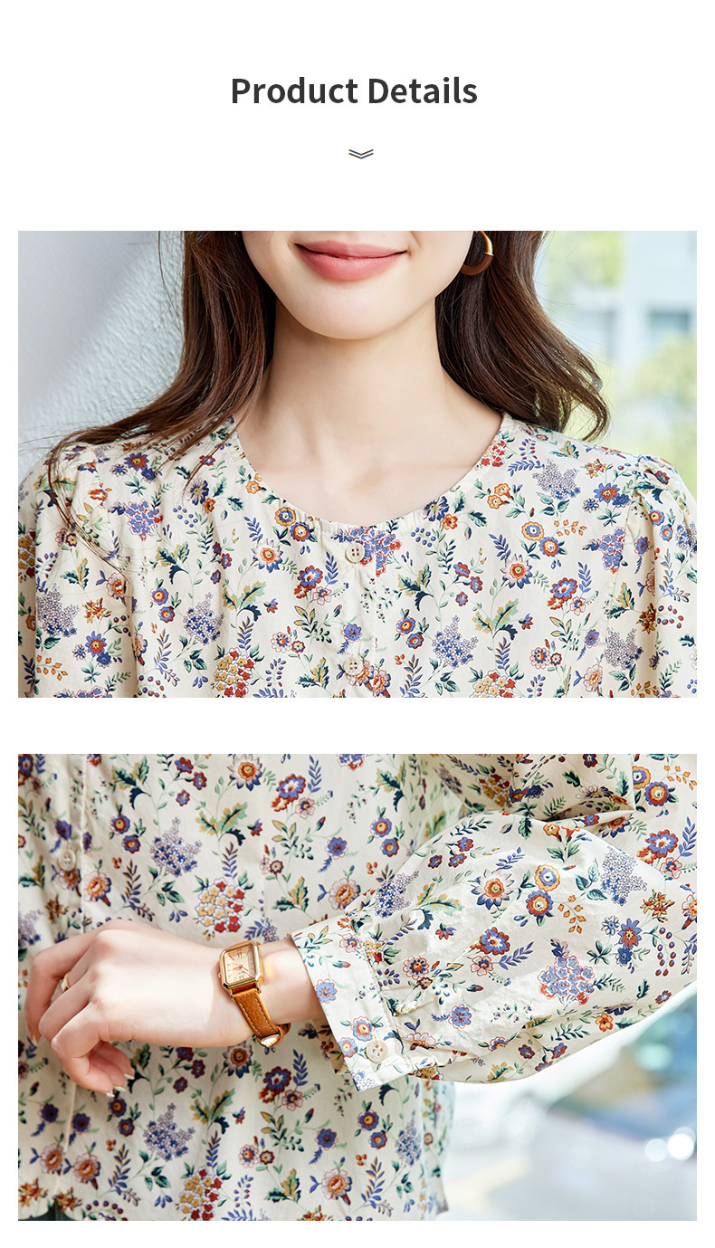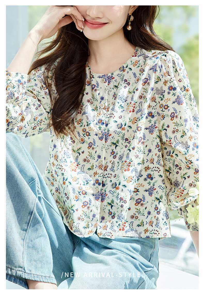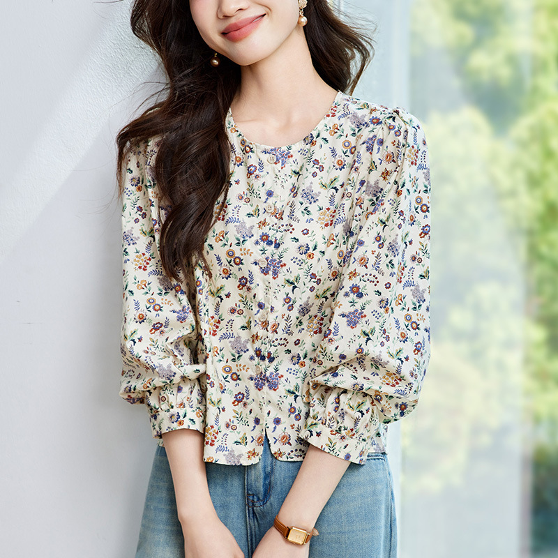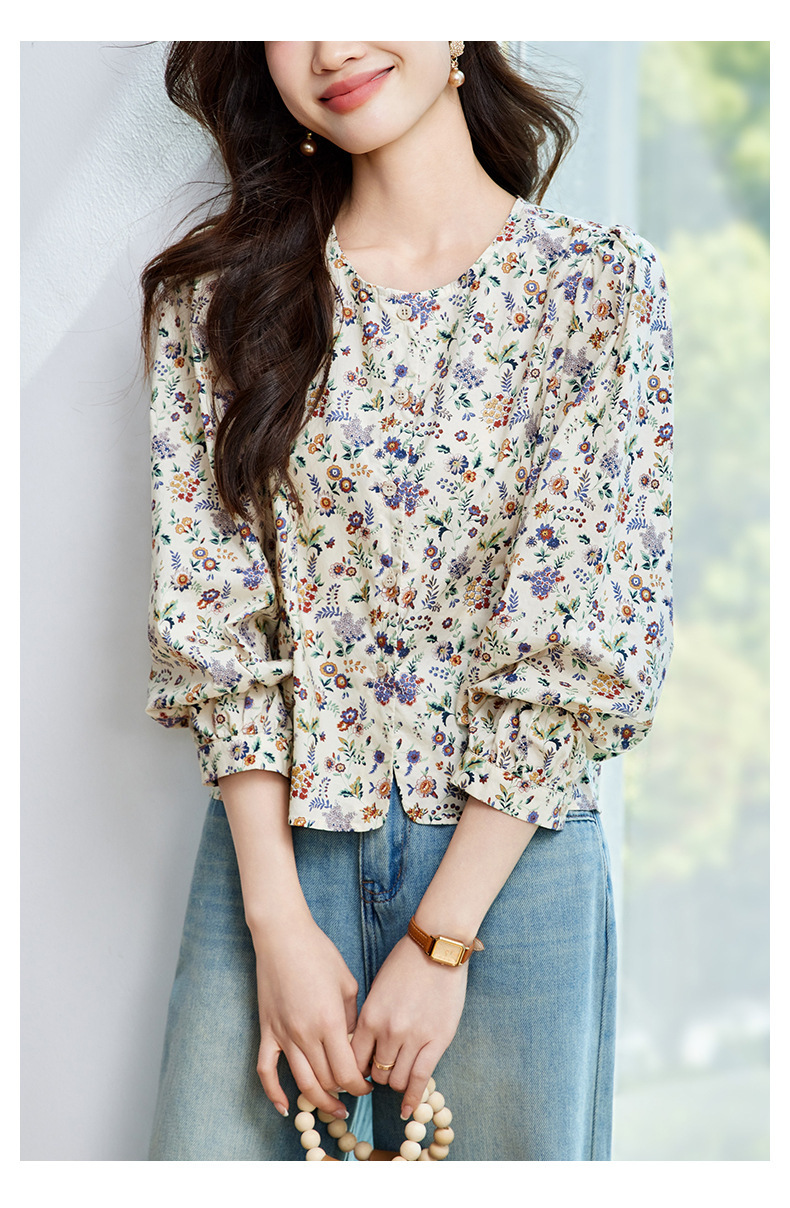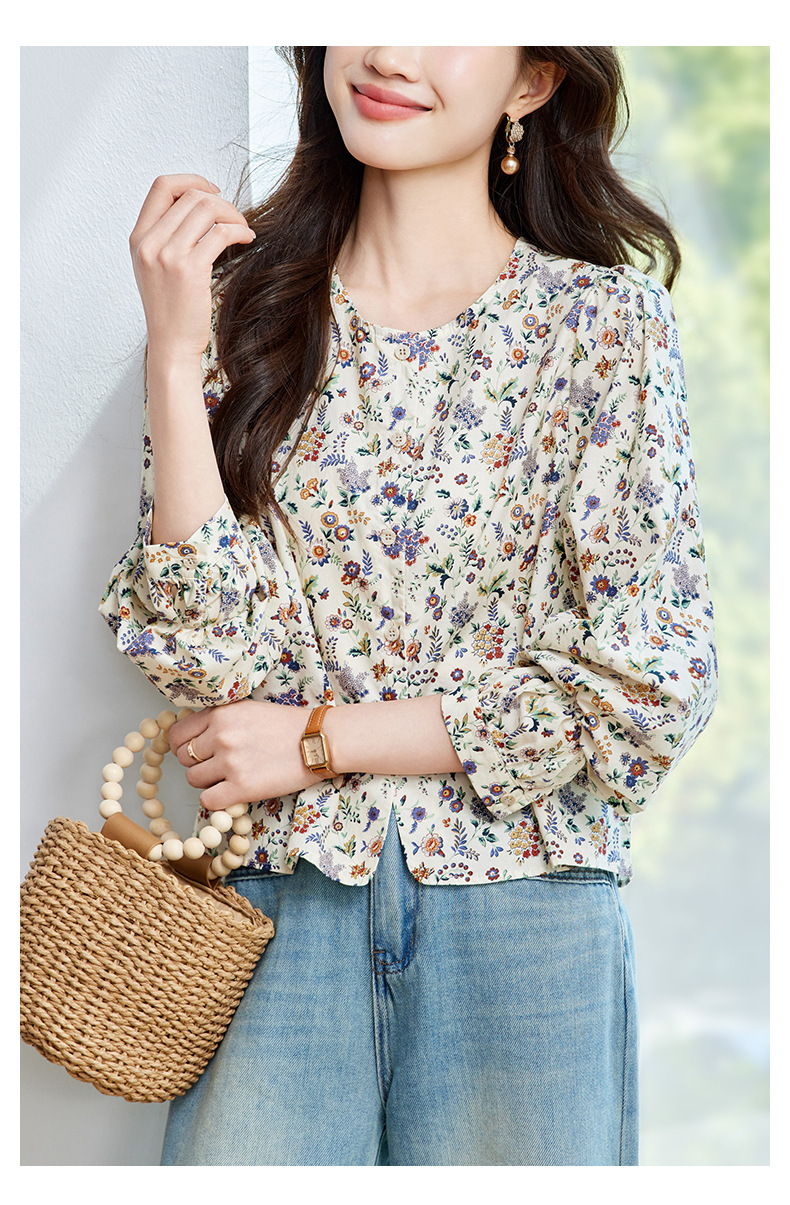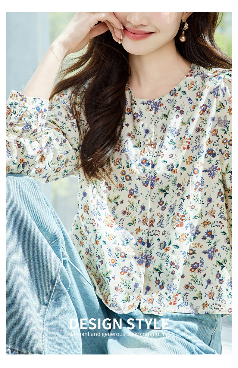 꽃 셔츠 여성용 긴팔 2025 여름 얇은 목가위 느슨한 캐주얼 라운드 넥 셔츠스토어 가기