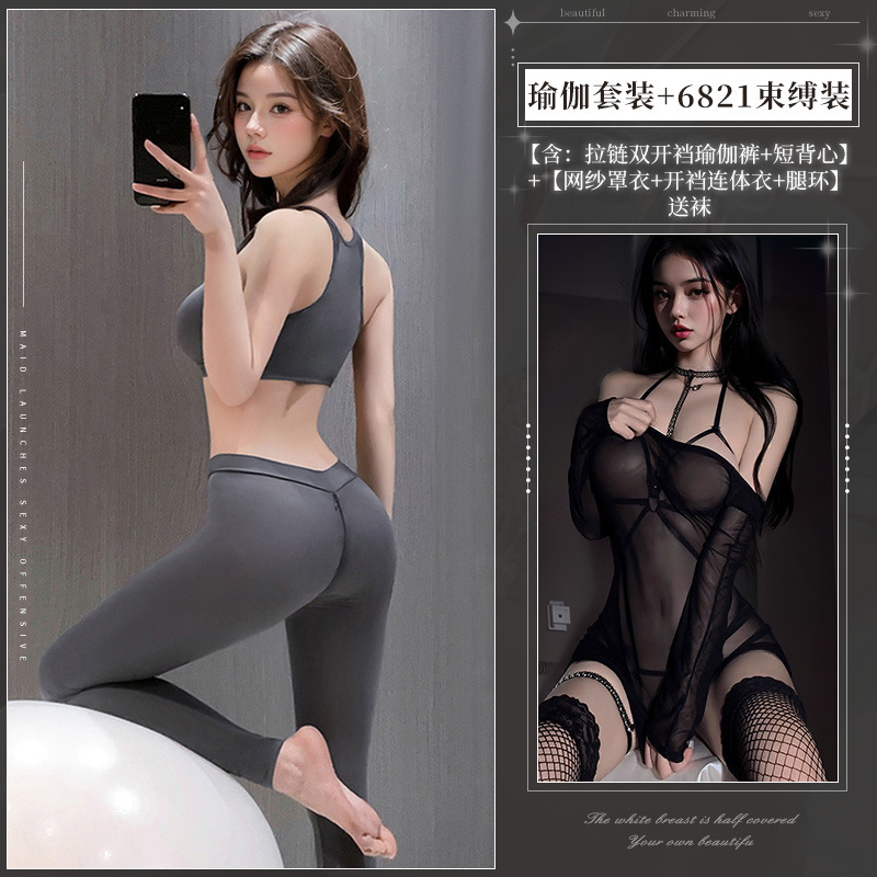 • ******그레이【지퍼 더블 가랑이 요가 세트】+6821 본디지 세트(양말 포함)******