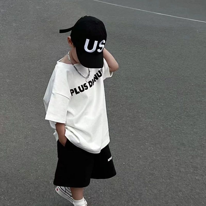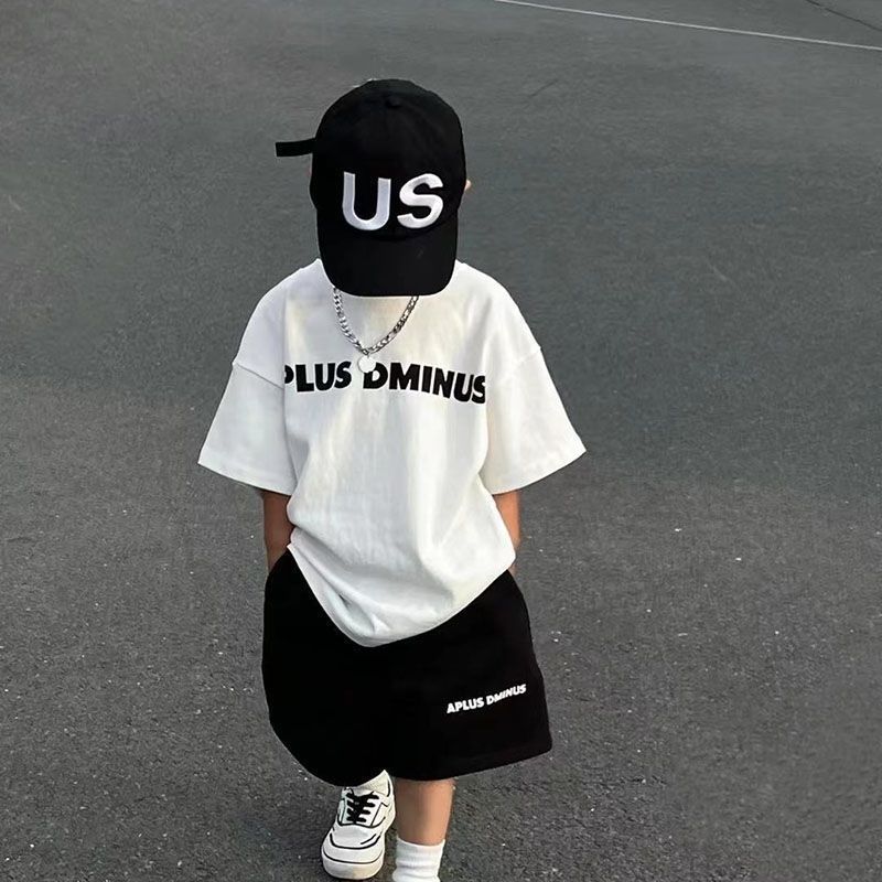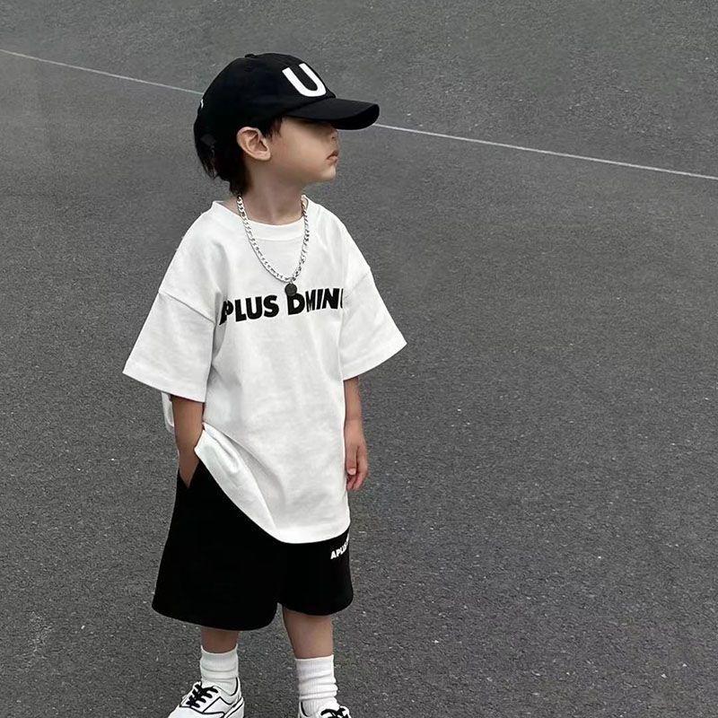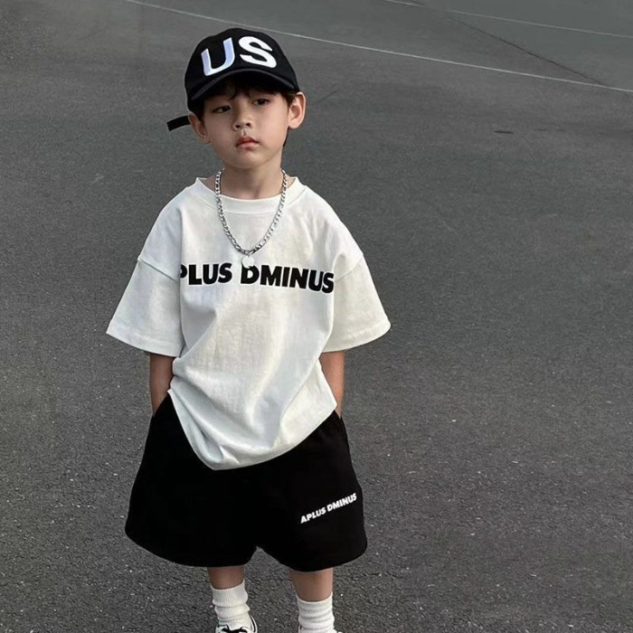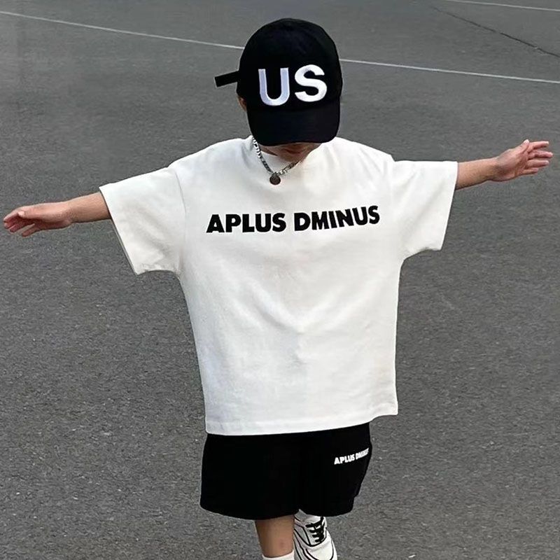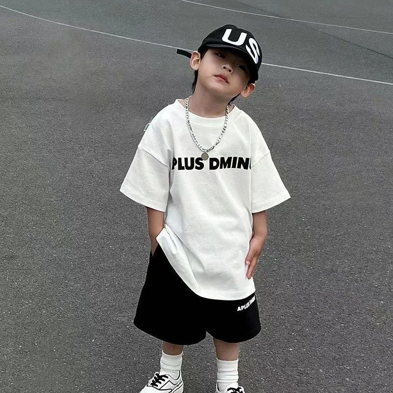 인터넷 연예인 소년 한국 스타일 스포츠 정장 큰 어린이를위한 새로운 여름 스타일 서양식 문자 인쇄 반팔 반바지 투피스 세트