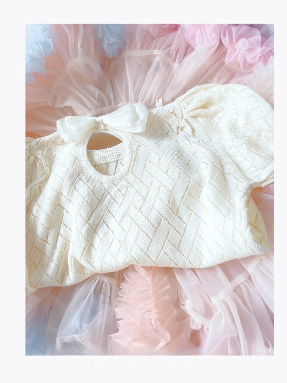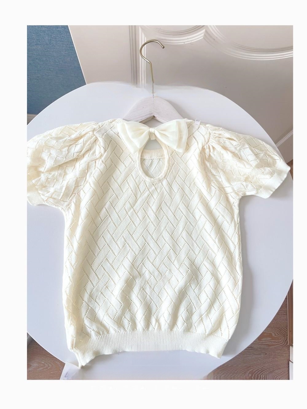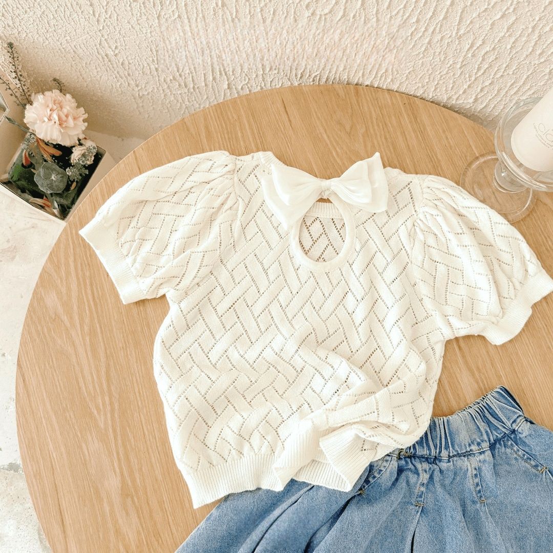 여름 아동복 소녀 니트 아이스 실크 반팔 얇은 활 할로우 반팔 퍼프 슬리브 탑