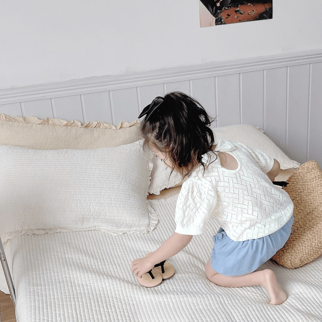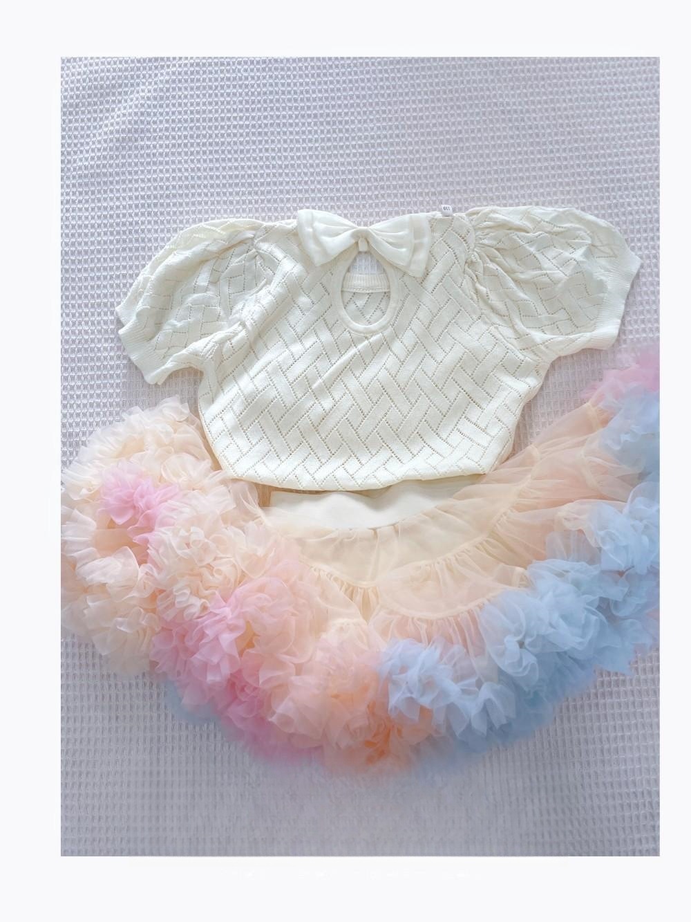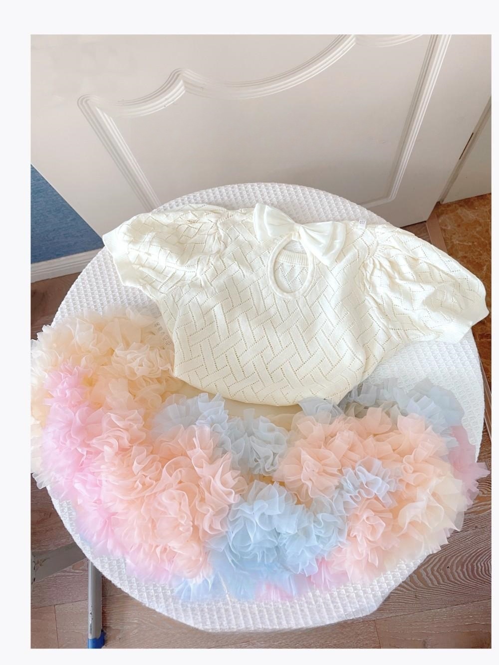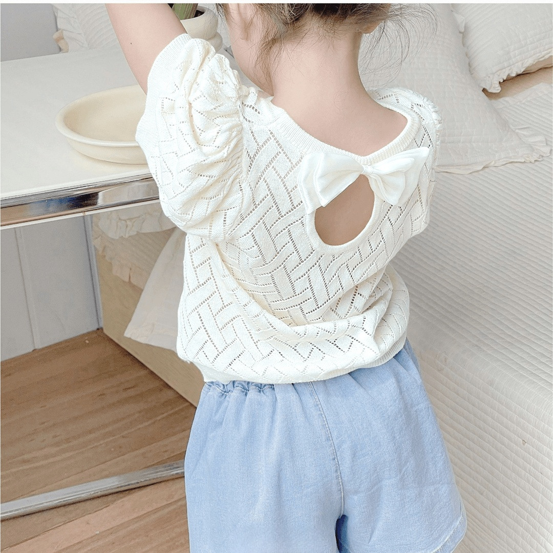 여름 아동복 소녀 니트 아이스 실크 반팔 얇은 활 할로우 반팔 퍼프 슬리브 탑