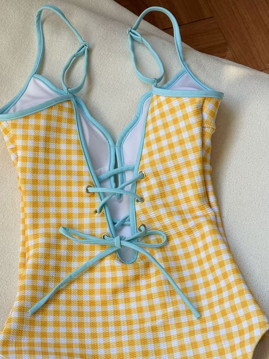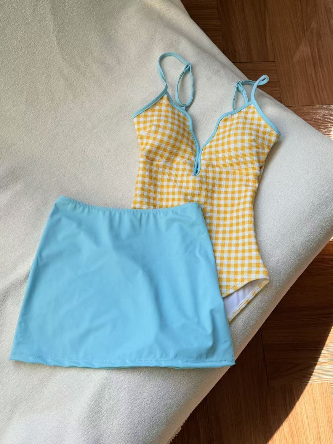 高颜值小清新纯欲风少女黄蓝格子连体游泳衣女两件套遮肉显瘦温泉