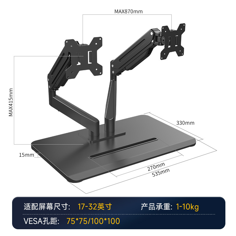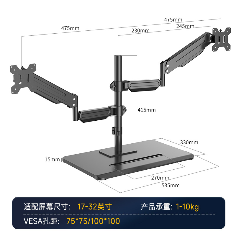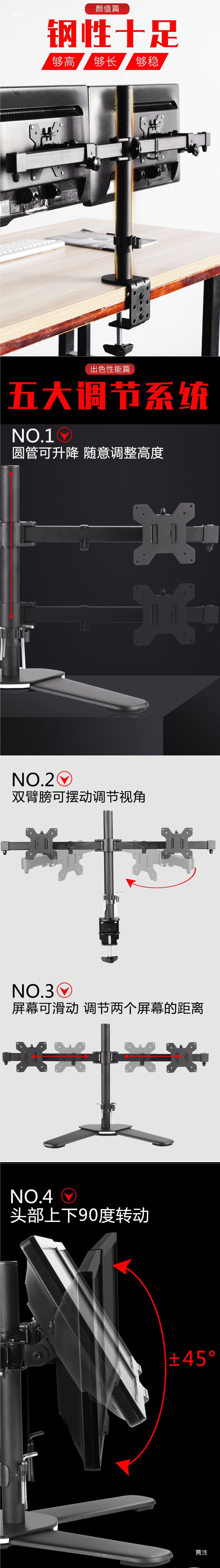 • [듀얼 스크린 데스크탑 컬럼 모델] 17-32inch개의 디스플레이 화면에 적합, 양쪽 암의 내하중 용량은 20KG, 양쪽 암은 위아래로 조정 가능