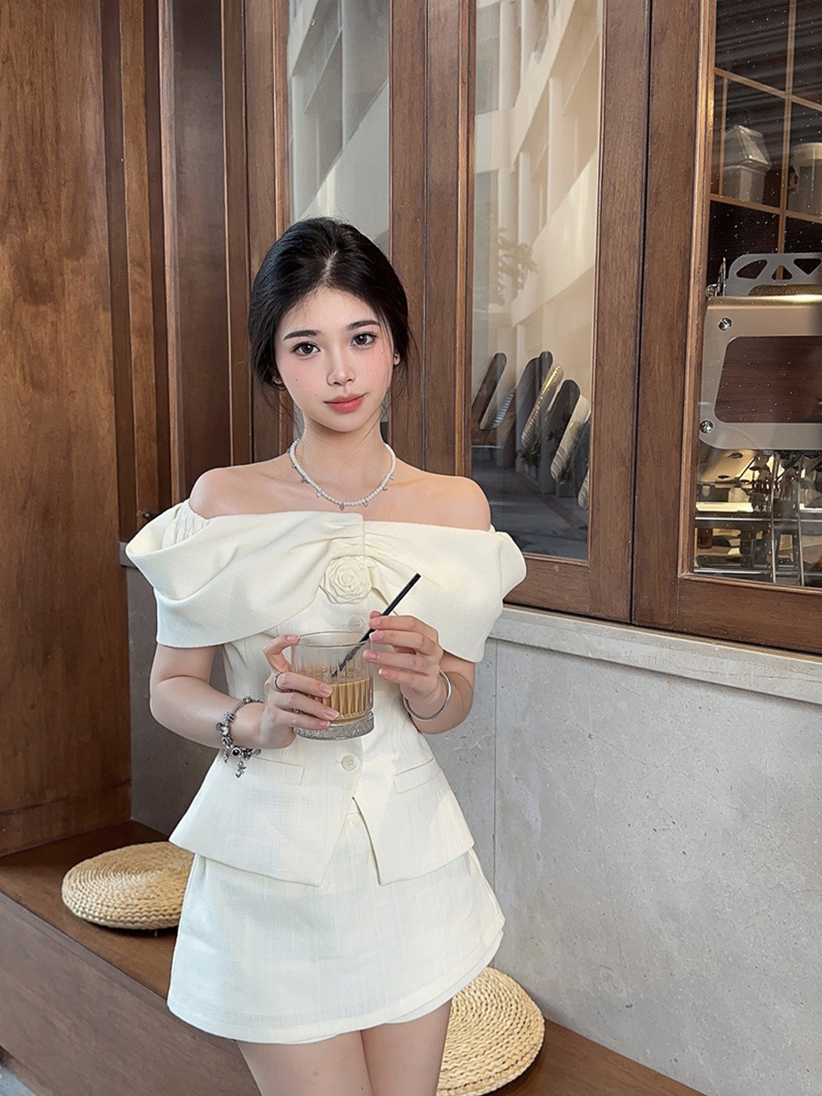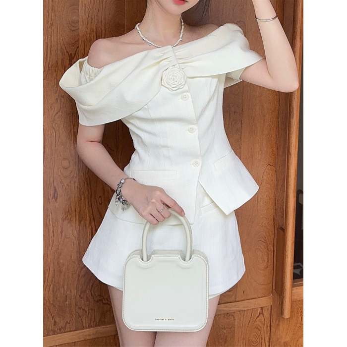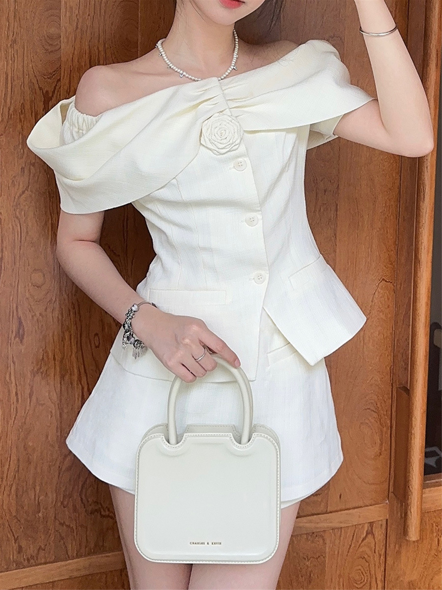 여름 싱글 브레스트 탑, 허리 높은 반바지, 짧은 스커트, 패셔너블한 투피스 세트, 밀크 화이트 원 숄더 여성용 작은 향기로운 슈트스토어 가기