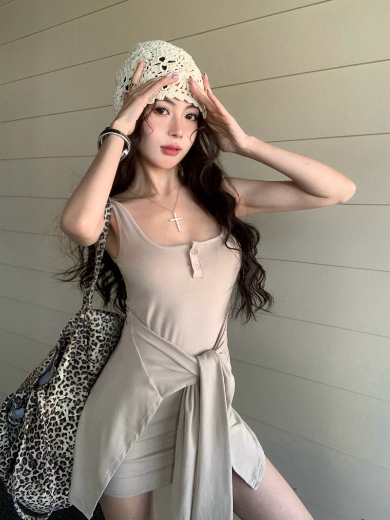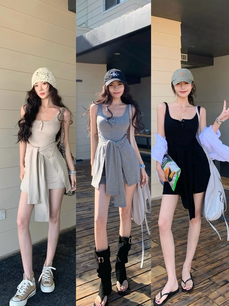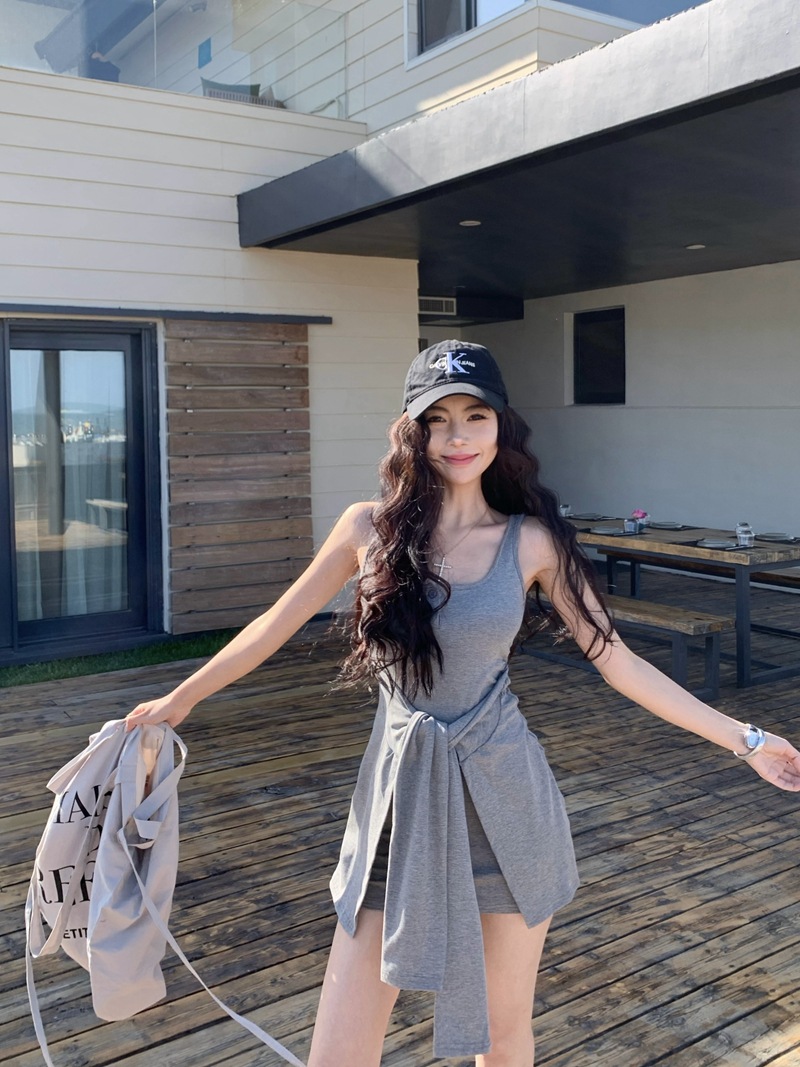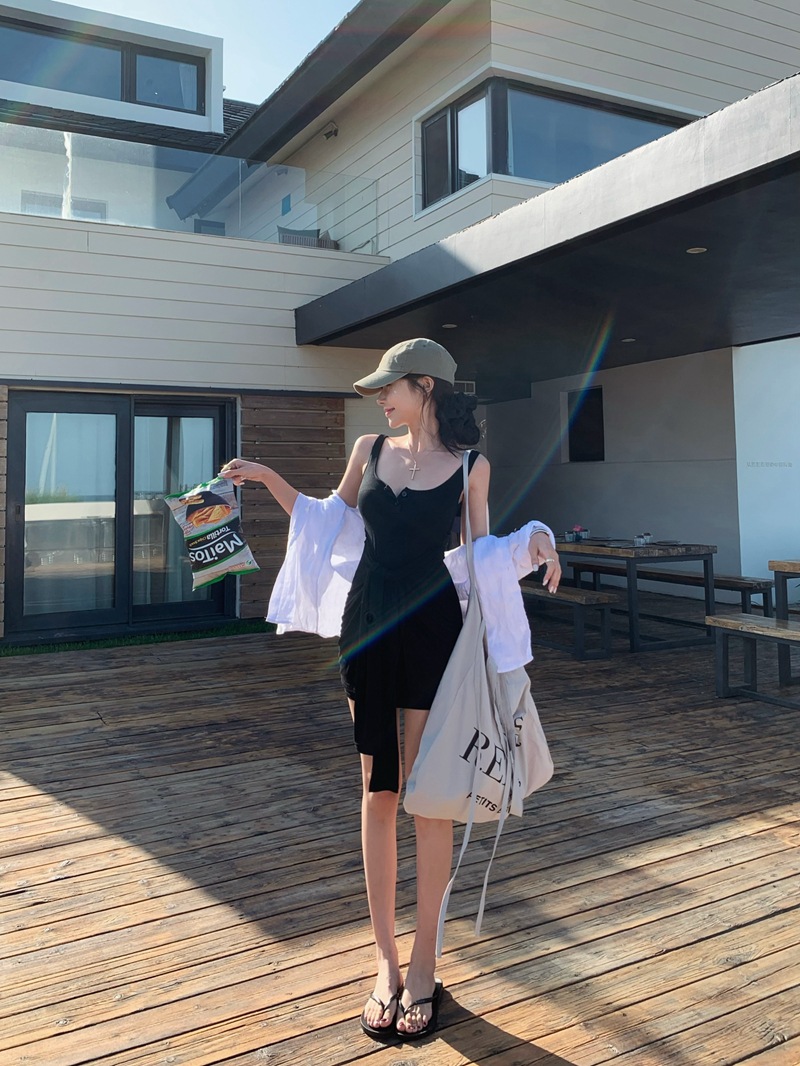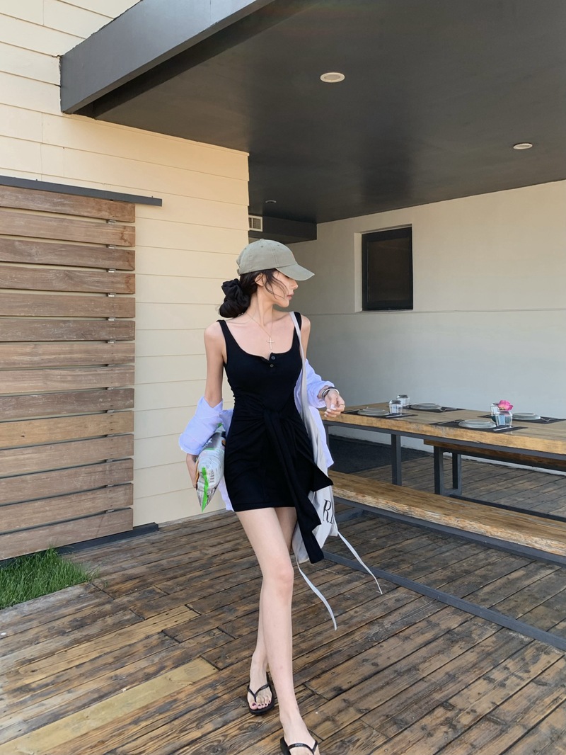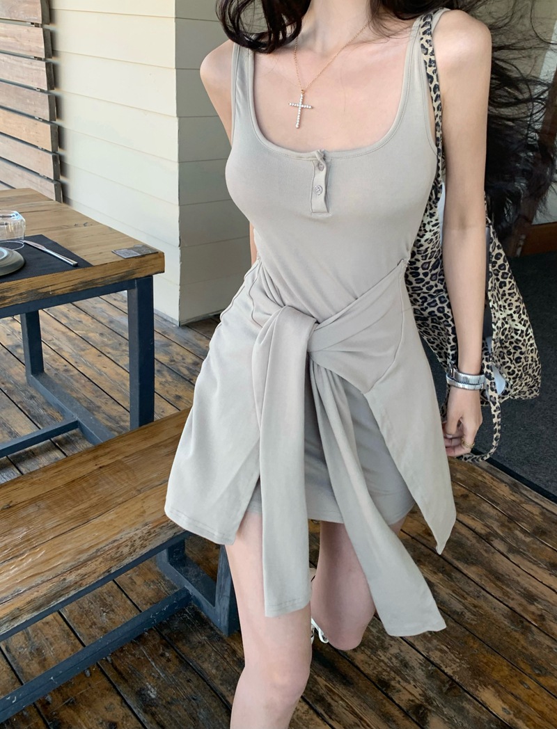 섹시한 핫걸 스타일 디자인의 슬림핏 가짜 투피스 조끼 서스펜더 드레스(가슴 패드 포함) 81477