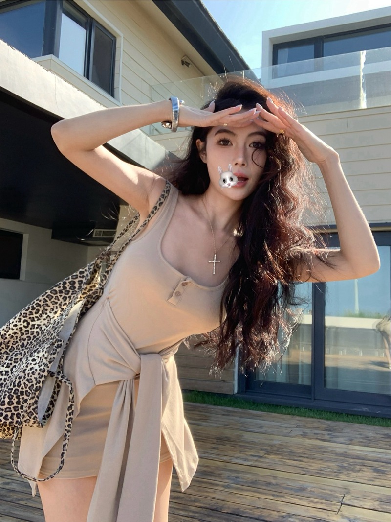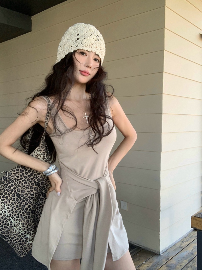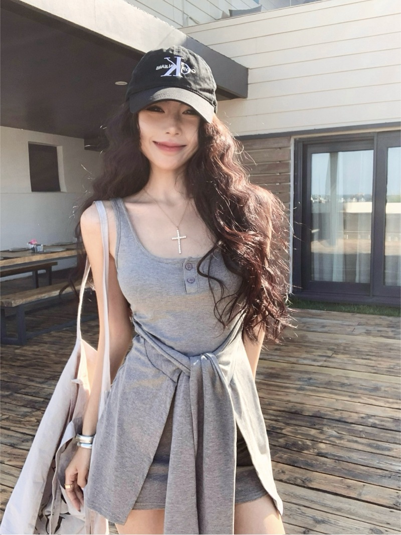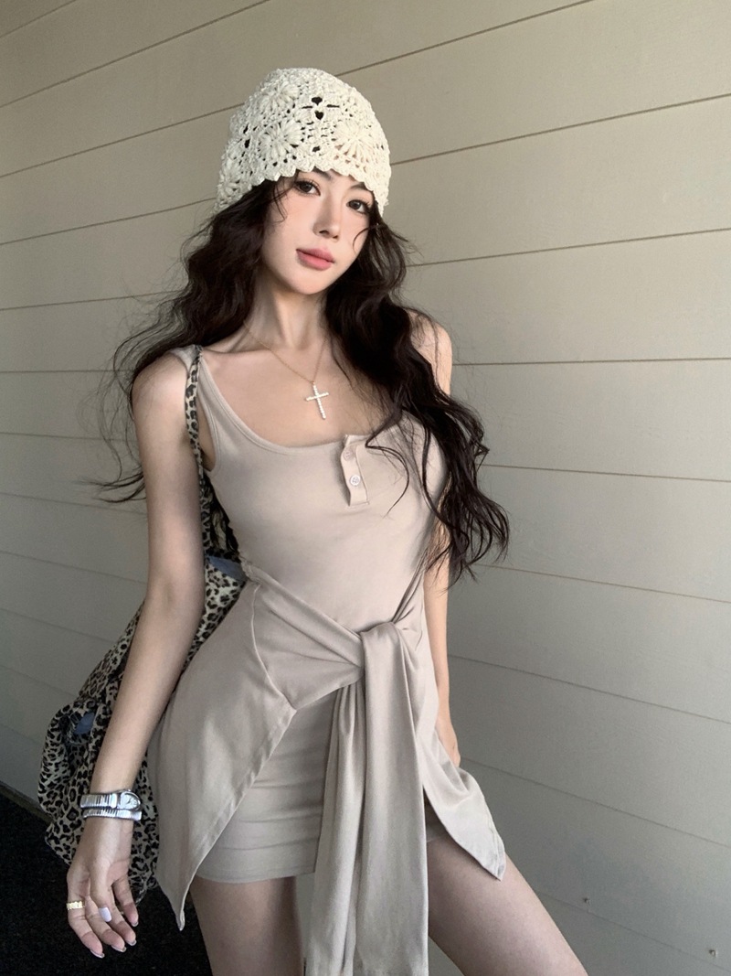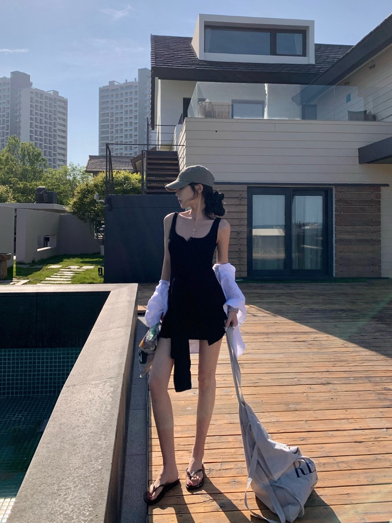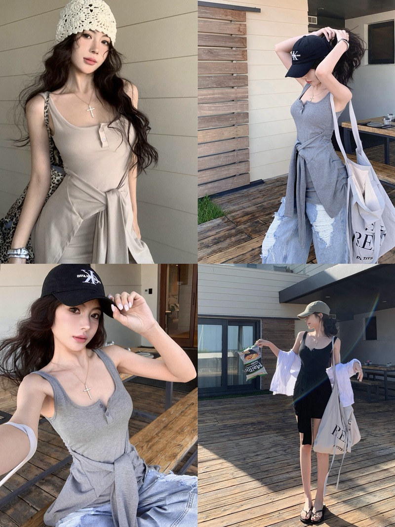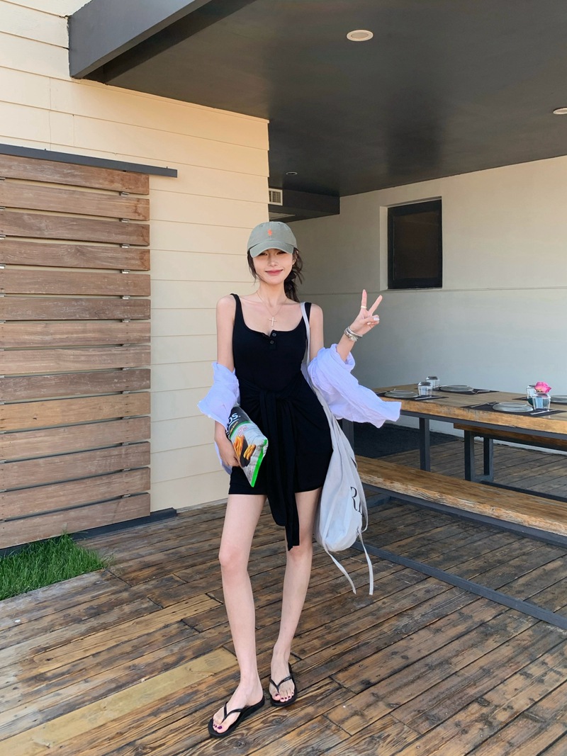 섹시한 핫걸 스타일 디자인의 슬림핏 가짜 투피스 조끼 서스펜더 드레스(가슴 패드 포함) 81477