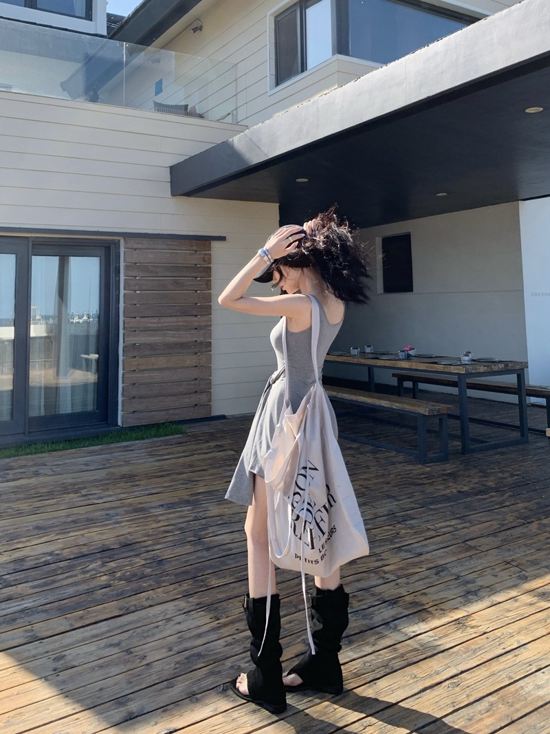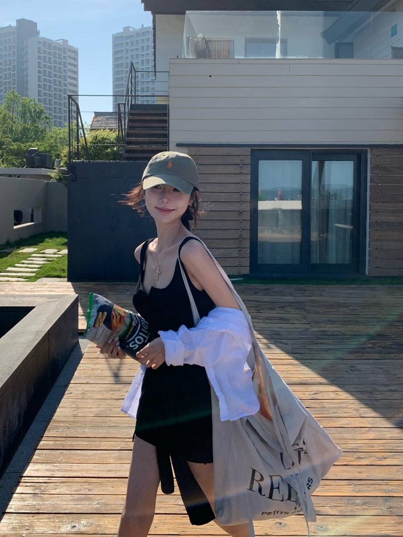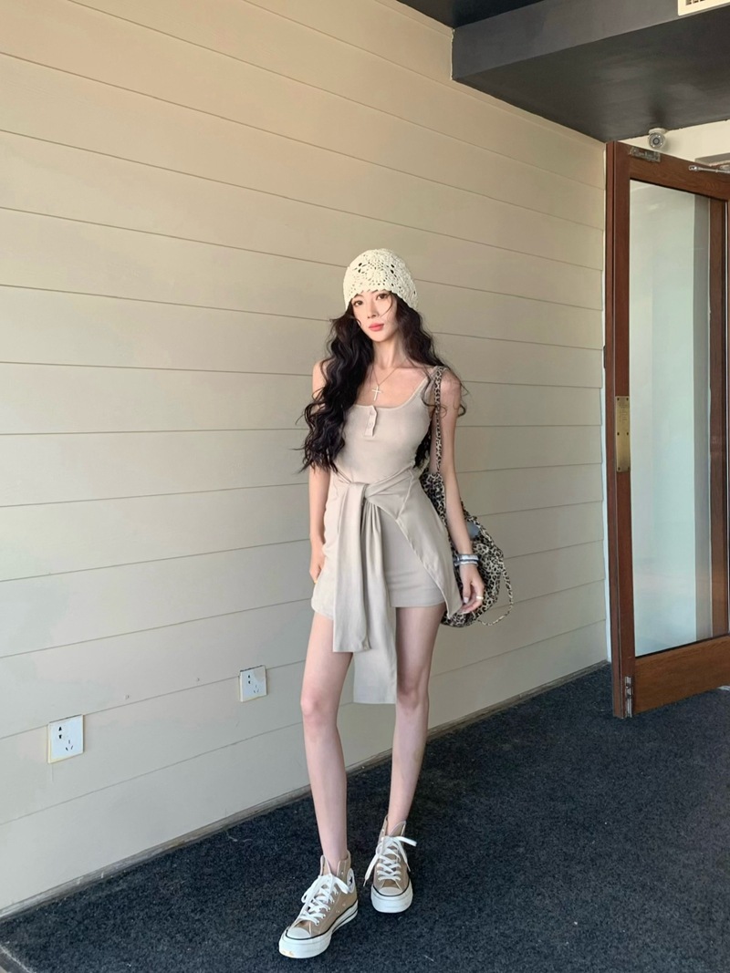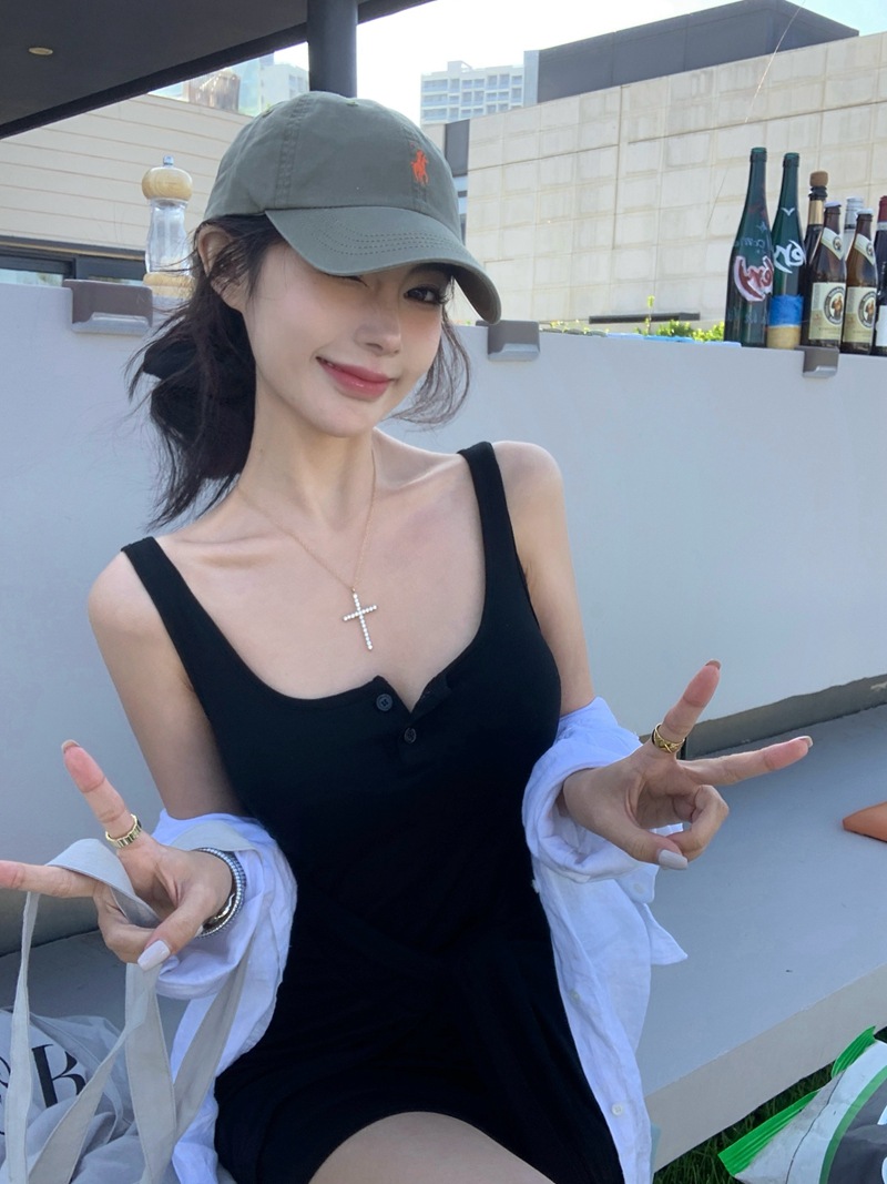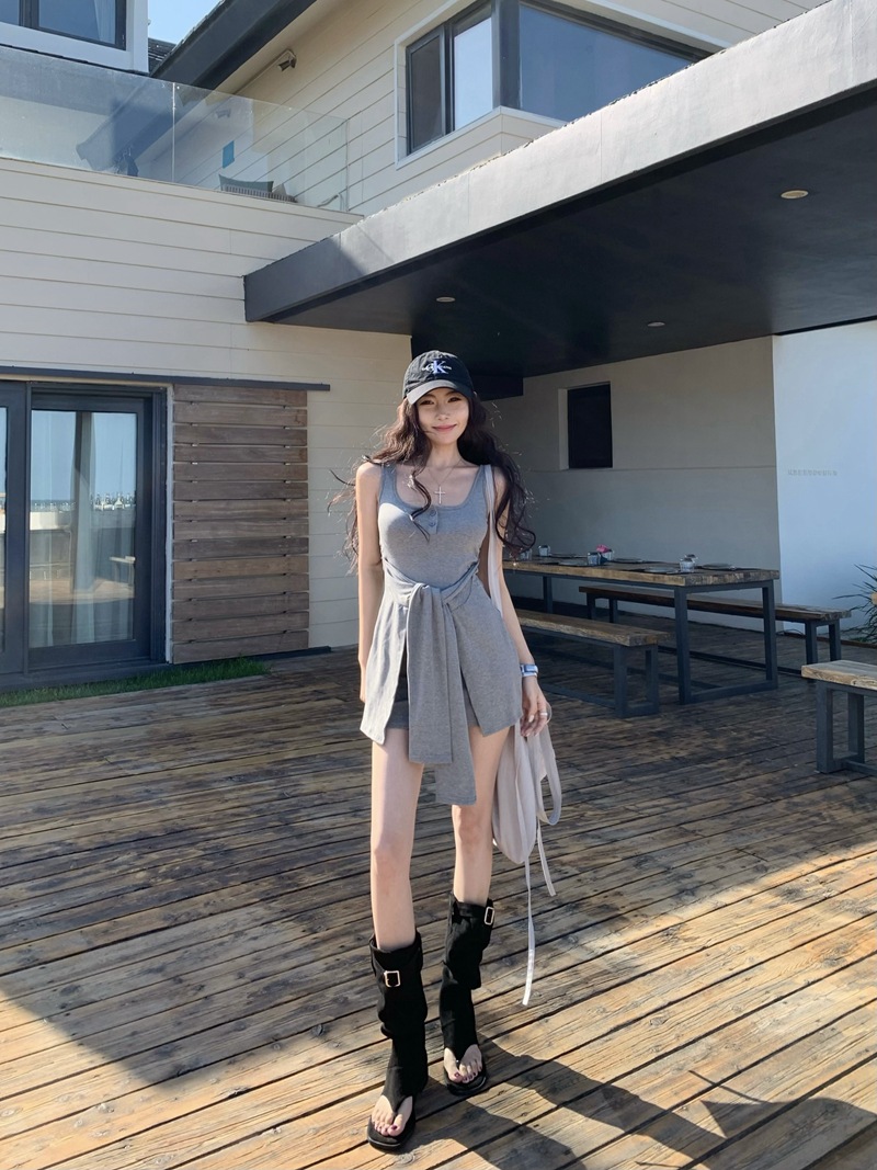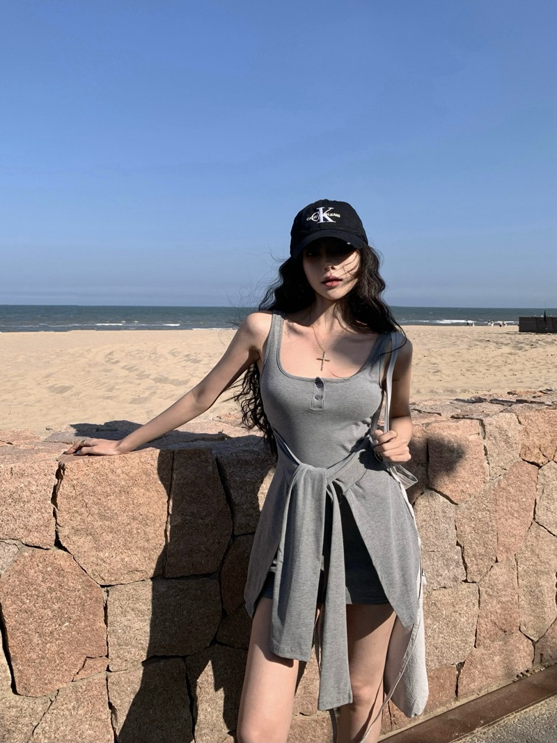 섹시한 핫걸 스타일 디자인의 슬림핏 가짜 투피스 조끼 서스펜더 드레스(가슴 패드 포함) 81477