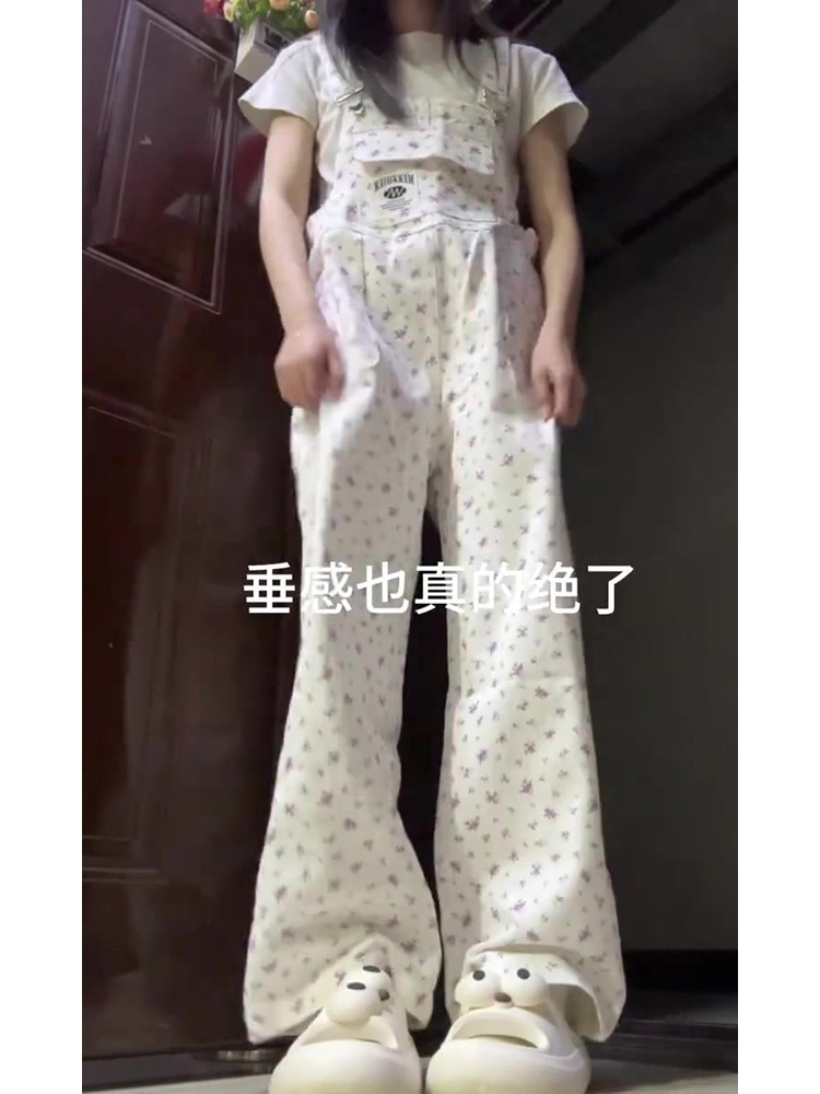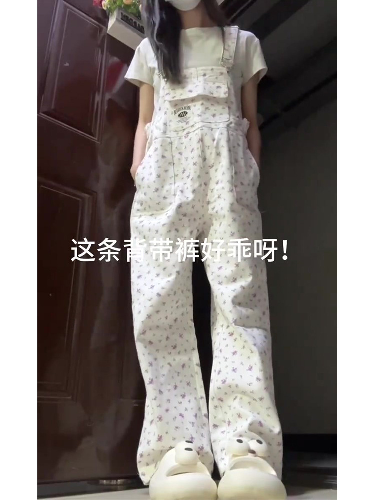 大码韩系白色碎花牛仔背带裤女春秋2024新款宽松阔腿连体牛仔裤