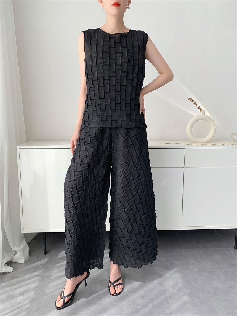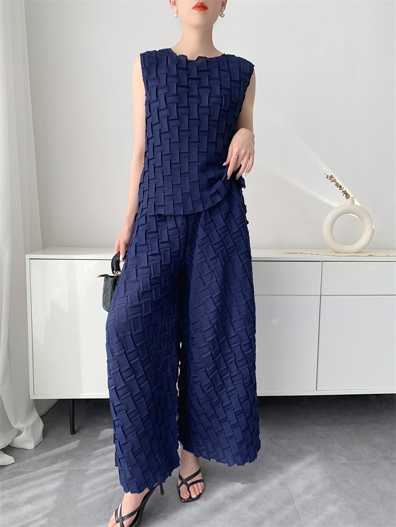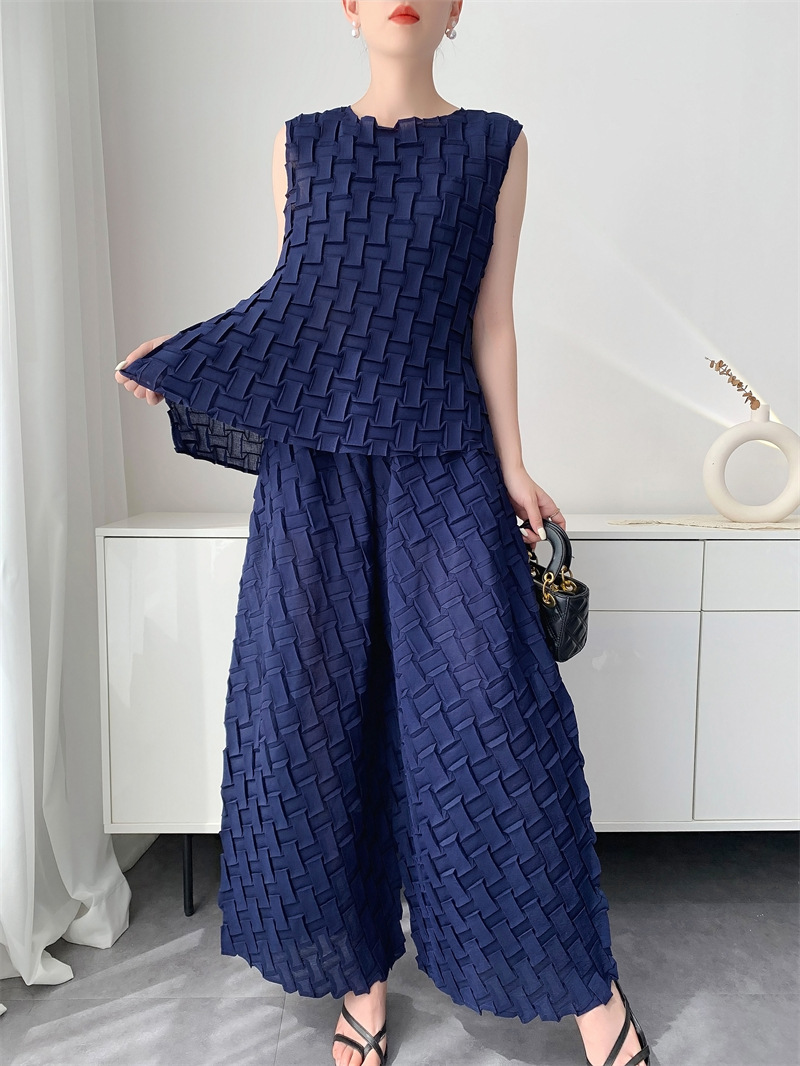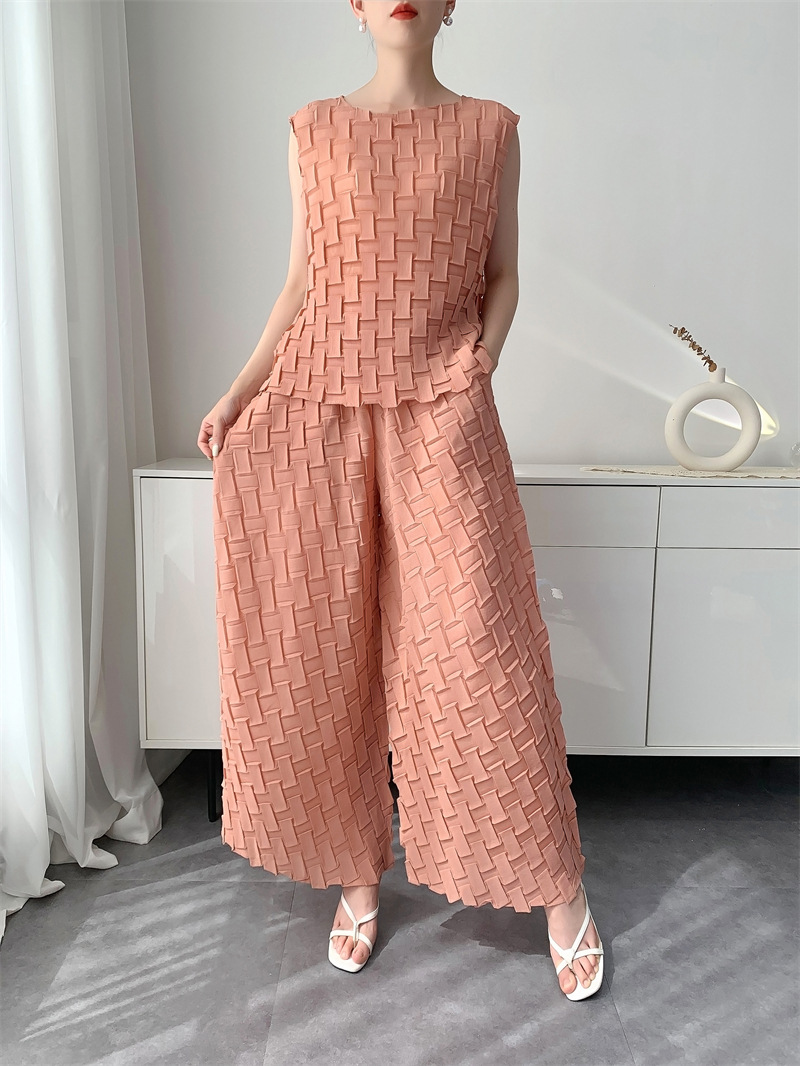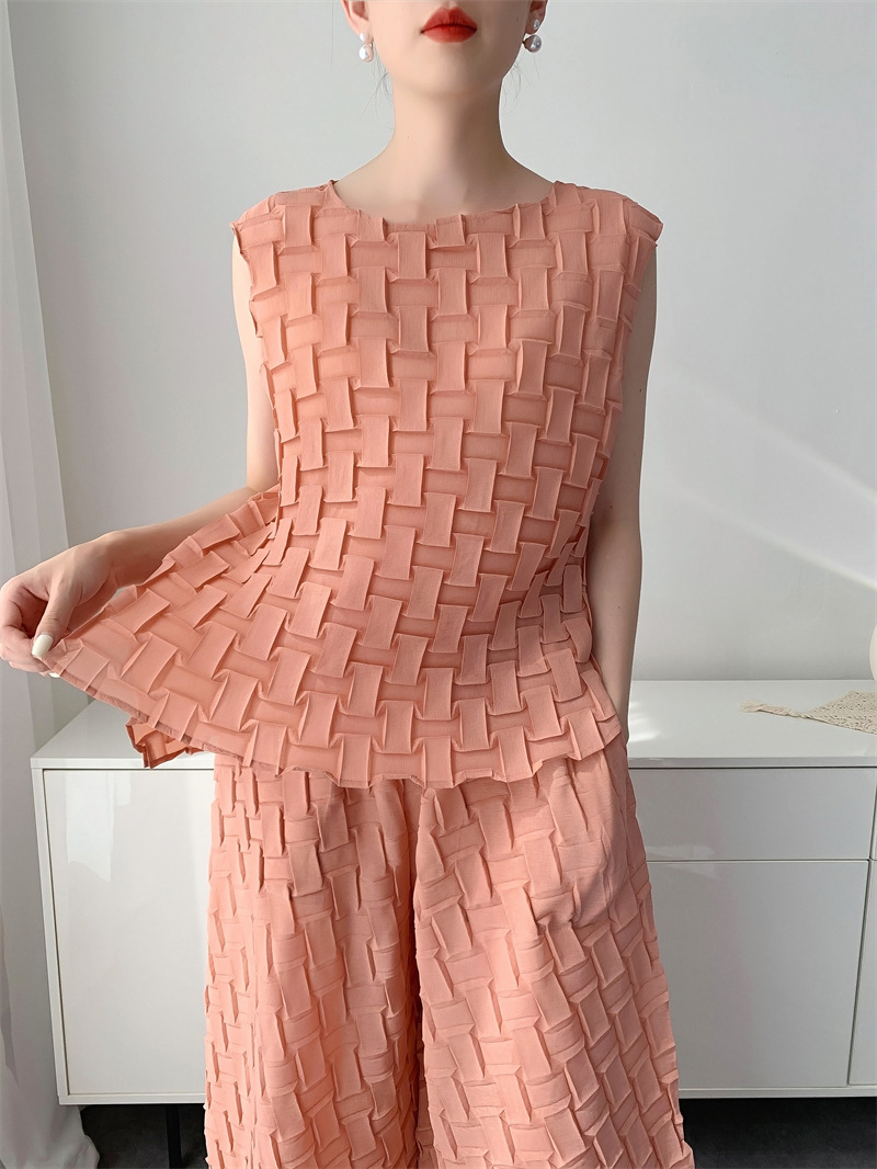 Miyake 스타일 수제 주름 세트 여성 여름 새로운 탑 호른 바지 편안한 캐주얼 디자인 센스 틈새스토어 가기