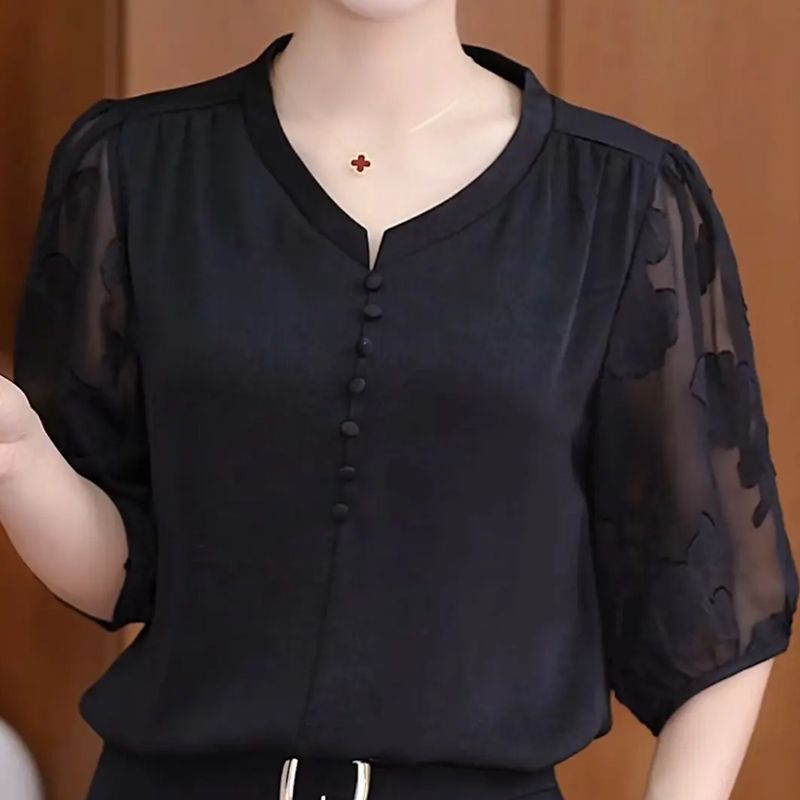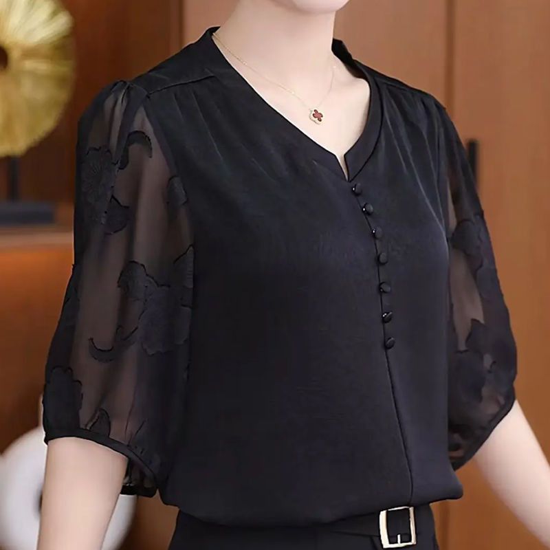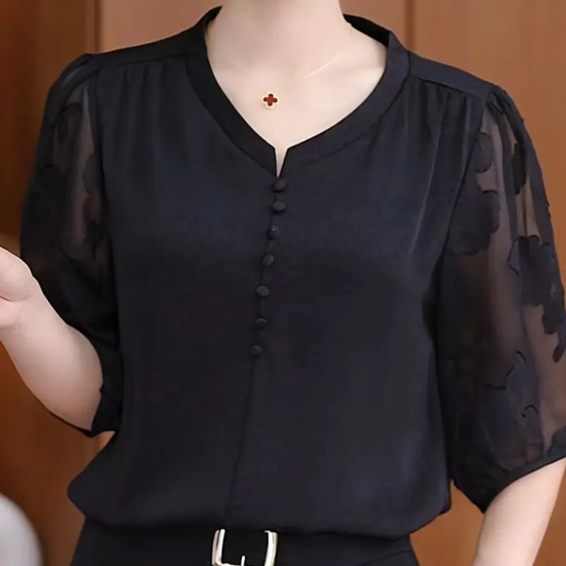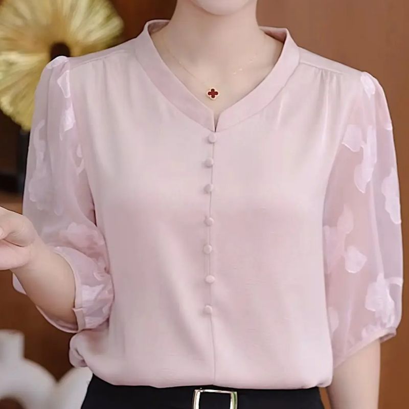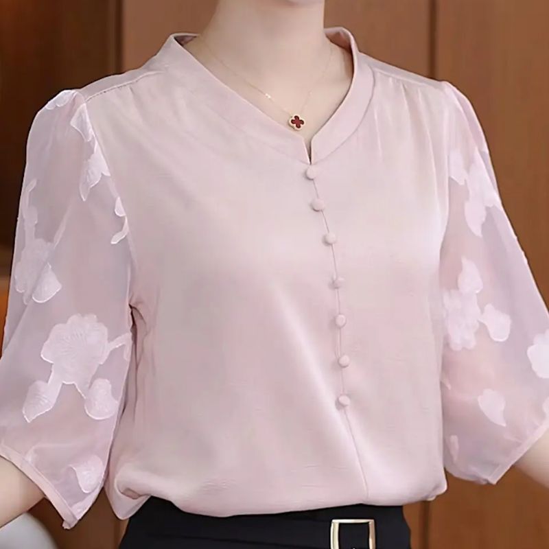 여름 여성을 위한 우아하고 패셔너블하며 가벼운 럭셔리 스타일 디자인 쉬폰 셔츠, 새로운 스타일, 다재다능하고 슬림하며 연령을 줄여주는 서양식 캐주얼 탑스토어 가기