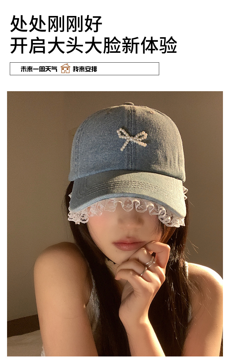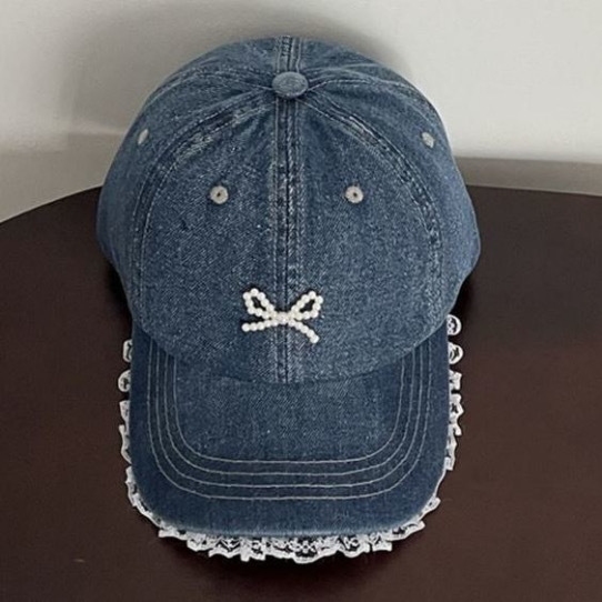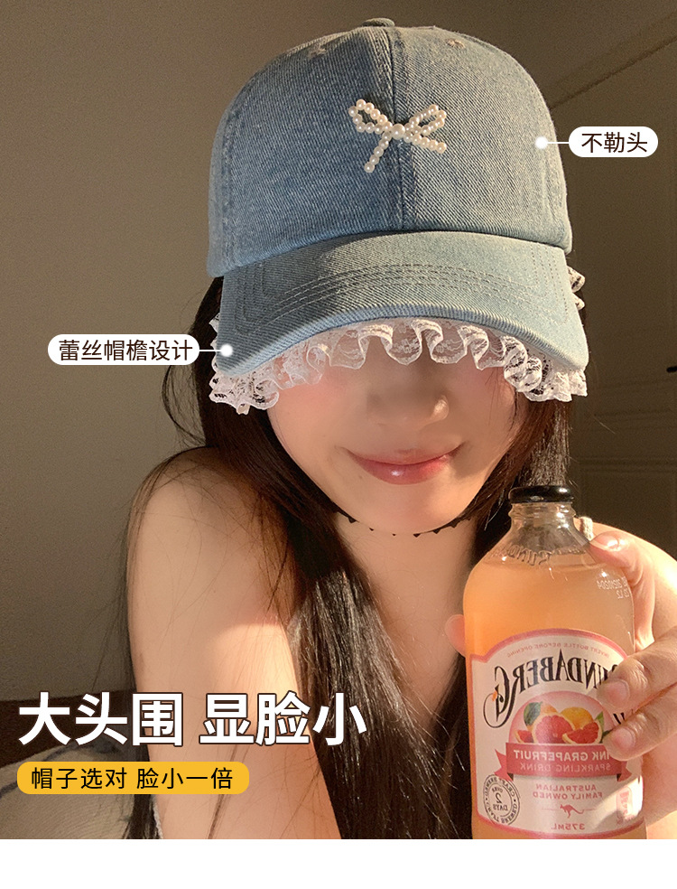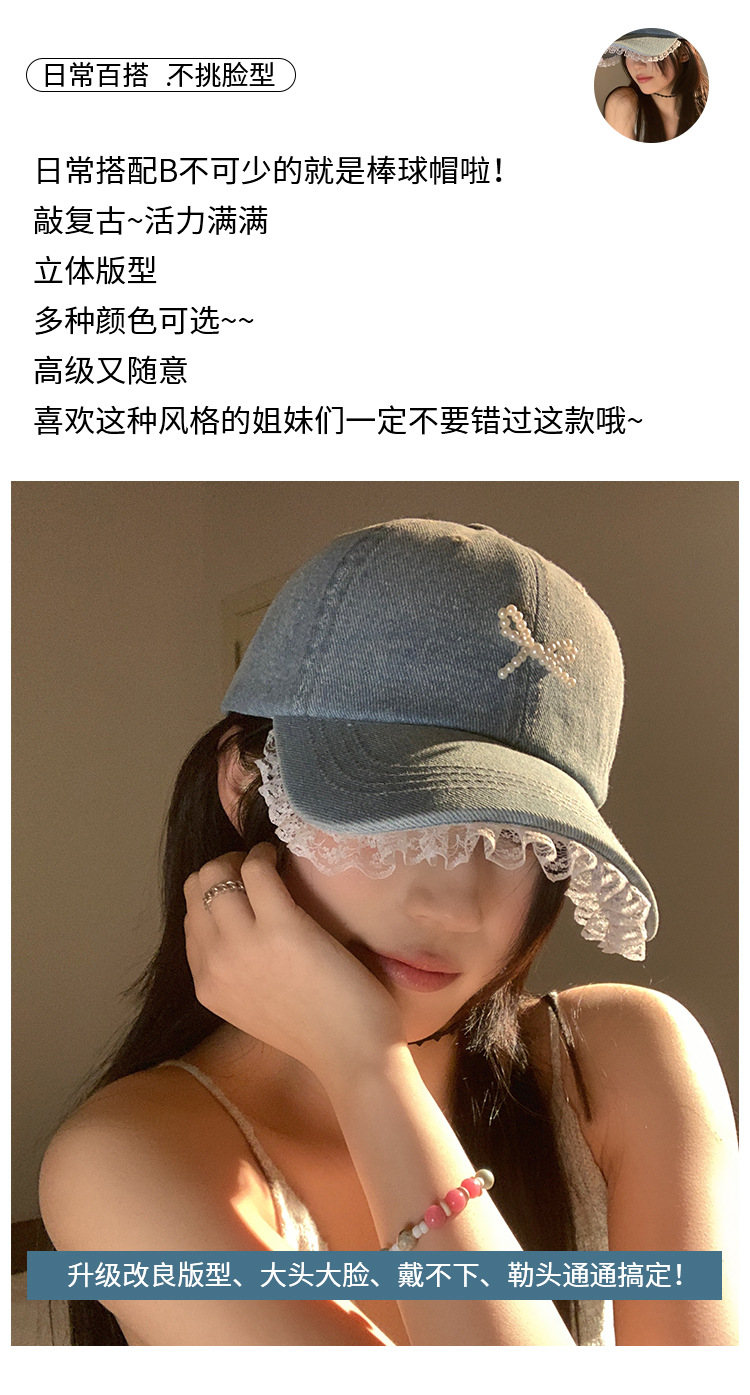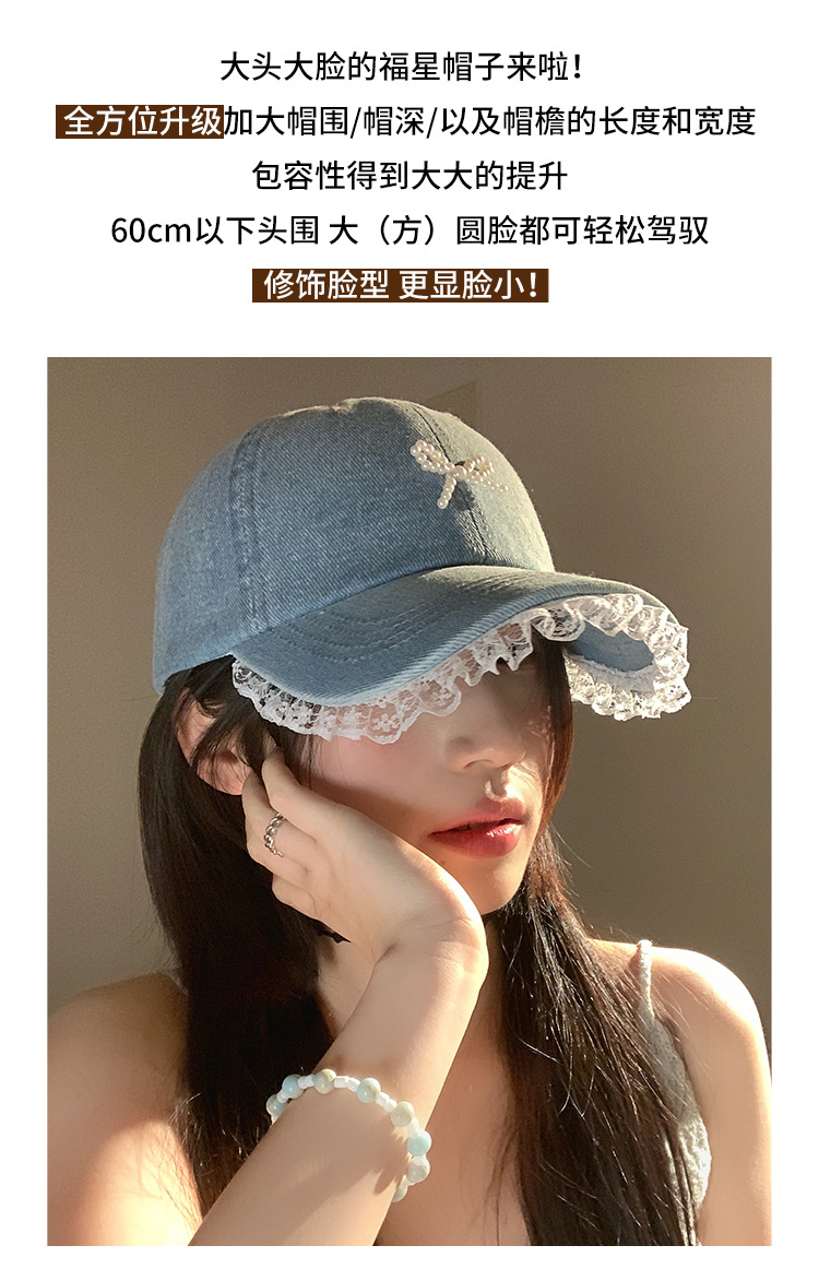 머리둘레가 큰 여성용 한국식 레이스 데님 야구모자, 얼굴이 보이는 작은 챙모자, 입체적인 진주 리본모자스토어 가기