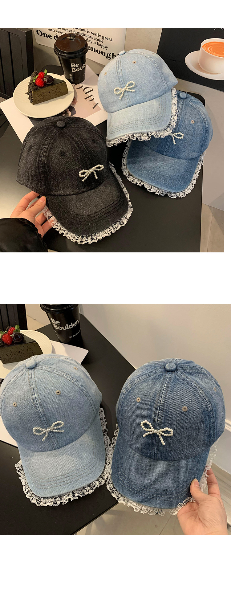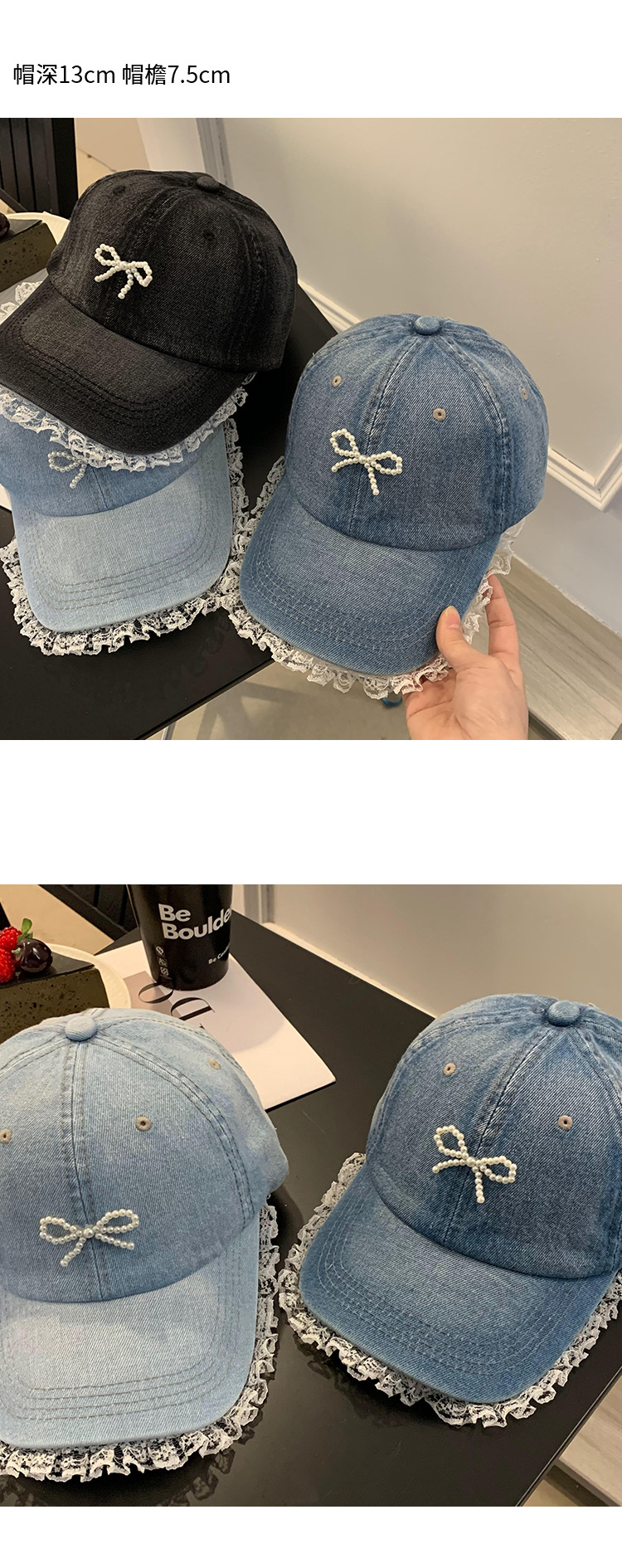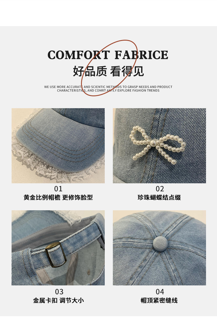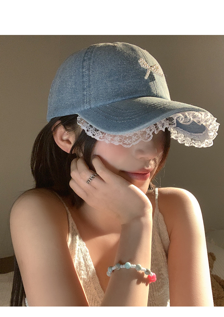 머리둘레가 큰 여성용 한국식 레이스 데님 야구모자, 얼굴이 보이는 작은 챙모자, 입체적인 진주 리본모자스토어 가기