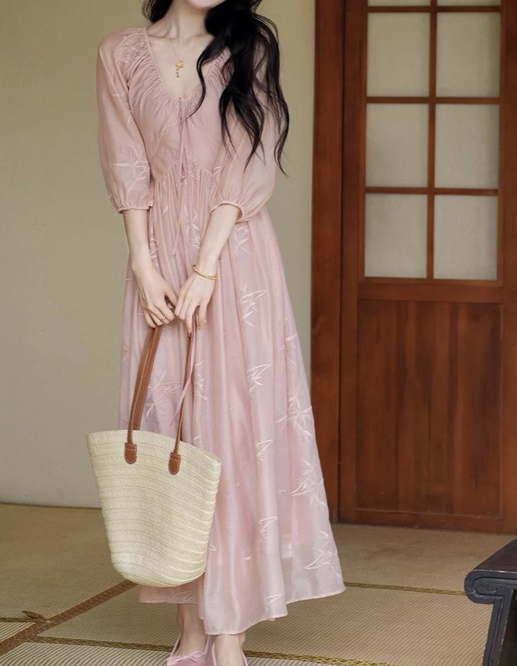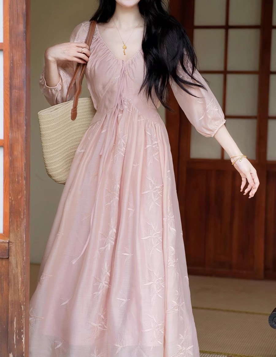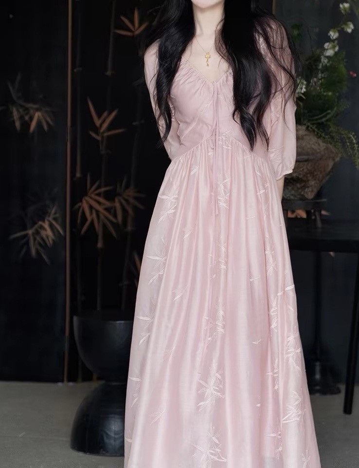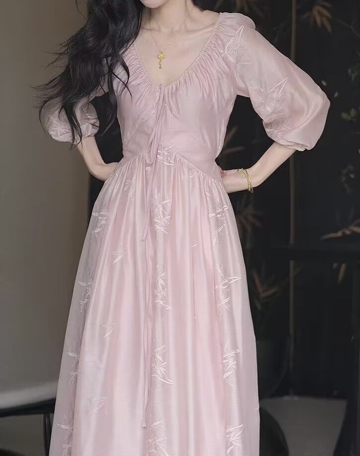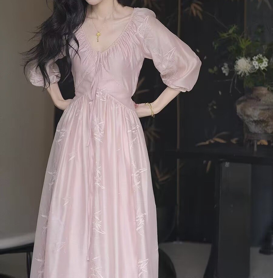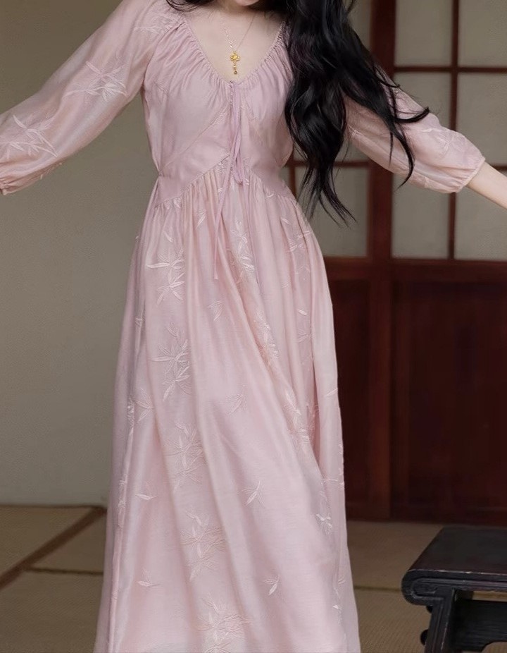 [재고 있음] TYNAG [Bamboo Style] 새로운 중국 스타일 허리 핑크 v 넥 자수 드레스 여성 여름 새 스타일
